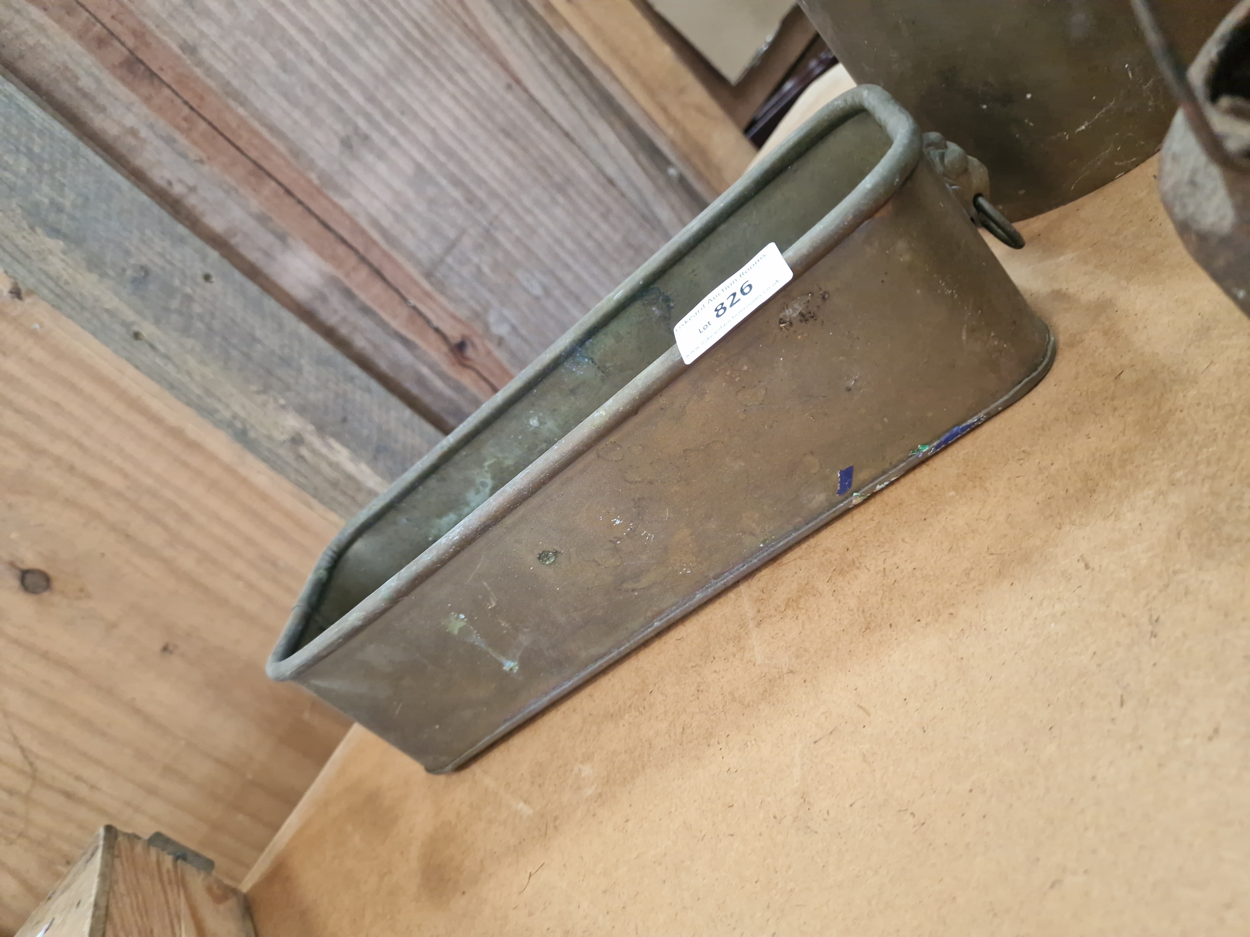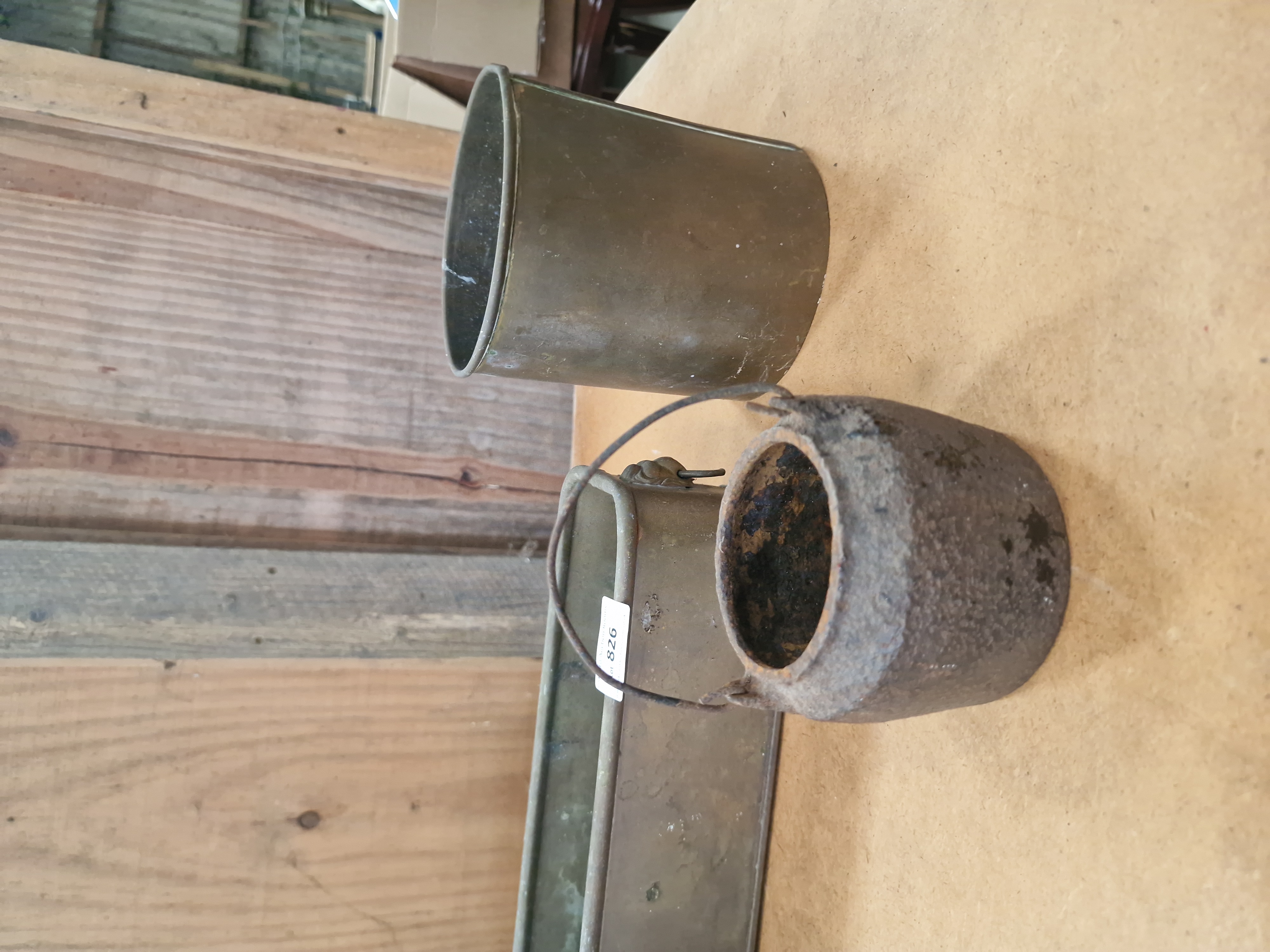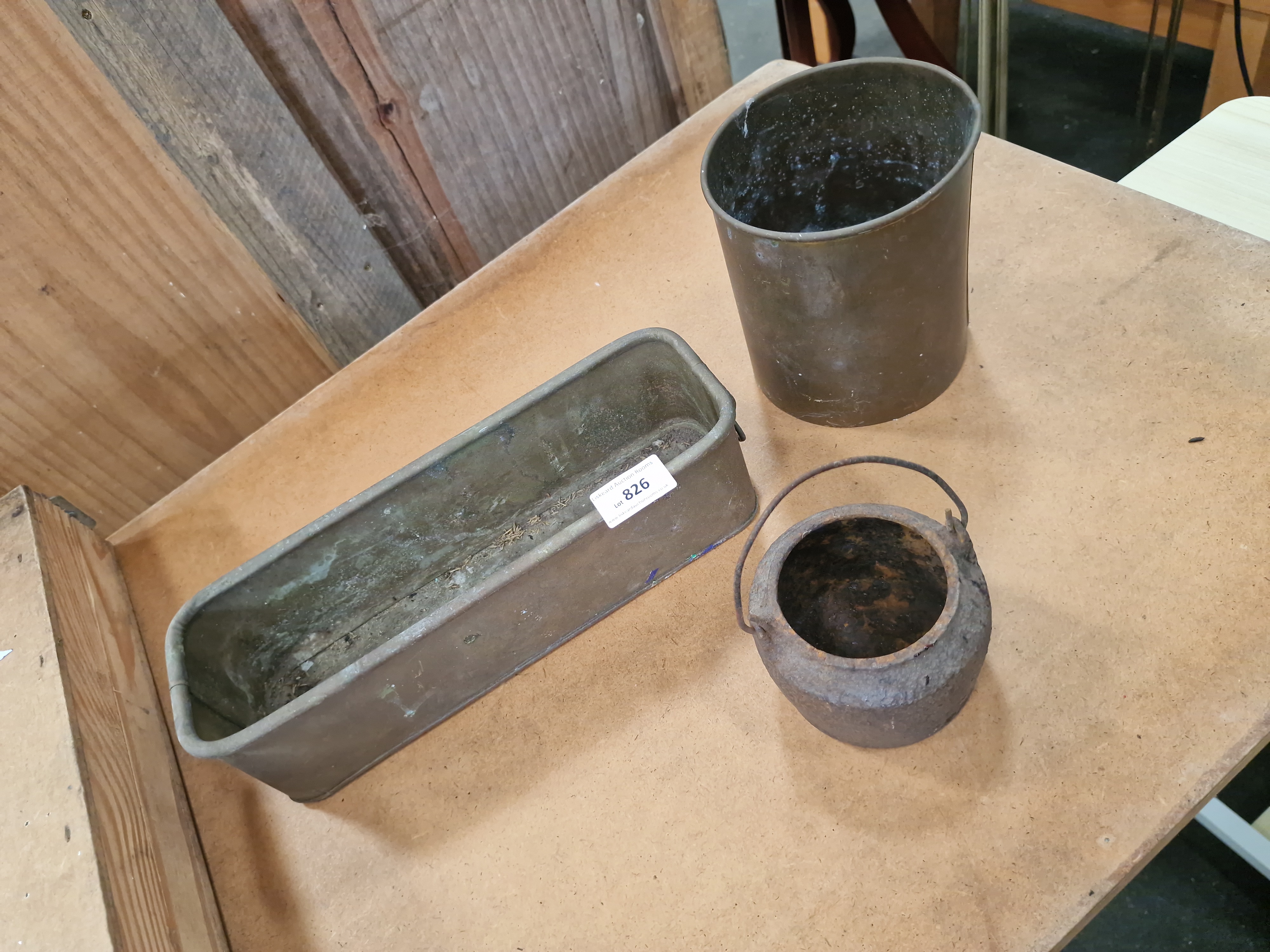A trio of utilitarian metal vessels comprising a rectangular trough, a cylindrical bucket, and a cast iron pot. The rectangular trough is formed from copper alloy sheet metal with a rolled rim and rounded ends. The cylindrical bucket is also of copper alloy sheet metal construction, with a form resembling a repurposed military shell casing or ammunition canister. The small globular pot is of cast iron construction and features a wire bail handle. No maker’s marks or stamps are visible on any of the three items.
