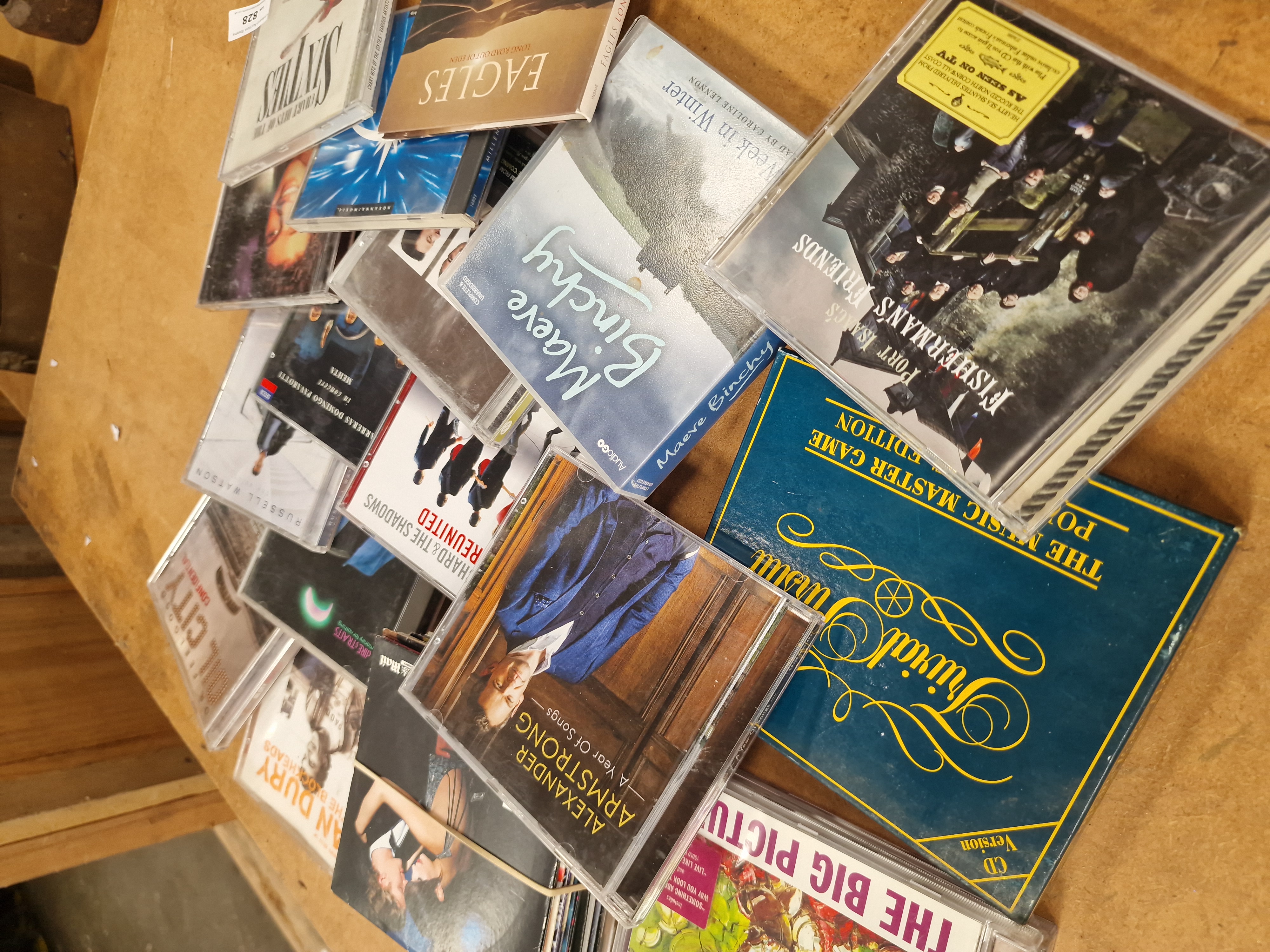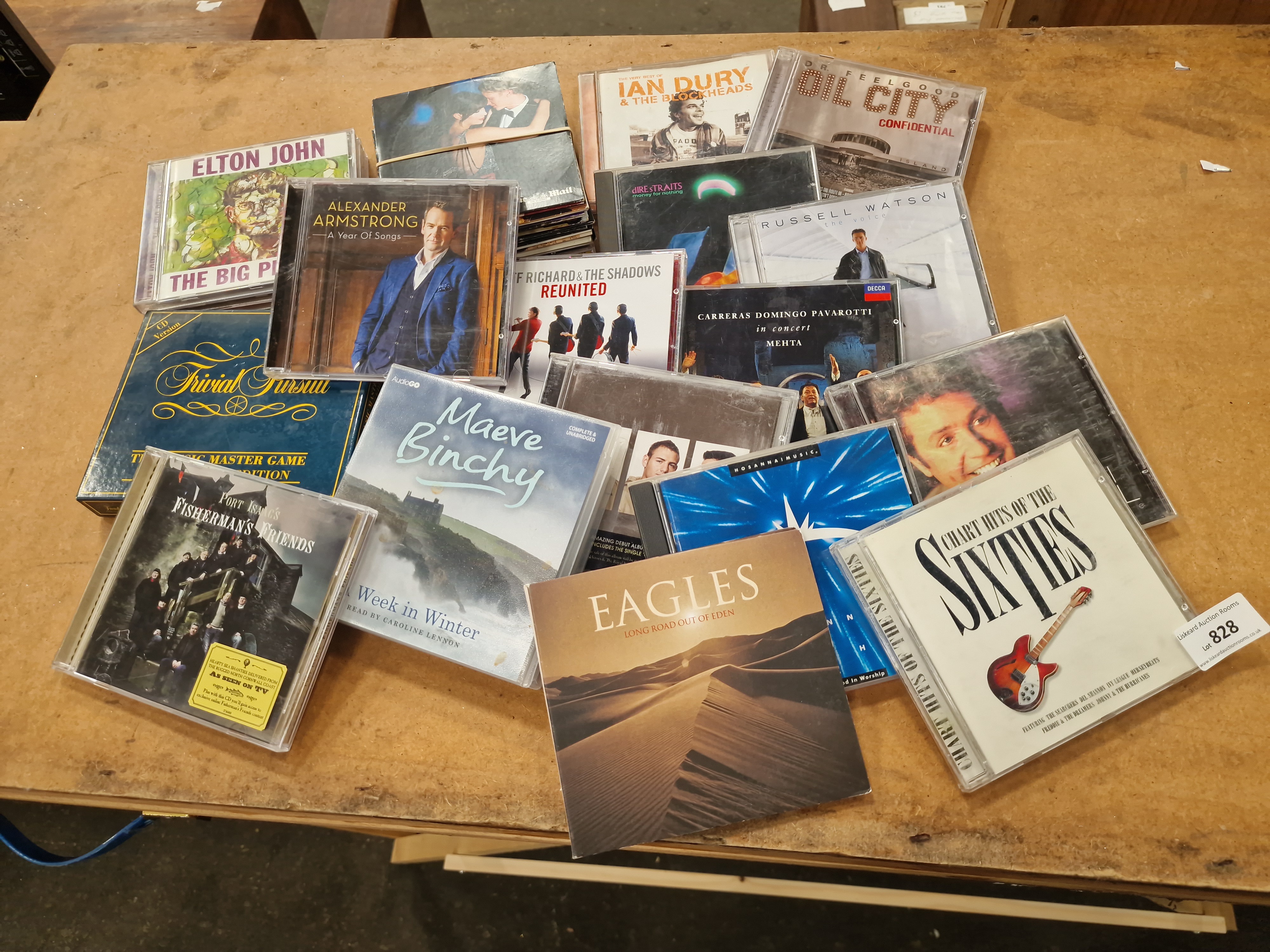 A collection of assorted compact discs and a CD-based board game. The music selection features various artists and genres, including Elton John (The Big Picture), Alexander Armstrong (A Year Of Songs), Cliff Richard & The Shadows (Reunited), Ian Dury & The Blockheads (The Very Best Of), Dr. Feelgood (Oil City Confidential), Russell Watson (The Voice), The Eagles (Long Road Out of Eden), and Port Isaac’s Fisherman’s Friends. Classical and compilation titles include Carreras Domingo Pavarotti in concert on the Decca label, Chart Hits of the Sixties, and a Dire Straits disc. Spoken word content is represented by a Maeve Binchy audiobook, A Week in Winter, produced by AudioGO. The lot also contains a boxed Trivial Pursuit: The Music Master Game Edition (CD version). The items are predominantly housed in standard plastic jewel cases and cardboard sleeves. A Liskeard Auction Rooms lot tag for lot 828 is attached to one item.
