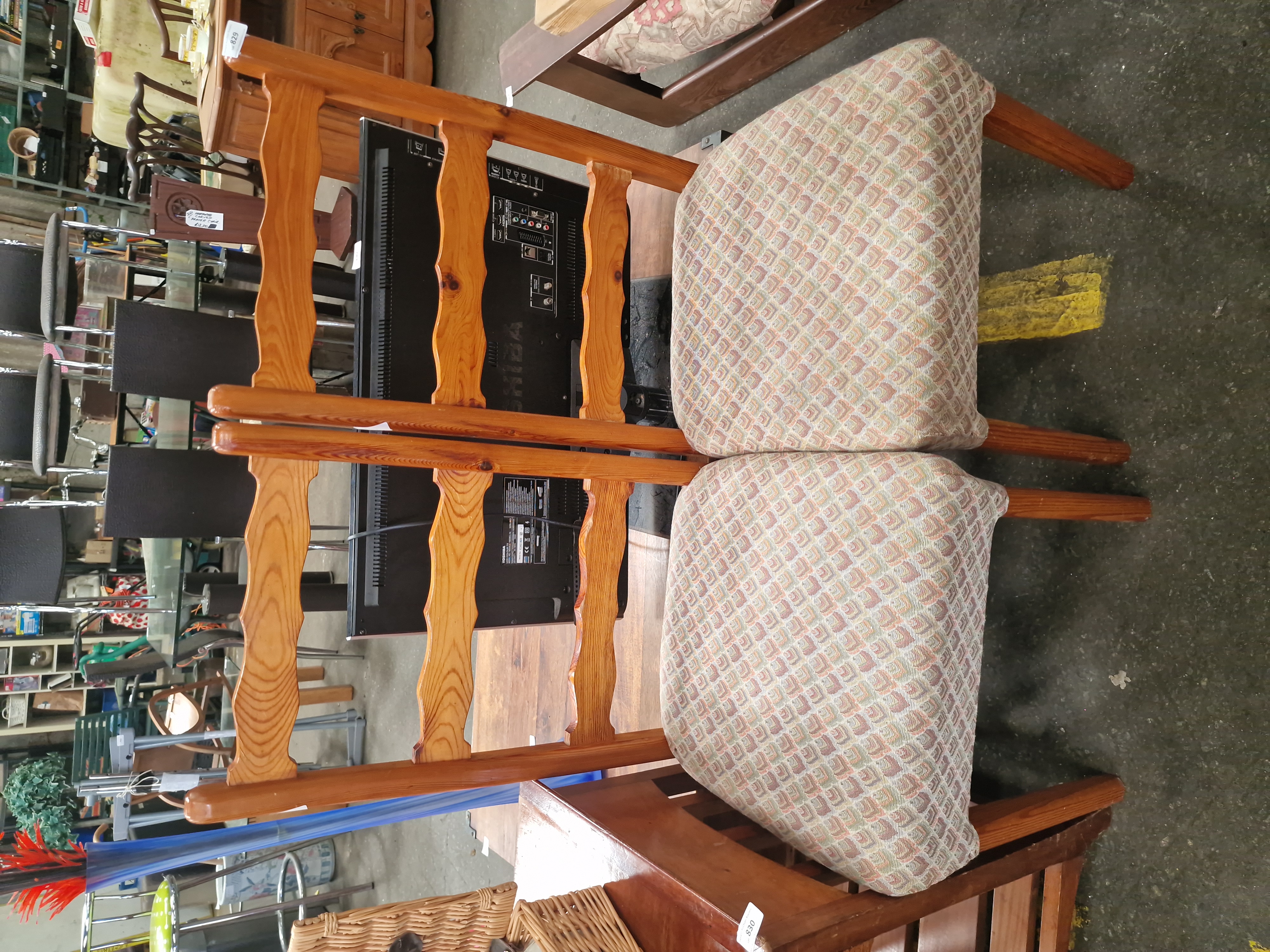 A pair of country-style dining side chairs dating from the late 20th century. Each chair is constructed from stained pine, displaying prominent grain and natural knots throughout the frame. The design features a ladder-back consisting of a scalloped top rail above three matching wavy-edged horizontal splats. The fixed, padded seats are upholstered in a multi-coloured tapestry-style fabric with a repeating geometric pattern in shades of green, brown, and terracotta. No maker’s marks, stamps, or labels are visible on the frames or upholstery. A small white adhesive lot tag numbered 829 is present on the top rail of one chair.