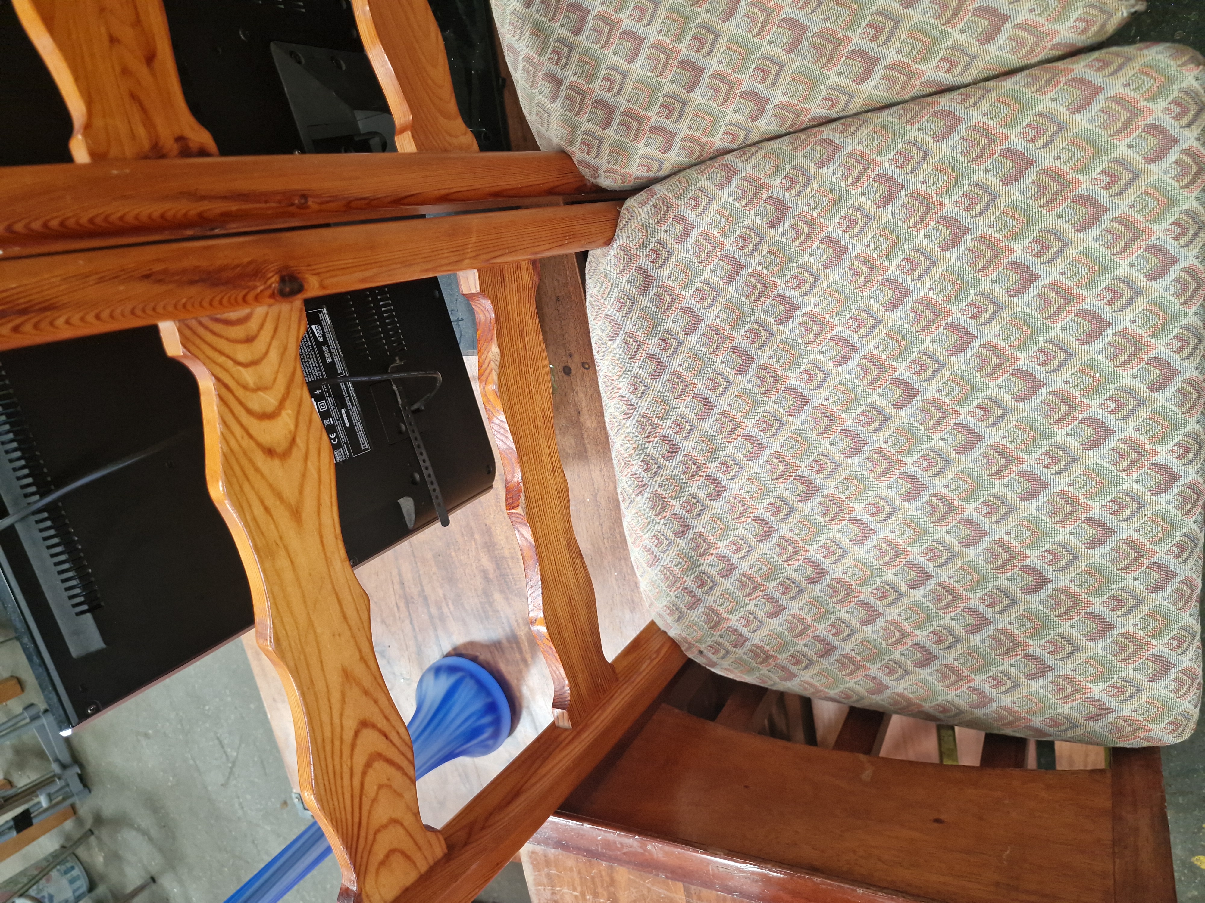 The chairs exhibit signs of general wear consistent with age and use, including scattered surface scuffs, nicks, and scratches to the wood finish. The upholstery appears intact with no significant staining or tears visible.
