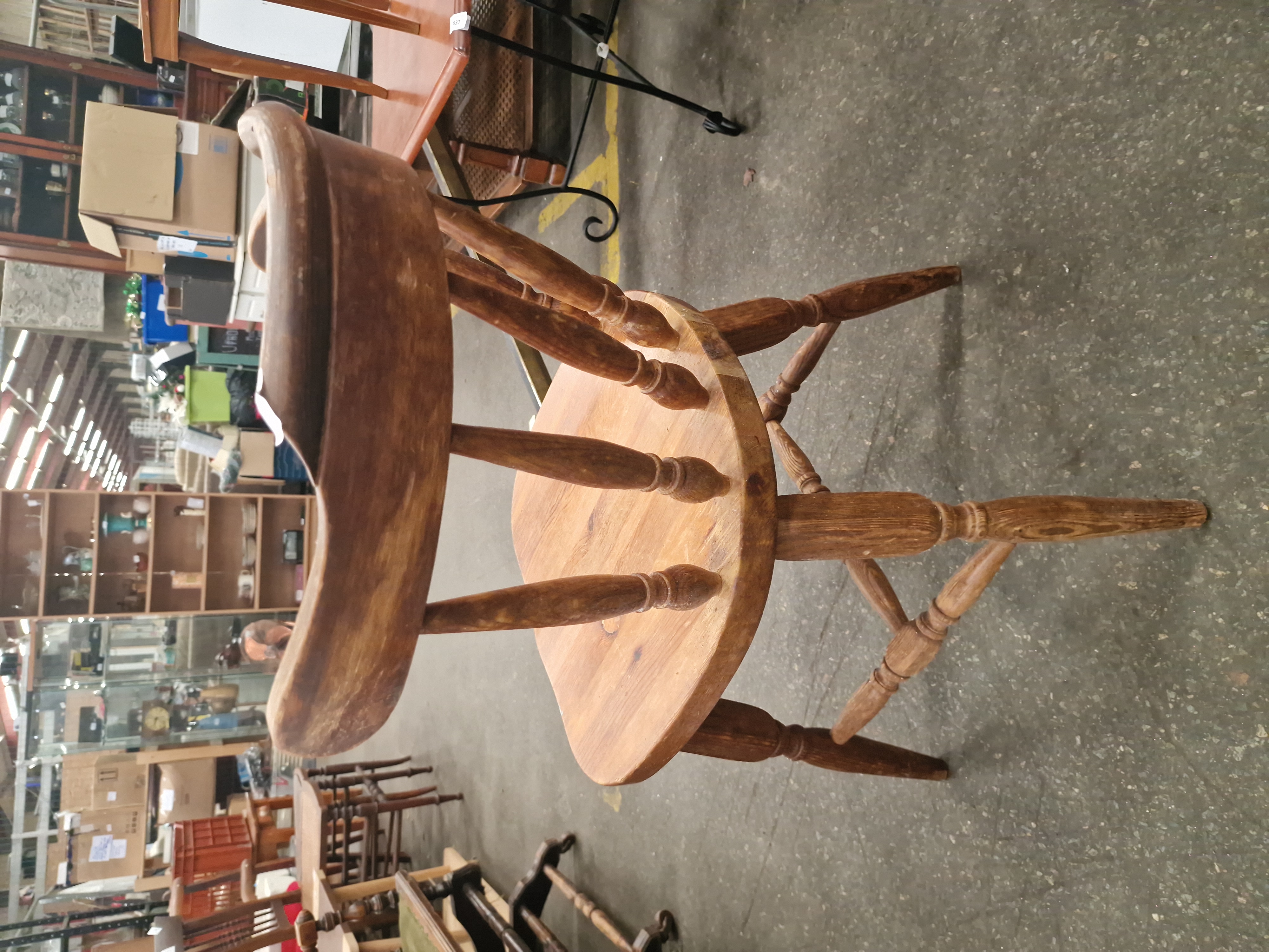 This armchair is a 20th-century example of the Smoker’s Bow or Captain’s chair style, constructed from stained pine. The design features a broad, horseshoe-shaped crest rail supported by seven turned spindles. The solid, shaped saddle seat is mounted on four turned legs, which are reinforced by a traditional H-frame stretcher. The construction utilizes spindle-and-socket joinery. No manufacturer marks, stamps, or inscriptions are visible on the frame. Two paper labels are adhered to the crest rail: one printed inventory label bearing the number 835 and a second handwritten label reading Item 162 £10.
