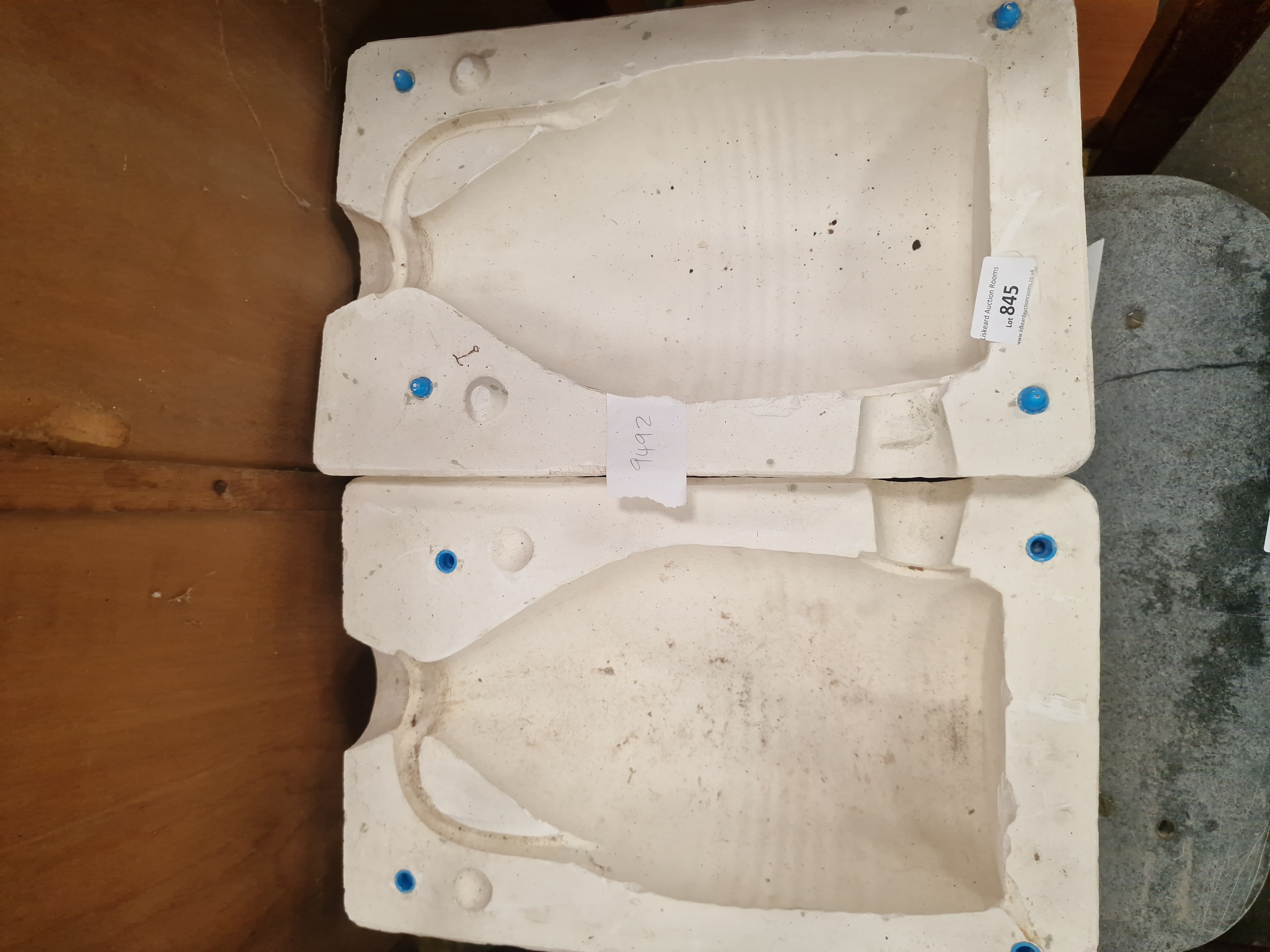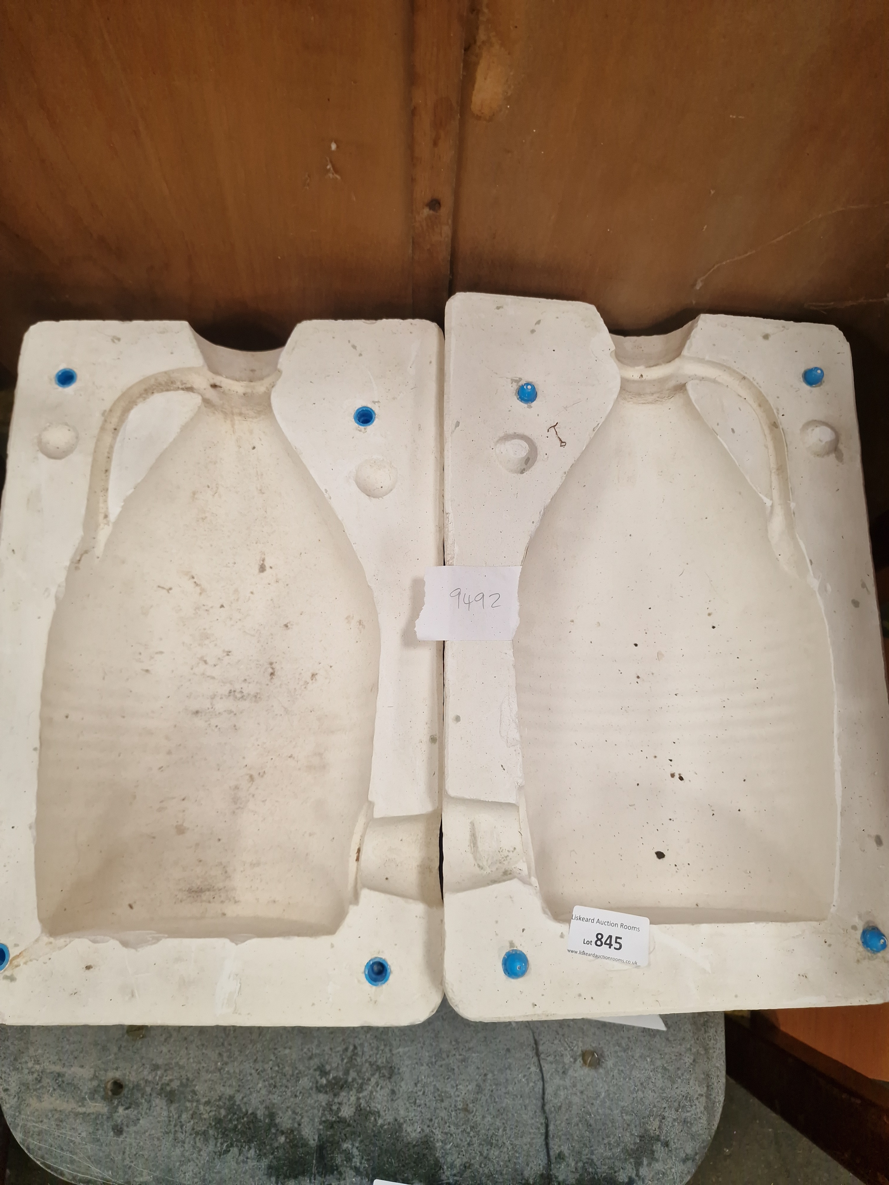 A two-piece industrial plaster slip-casting mould designed for the production of ceramic vessels. The mould is constructed from a porous white plaster material and features blue plastic registration pins at the corners to ensure correct alignment of the halves. The internal negative space suggests a bulbous-bodied vessel with a distinct neck and pouring spout. One section bears a small, handwritten paper tag with the number 9492 and an auction house label for Liskeard Auction Rooms designating it as Lot 845.