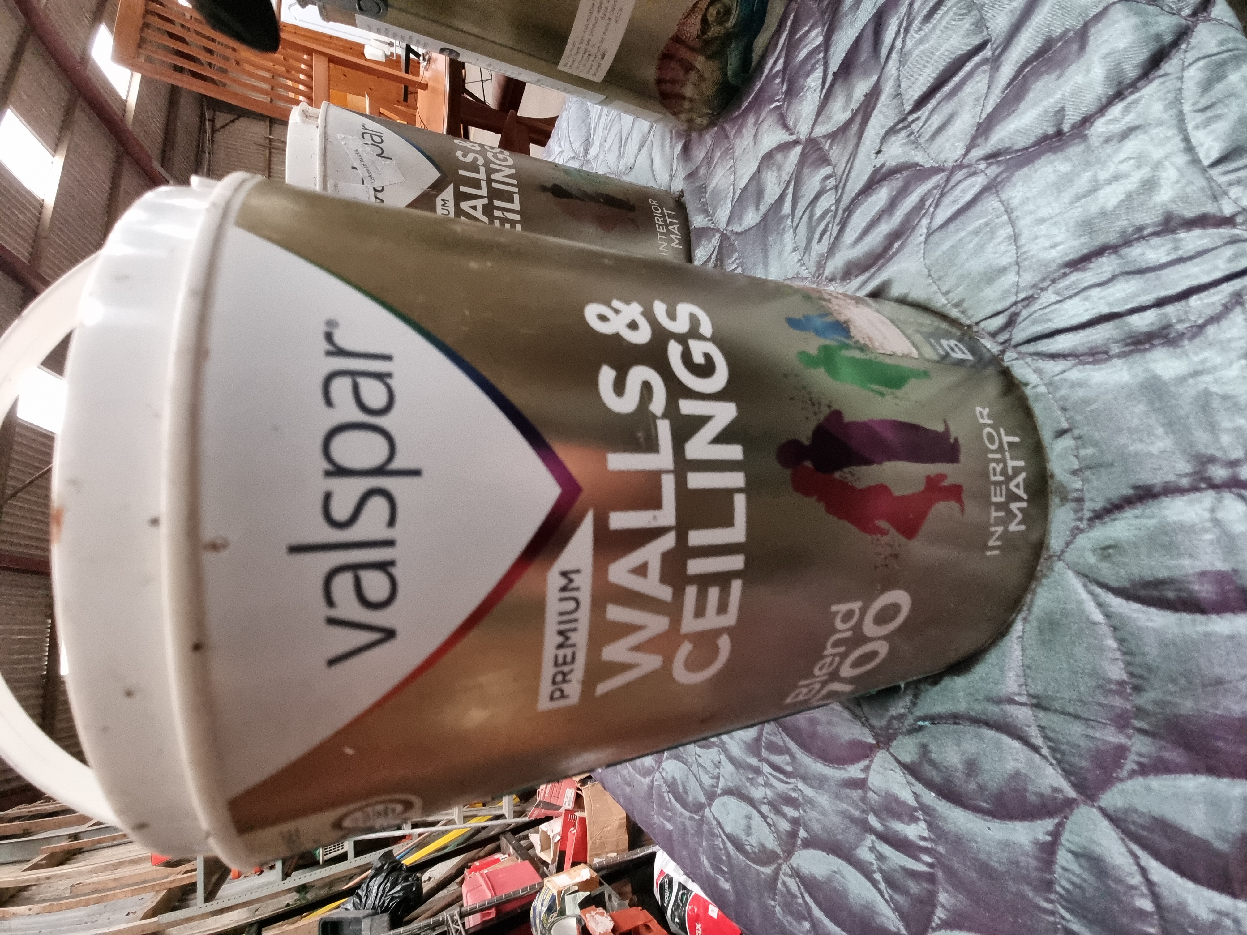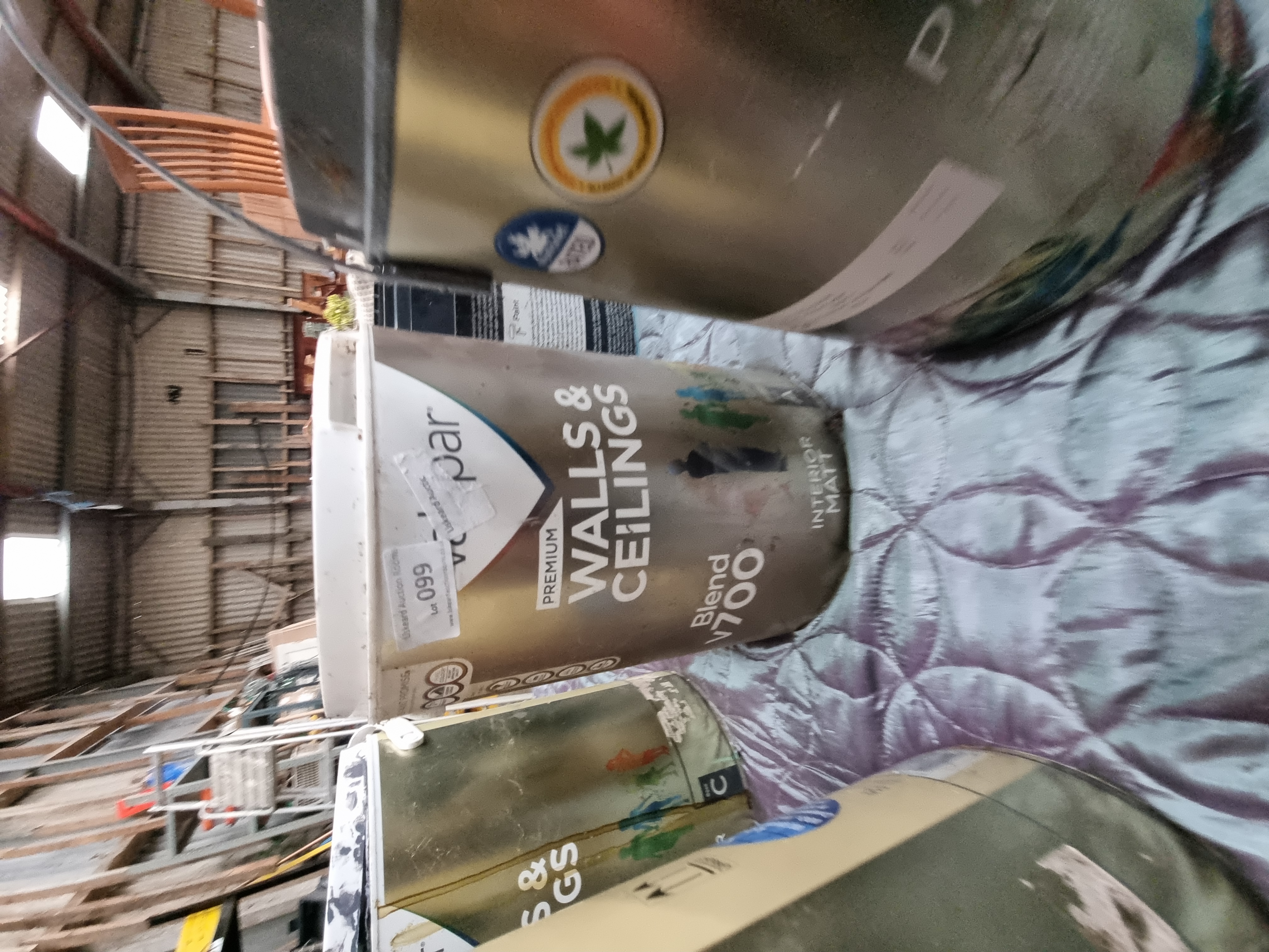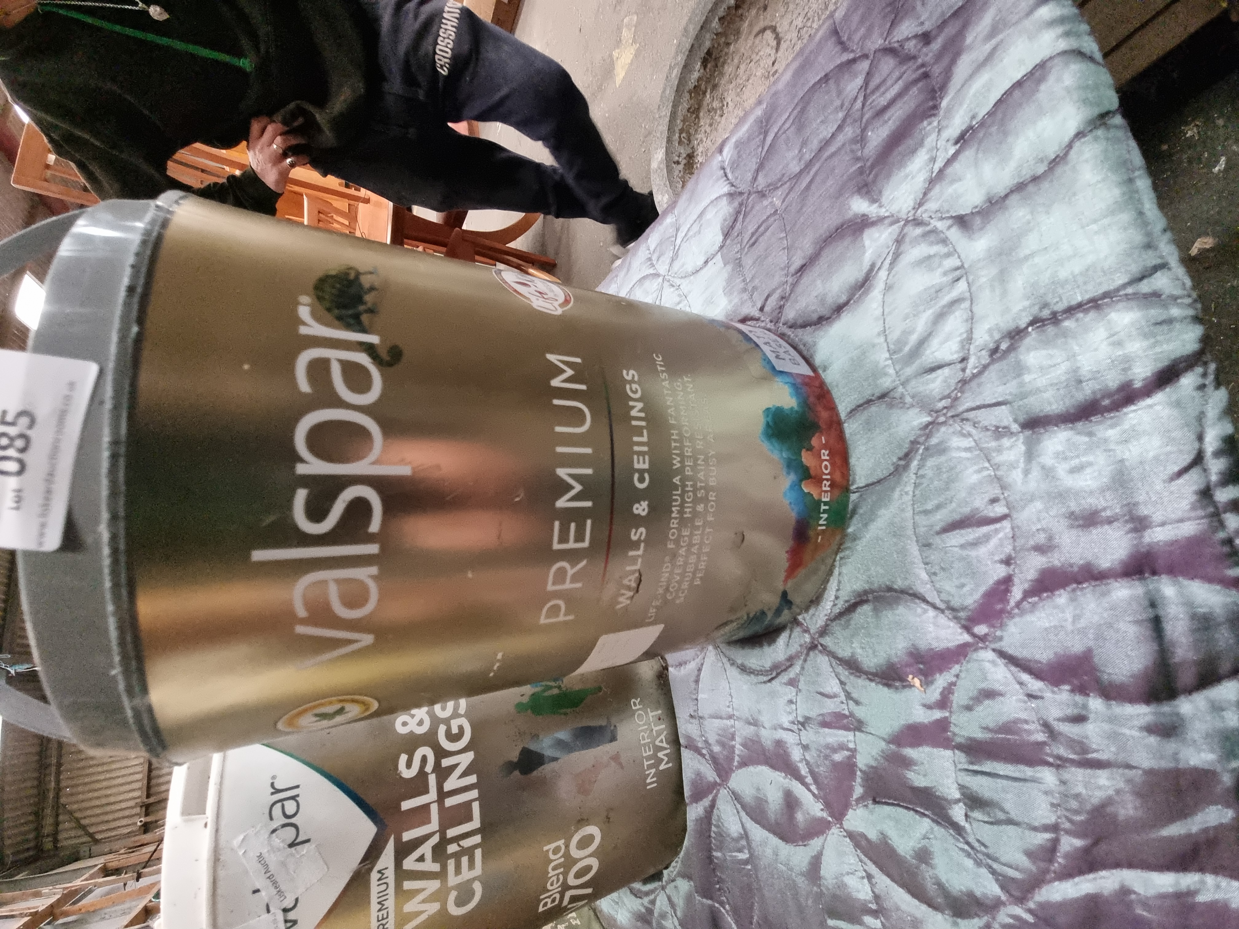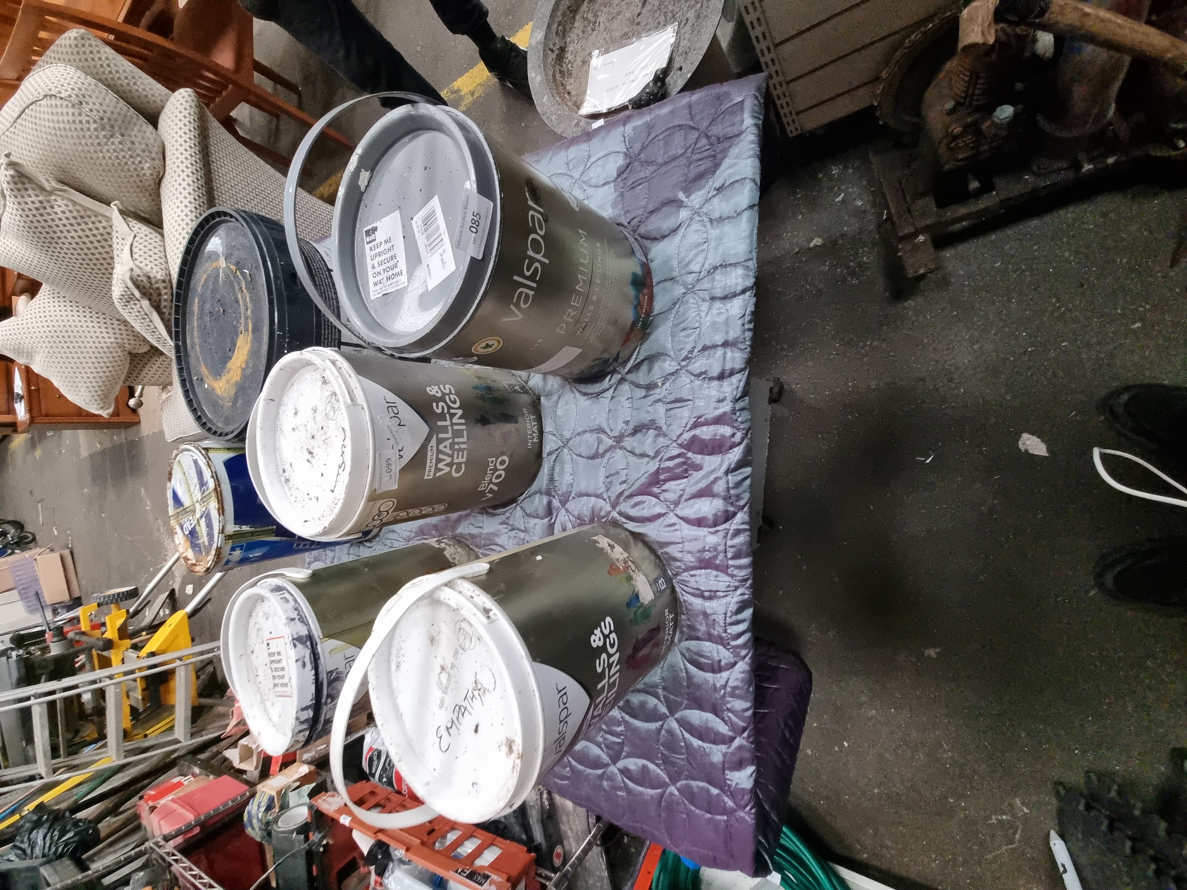 A group of large tins of interior paint, primarily from the manufacturer Valspar. The collection includes Valspar Premium Walls & Ceilings and Blend v700 Interior Matt varieties. These items are presented as a loose group, appearing to be liquidation stock or customer returns. Several tins feature retail and transport labels, including a B&Q transport sticker and auction house labels from Liskeard Auction Rooms with lot numbers 085 and 099. The tins are constructed from metal and plastic. One lid bears the handwritten notation EMPATHY. The paint is intended for interior use on walls and ceilings, with some tins marked as having a matt finish.