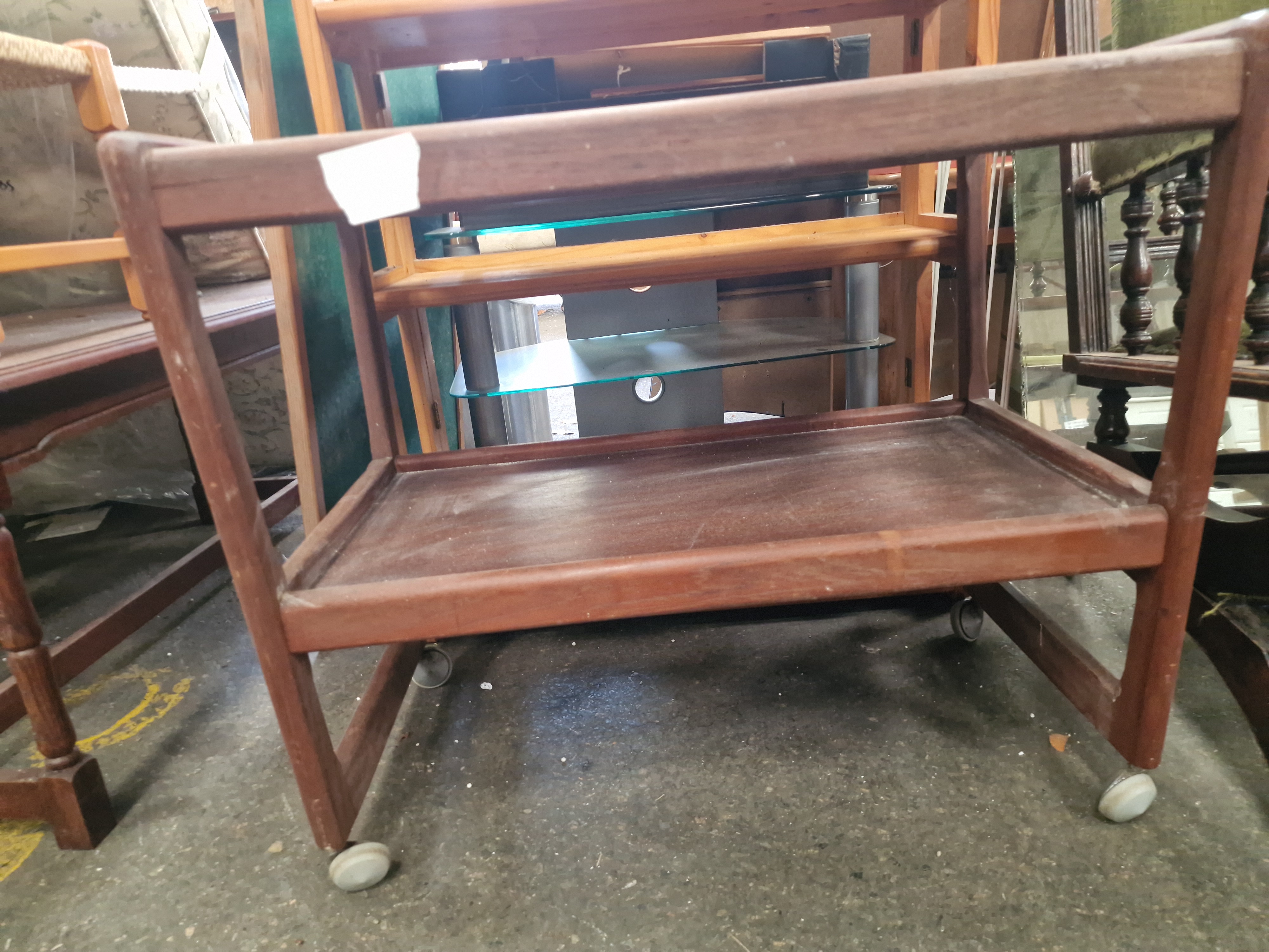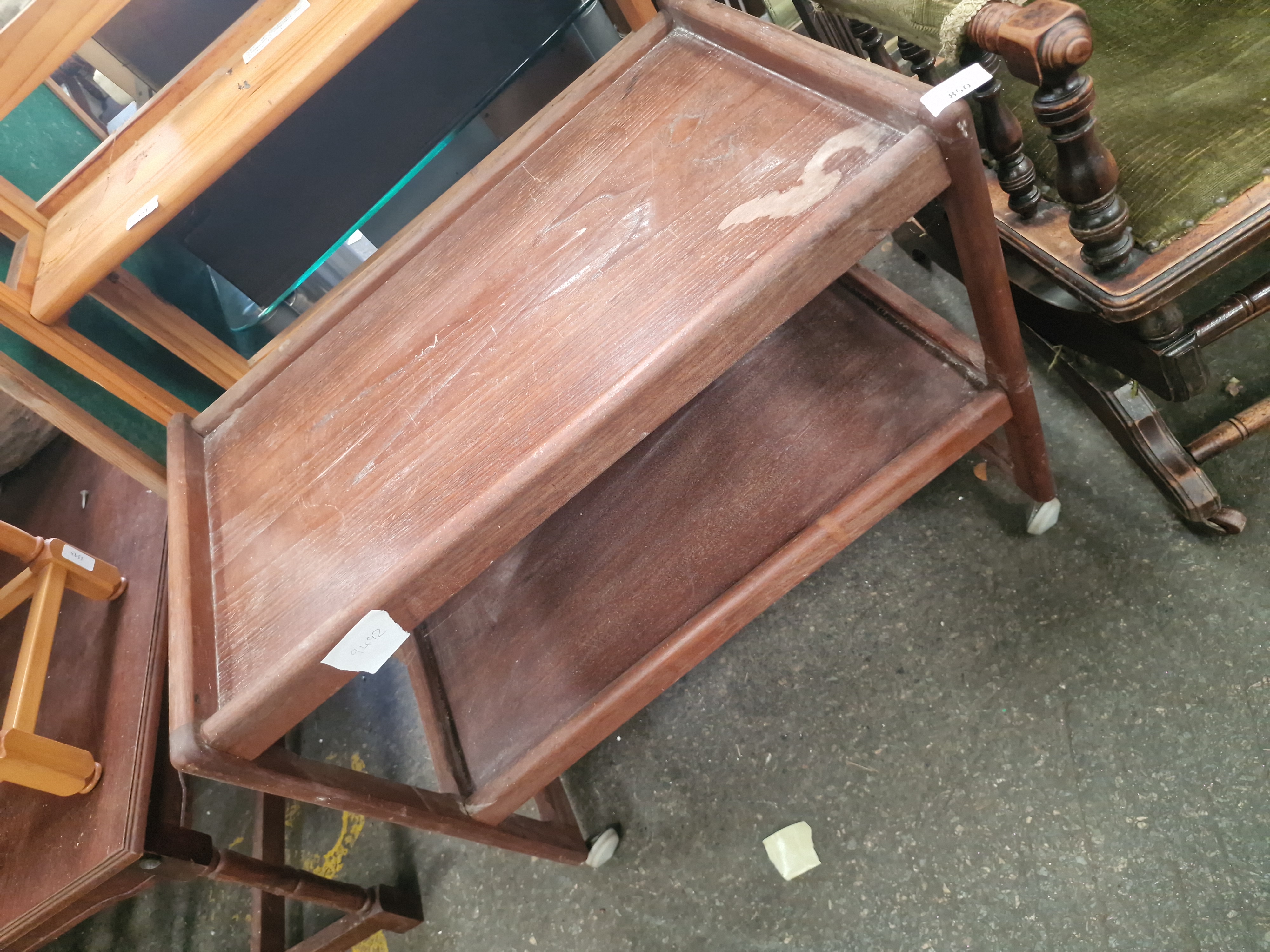 A mid-century modern teak two-tier tea trolley or serving cart, dating to the 1960s or 1970s. The piece is constructed from teak and teak veneers, featuring two rectangular tiers with raised, lipped edges to the long sides. The tiers are integrated into a simple rectangular frame. The trolley is supported by four white plastic ball castors. While the design is characteristic of manufacturers such as Arrebo Mobler or Parker, no maker marks or labels are present. The item currently bears a Liskeard Auction Rooms lot tag for Lot 850 and a handwritten sticker numbered 9492.