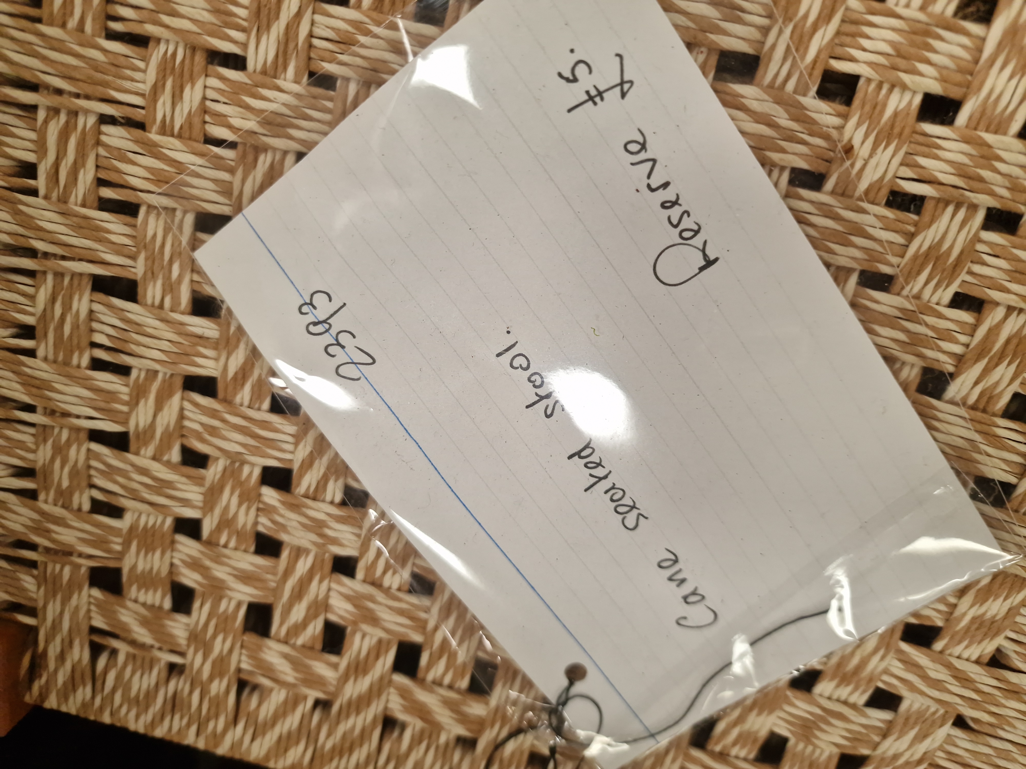A 20th-century vernacular footstool of rectangular form, constructed from hardwood with a honey-coloured finish. The seat is inset with a basketweave pattern of light-brown twisted fibre cord, in the style of Danish cord. The stool features four turned legs with square block tops and chamfered edges, connected by simple rectangular stretchers using mortise and tenon joinery. The item carries a handwritten tag describing it as a cane seated stool and a lot tag for Stroud Auction Rooms, Lot 852. No maker’s marks or stamps are visible on the frame.