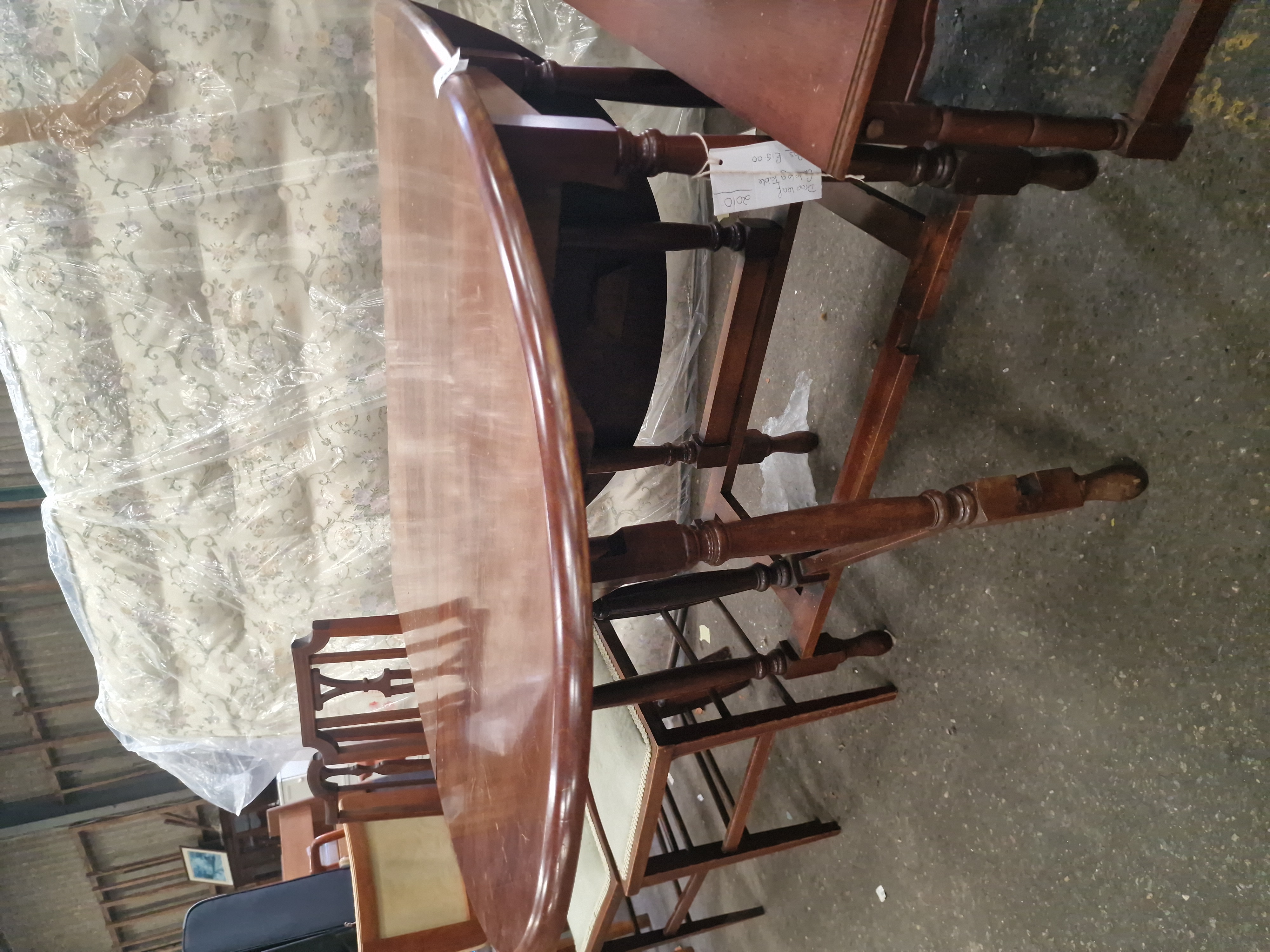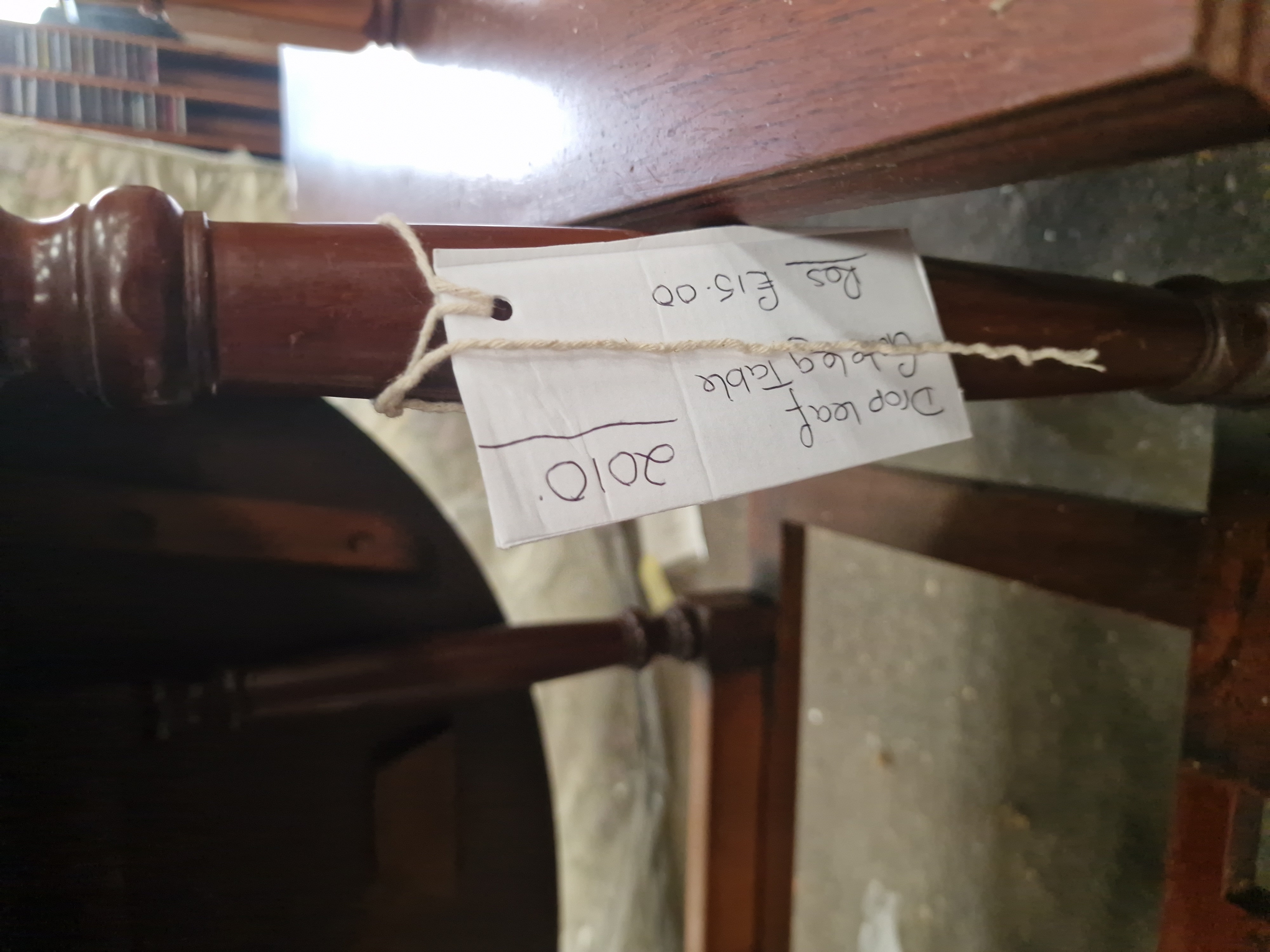 A reproduction gateleg drop-leaf table constructed in the 17th-century style, likely dating from the late 19th or early 20th century. The table is fashioned from a medium-toned hardwood with a polished finish. The top is oval when fully extended, comprising a narrow fixed centre section and two semi-circular drop leaves. The base features six turned baluster-form legs joined by peripheral stretchers. Two of the legs are hinged on a gateleg mechanism to provide support for the leaves when raised. No permanent maker’s marks or stamps are present. The item currently bears temporary auction labels, including a rectangular sticker for Liskeard Auction Rooms (Lot 854) and a handwritten tag.