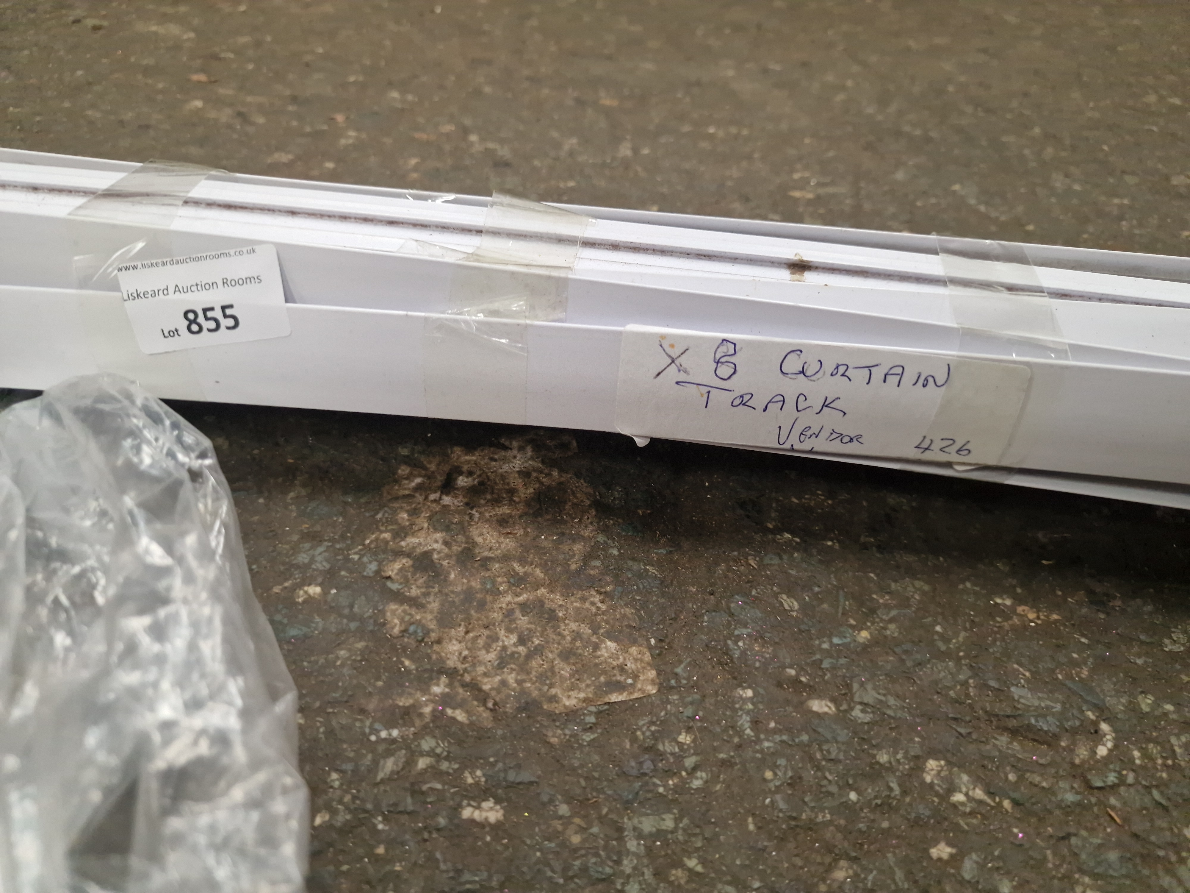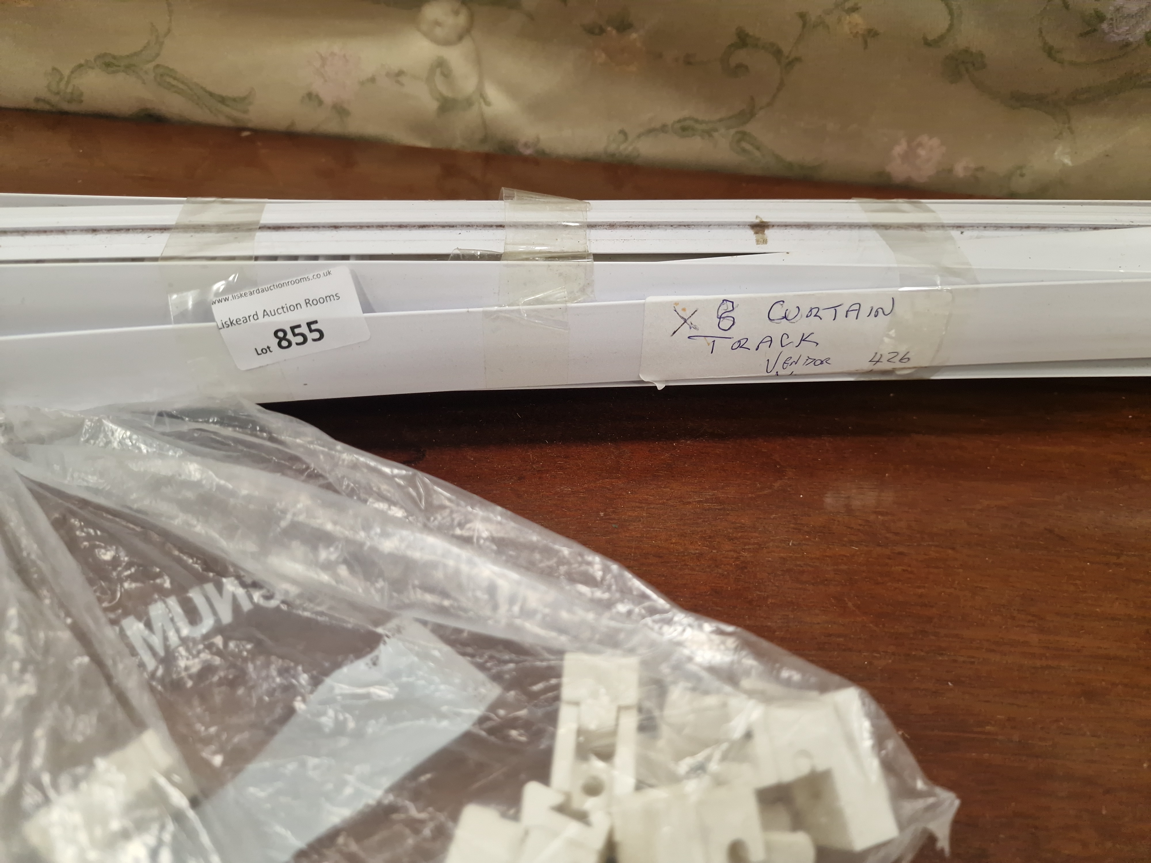 A group of eight modern curtain tracks featuring a white-painted finish. The tracks are accompanied by a plastic bag containing an assortment of plastic gliders, end caps, and mounting brackets. The items bear a printed auction lot label for Liskeard Auction Rooms, lot number 855, and a handwritten label stating X 8 CURTAIN TRACK VENDOR 426.