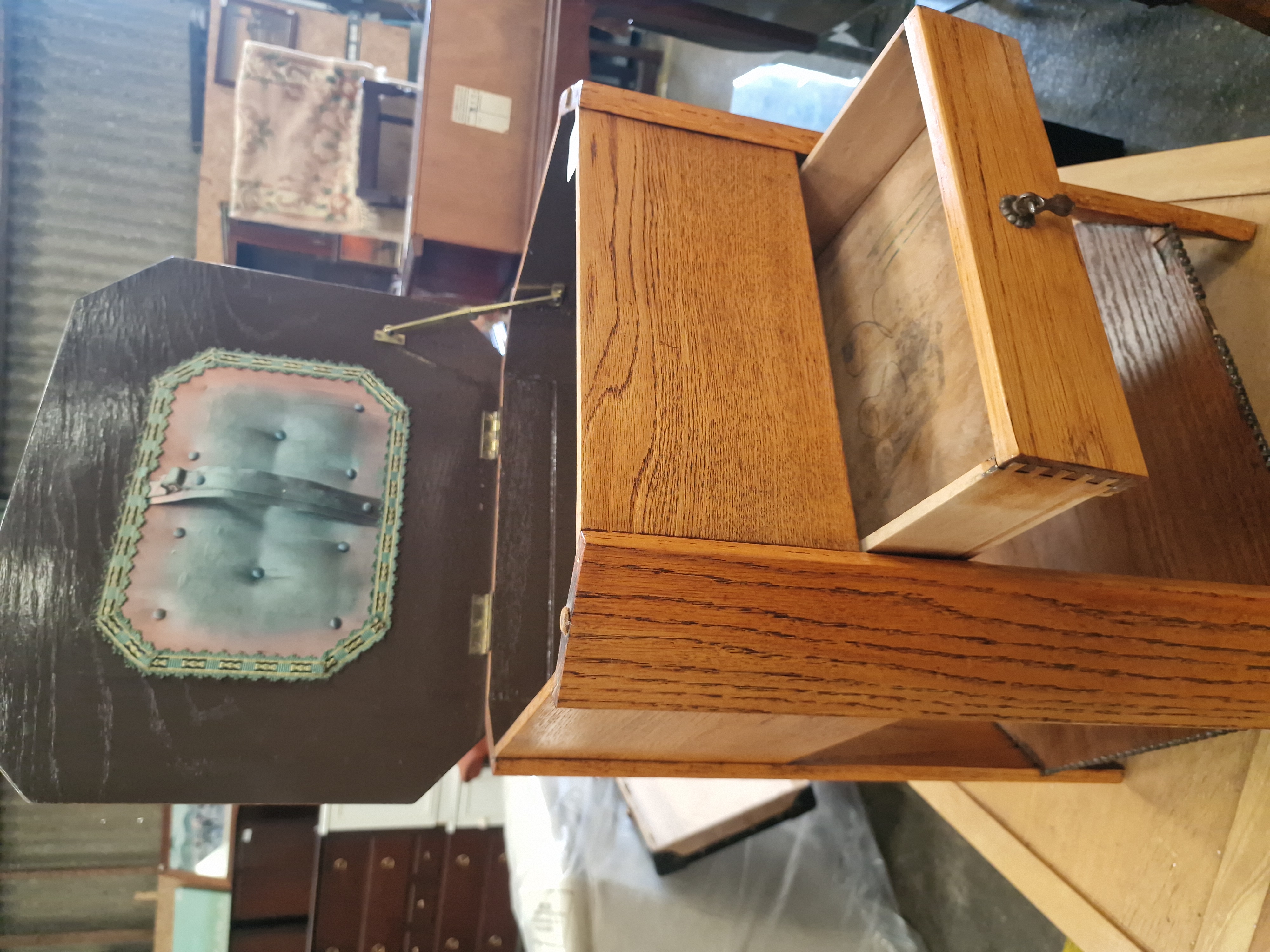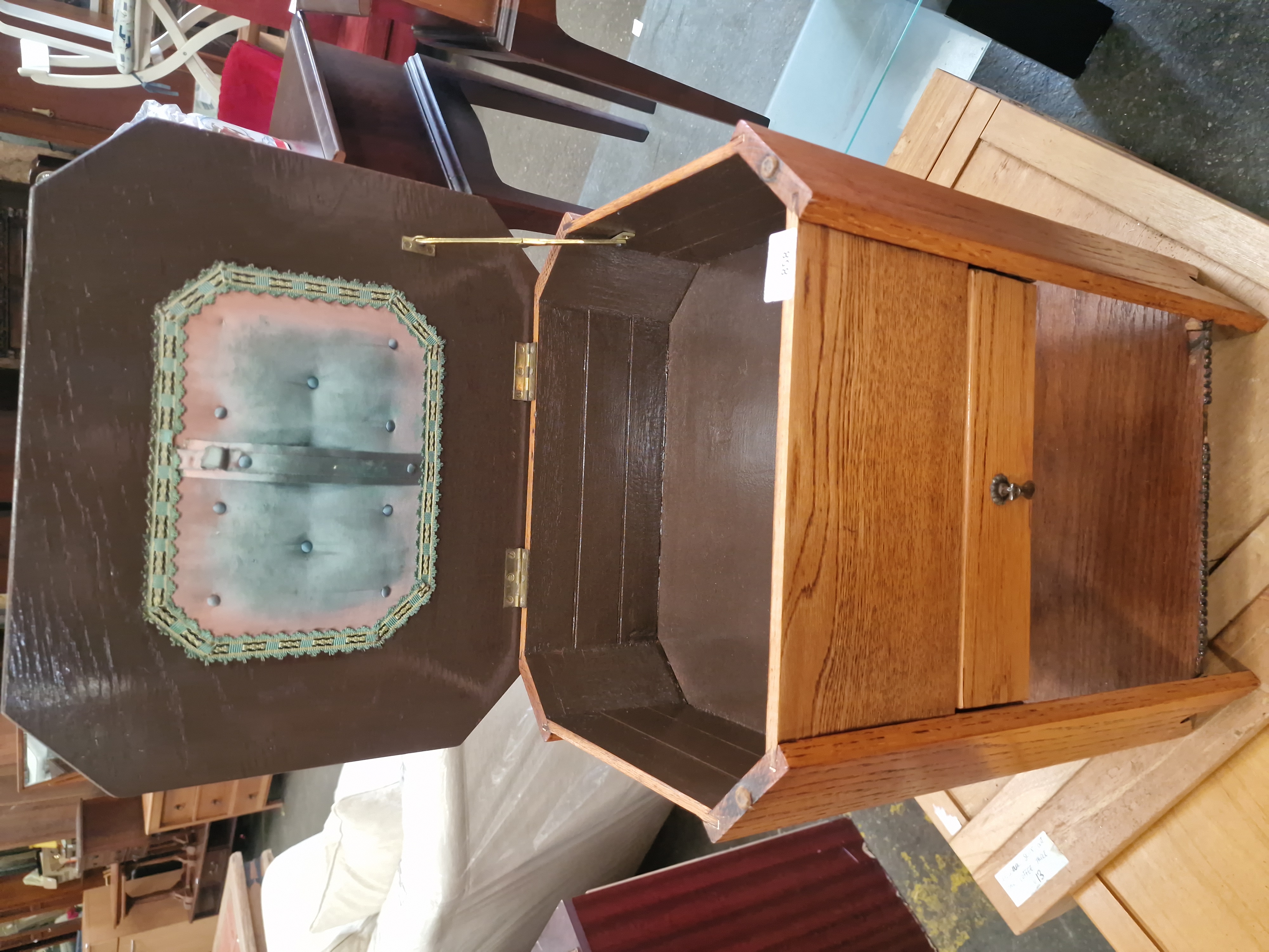 The table is in good overall condition, showing character and patina consistent with age and use. The oak exterior retains a good colour. The drawer and lid hinges are functional. There is some minor fading and wear to the internal fabric panel, along with typical light scuffs and marks to the wood surfaces. One screw head on the top rim appears to be a later replacement.