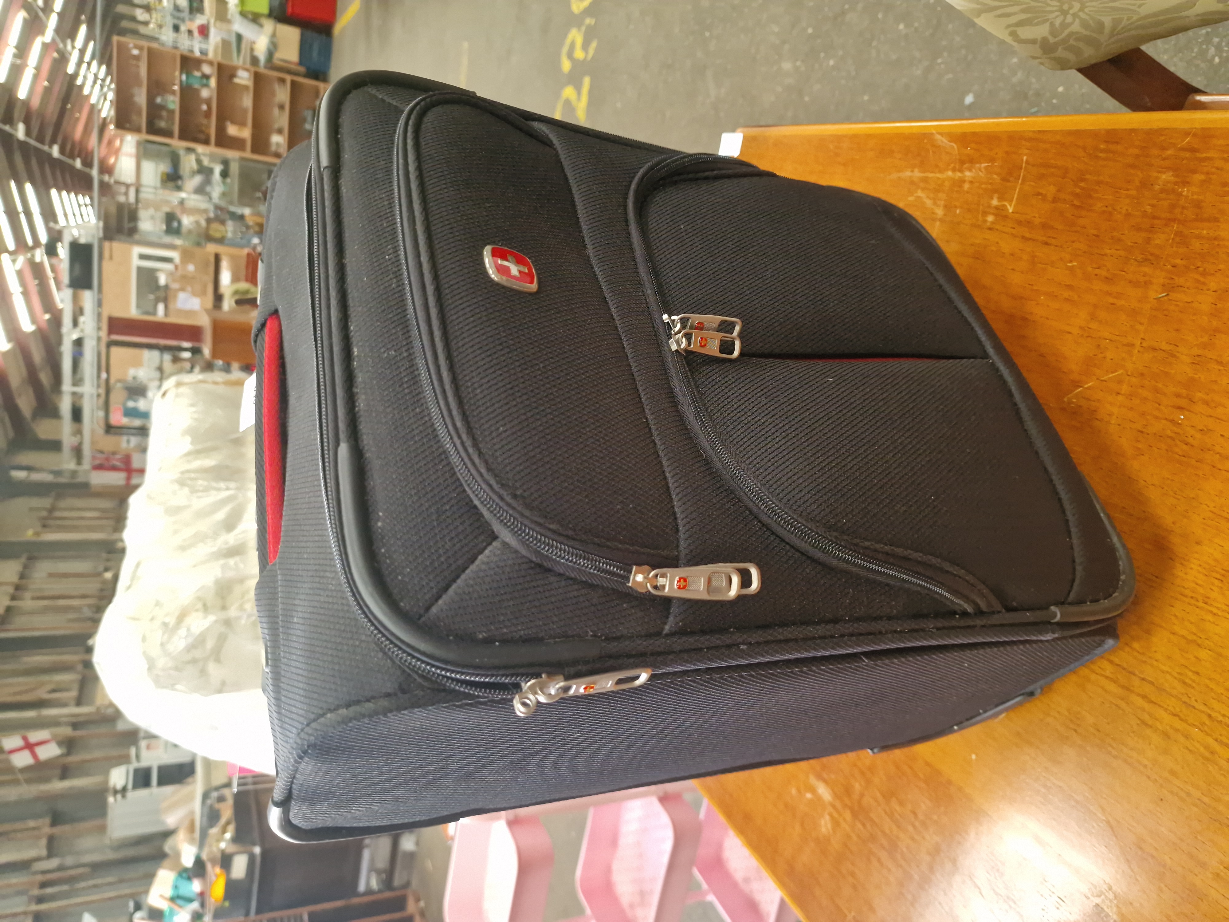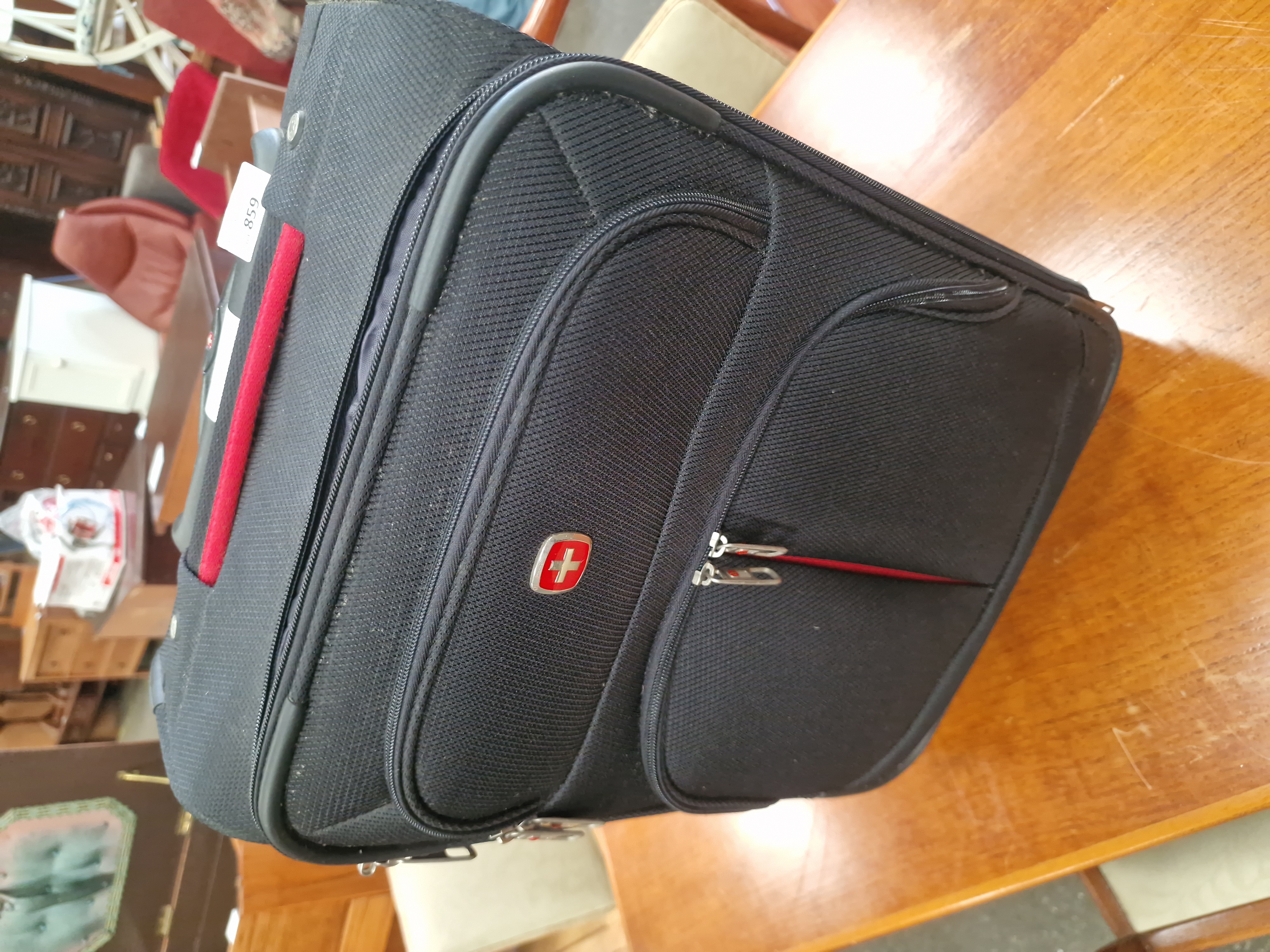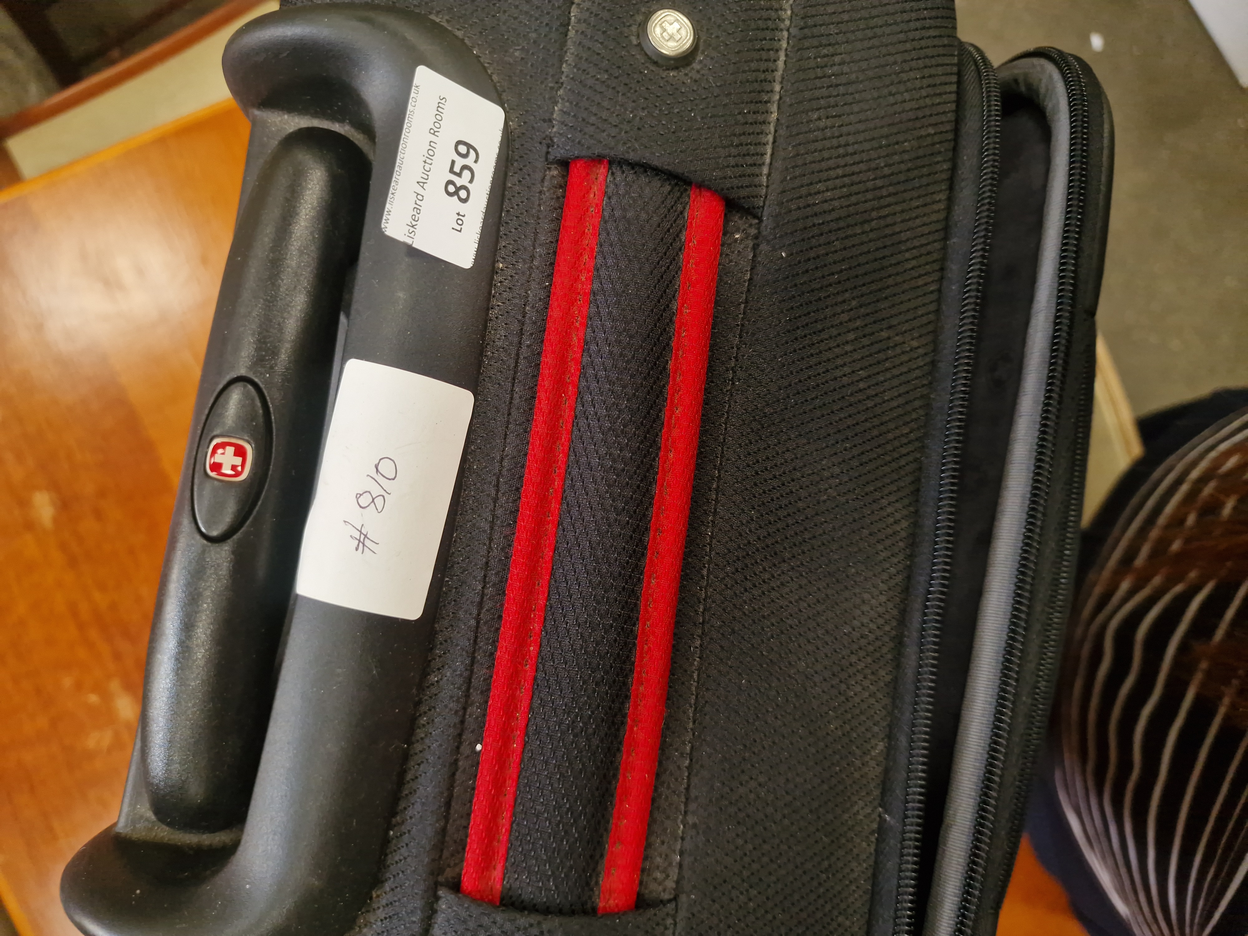 A SwissGear Sion softside expandable spinner suitcase. The item is constructed from black synthetic fabric featuring red accents. It includes multiple zipped exterior compartments, a telescopic pull handle, and integrated carry handles. The piece is embellished with a red shield logo containing a white cross on the front panel, top handle, and metal zip pulls. Several auction labels are affixed to the exterior, including one from Liskeard Auction Rooms indicating lot 859.