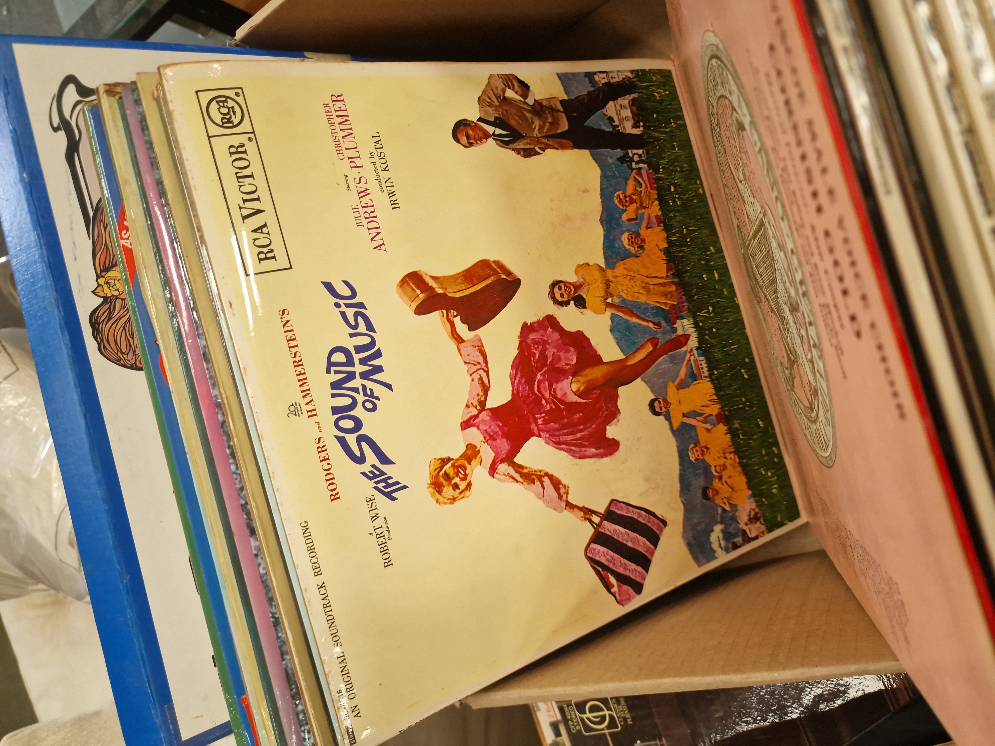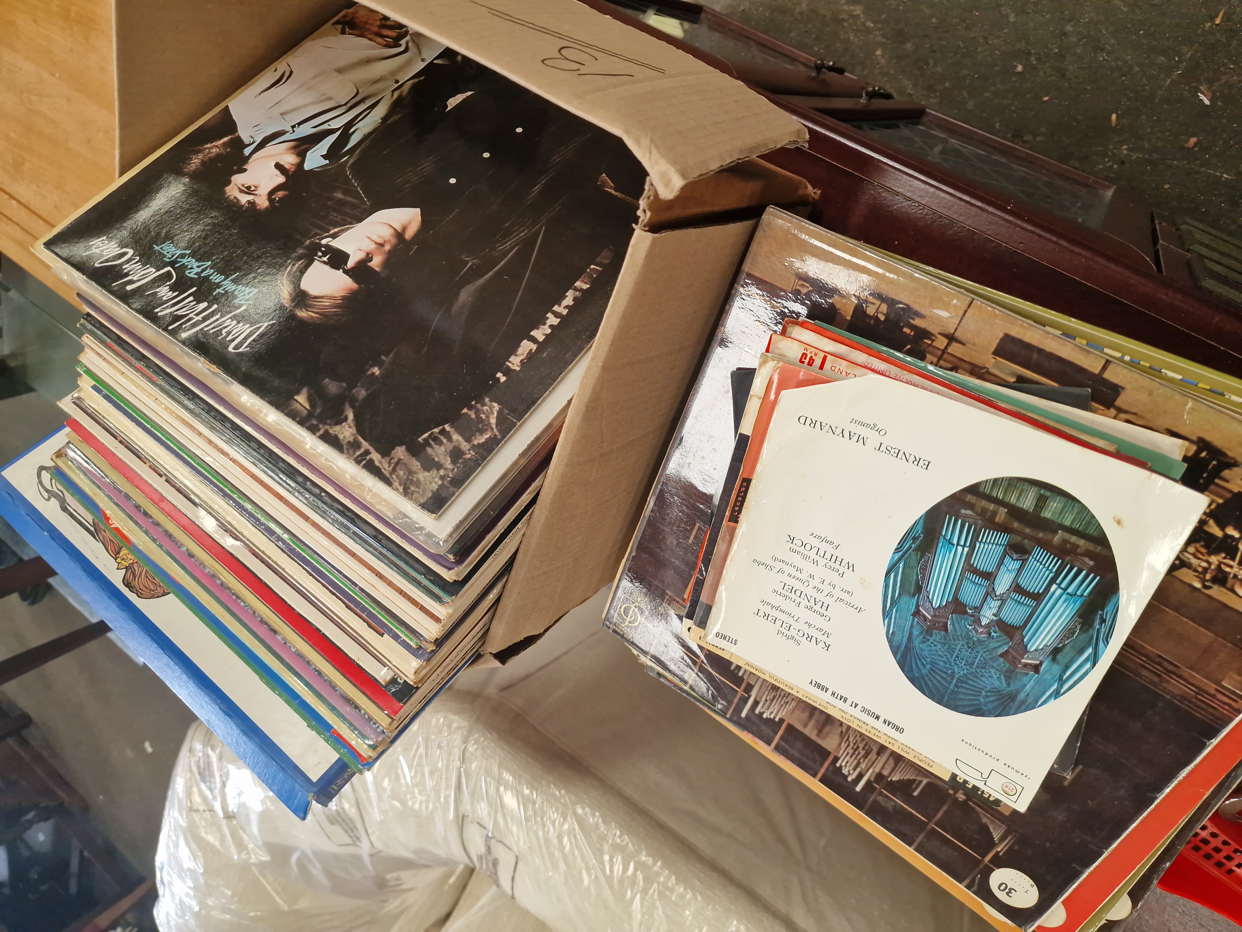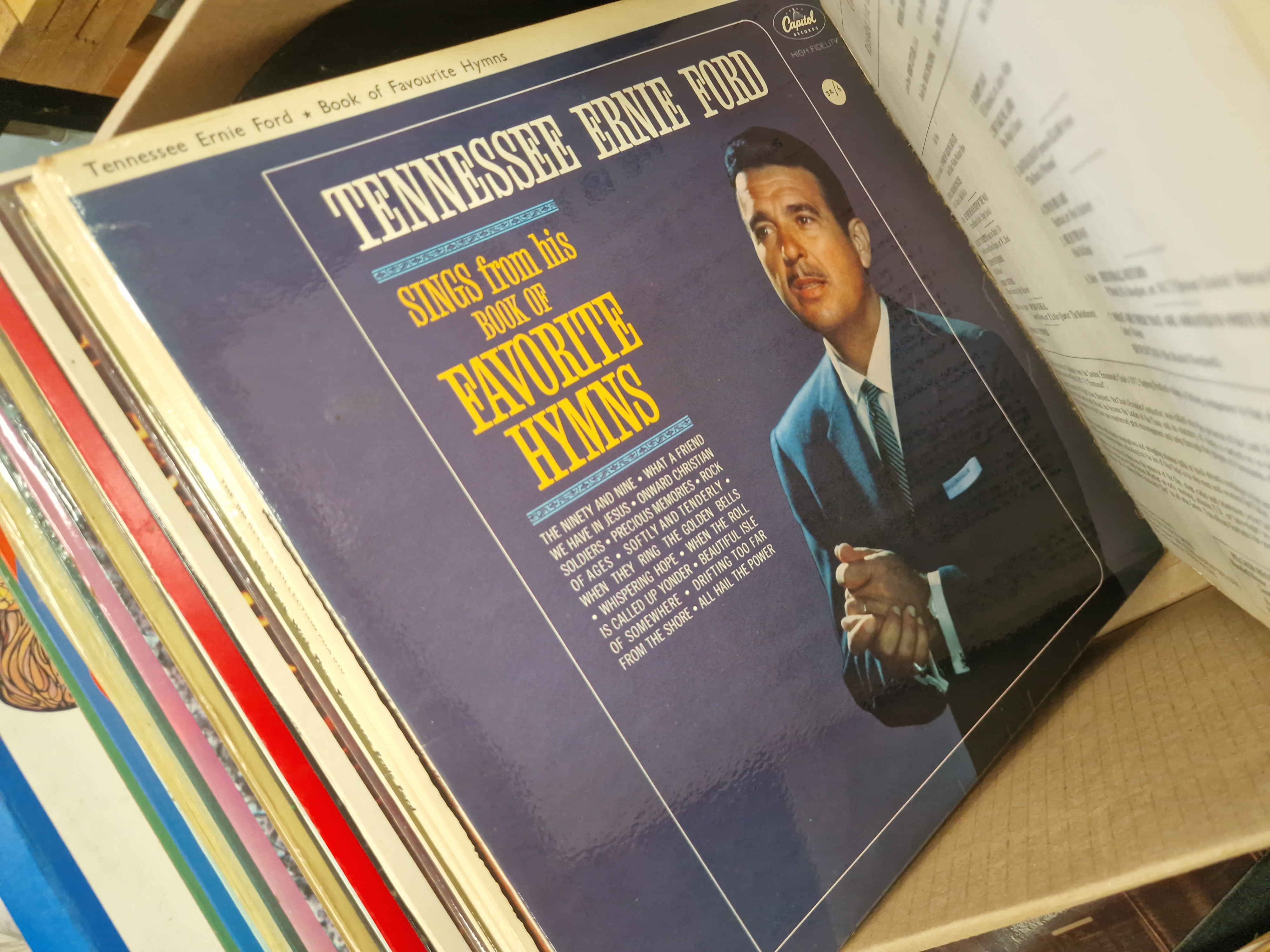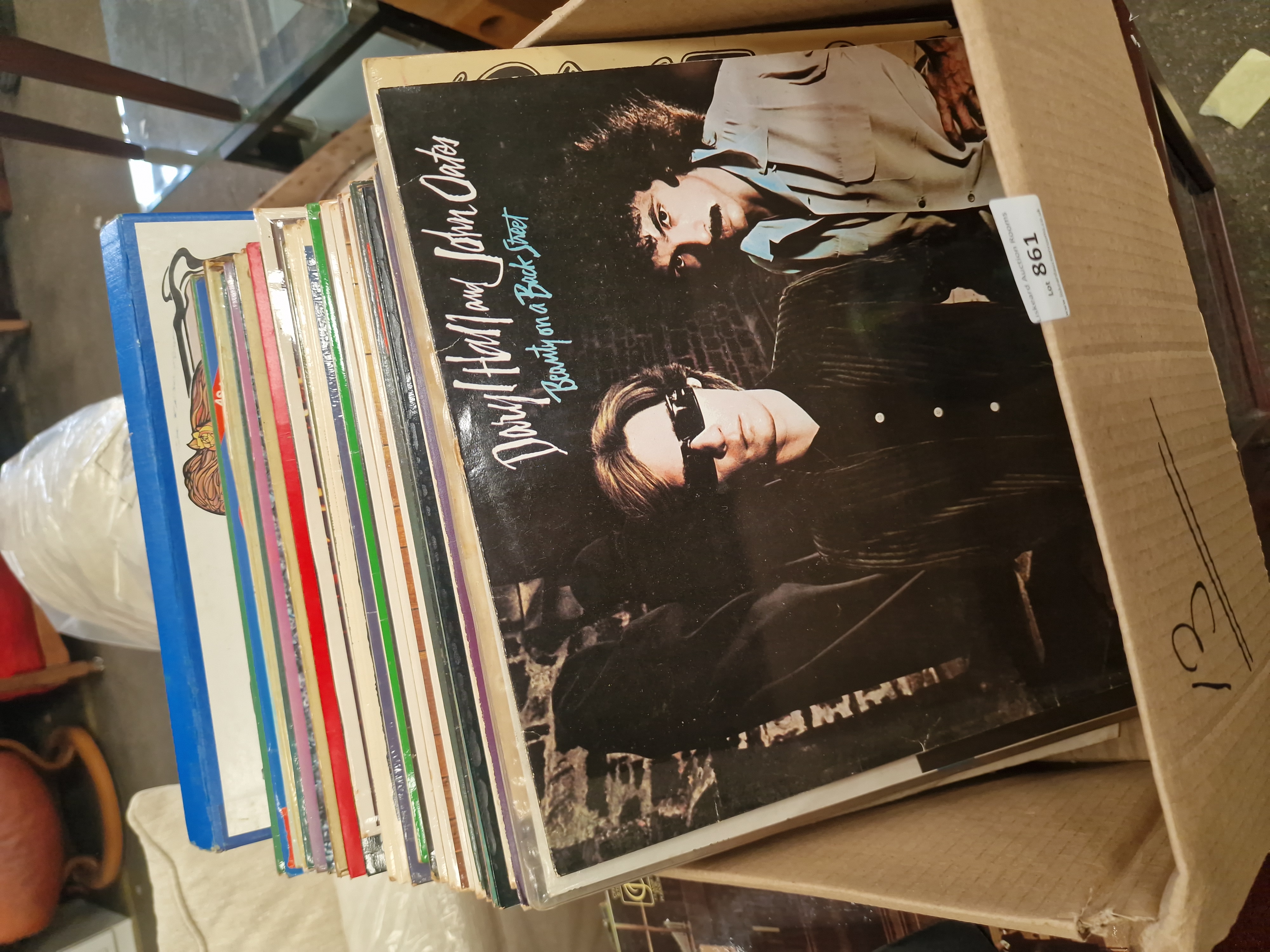 A collection of vintage vinyl records comprising approximately 40-60+ units of 12-inch Long Play (LP) albums and 7-inch 45 RPM singles. The assortment covers various genres including pop, rock, folk, musical theatre, religious, and classical music. Identified titles include Daryl Hall and John Oates – Beauty on a Back Street, Rodgers and Hammerstein’s The Sound of Music (RCA Victor), Burl Ives – Return of the Wayfaring Stranger (Hallmark HM 514), and Tennessee Ernie Ford – Sings from his Book of Favorite Hymns (Capitol Records). Vocal compilations such as I Believe (Hallmark) featuring Johnny Cash and Doris Day are present, alongside classical works including Alfred Brendel – Beethoven: Piano Music Volume I (Turnabout), Handel Organ Concerti featuring Nicolas Kynaston (Classics for Pleasure), and Ernest Maynard – Organ Music at Bath Abbey (Ryemuse). The collection includes 45 RPM singles such as The Browns – The Three Bells (RCA). Visible labels include RCA Victor, Capitol Records, Hallmark, Turnabout, Classics for Pleasure, and Ryemuse. The lot bears a sticker from Liskeard Auction Rooms with the number 861.