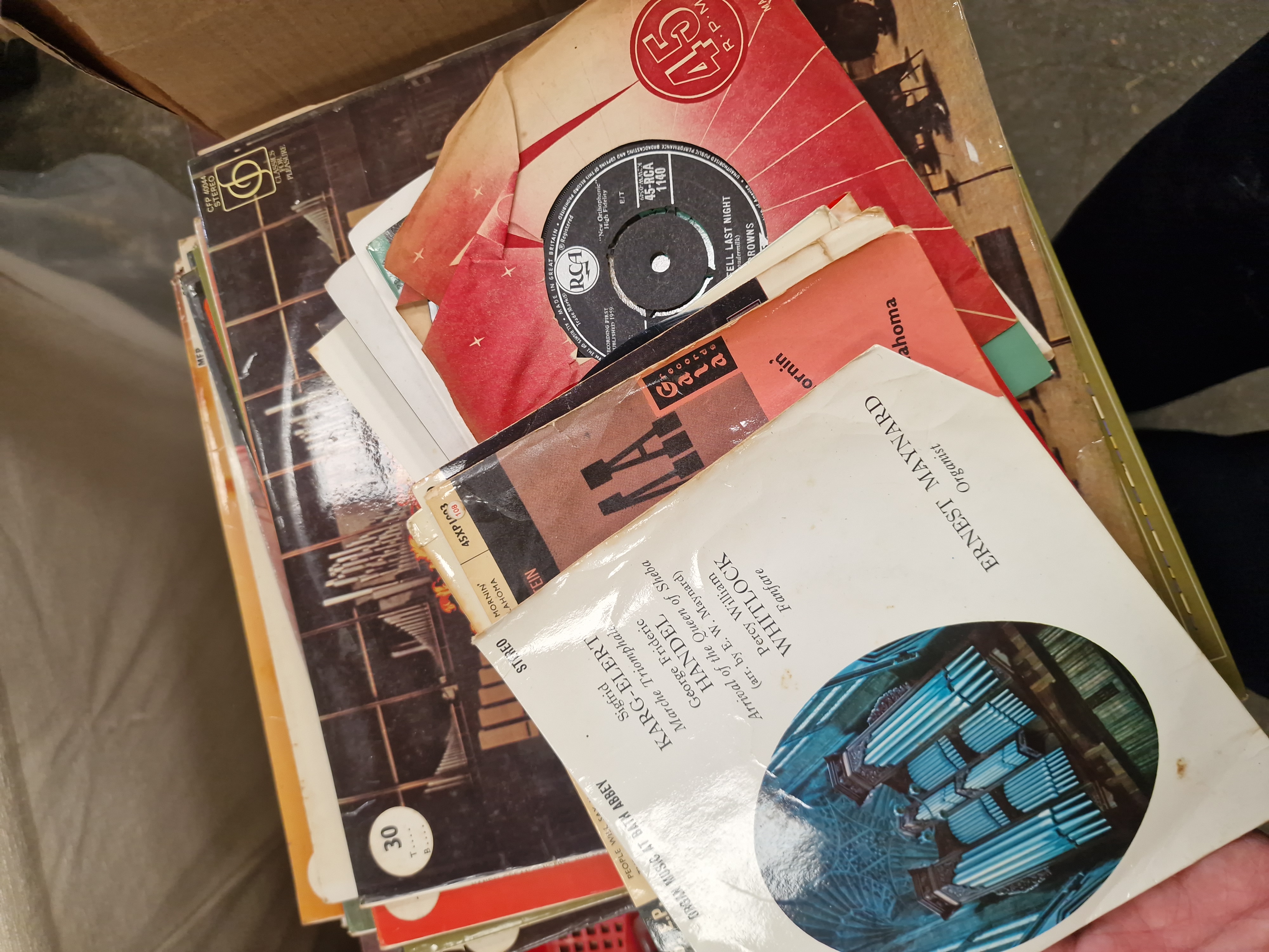 The collection is in varied vintage condition. Sleeves exhibit signs of age and handling including shelf wear, corner bumping, and edge scuffing. Some paper sleeves for singles show significant creasing and tearing. The vinyl discs have not been individually inspected for surface marks or playback quality.