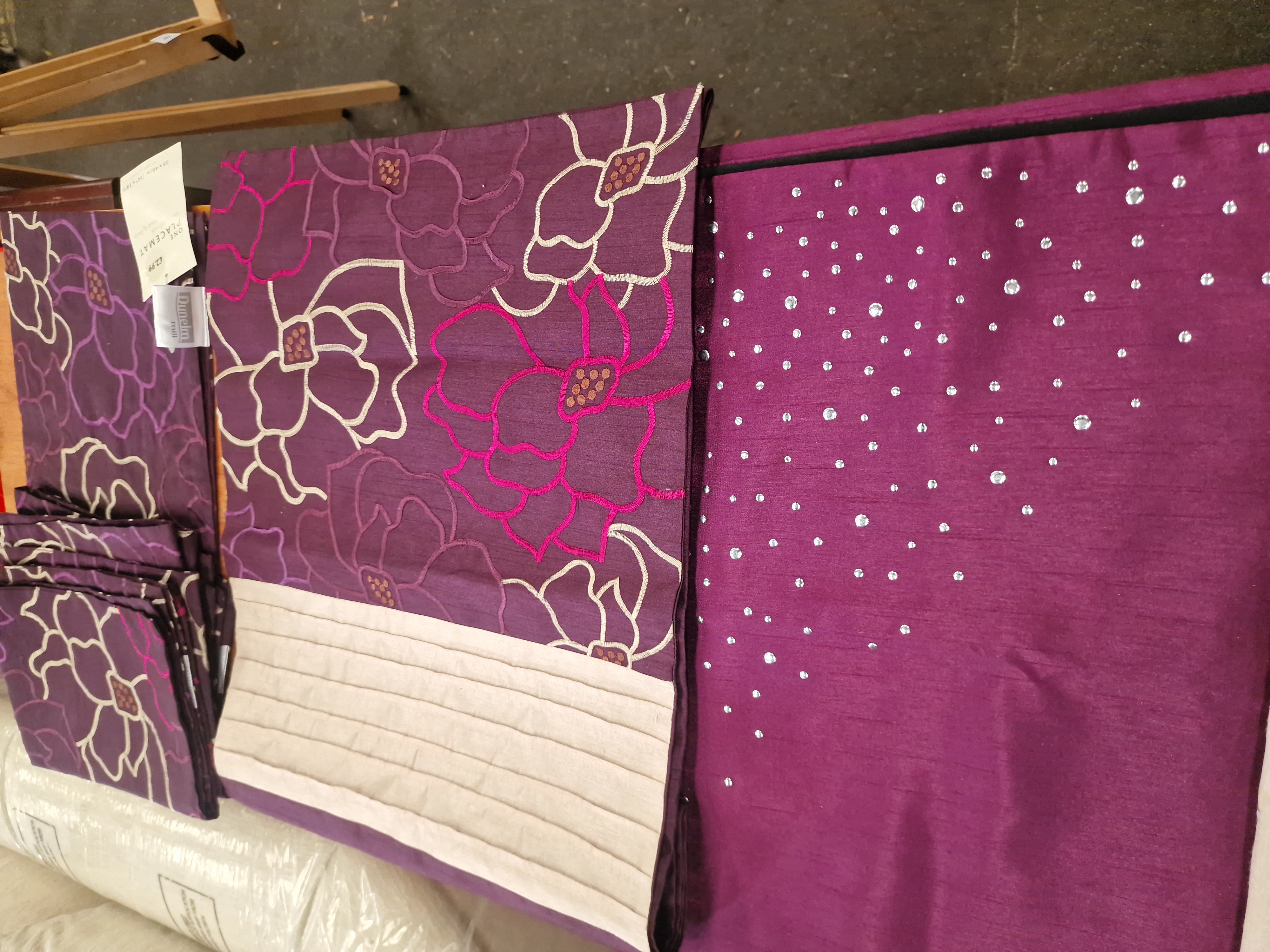 A collection of contemporary table linens featuring items from the British retailer Dunelm. The lot includes six rectangular placemats and a matching table runner in an aubergine faux-silk fabric, decorated with large-scale embroidered floral outlines in cream and pink tones and finished with a pleated cream border. Also included are two additional table runners: one in purple synthetic fabric embellished with scattered diamante studs, and one in a neutral biscuit-coloured fabric with scrolling floral embroidery. The assortment of tablecloths comprises one white example with a red floral border featuring laser-cut detailing and scalloped edges, one plain aubergine tablecloth, one lavender textured tablecloth, and a light mint green fabric piece. Construction is primarily of synthetic blends including polyester and cotton-polyester mixes. Several items retain original retail labels for Dunelm Mill.