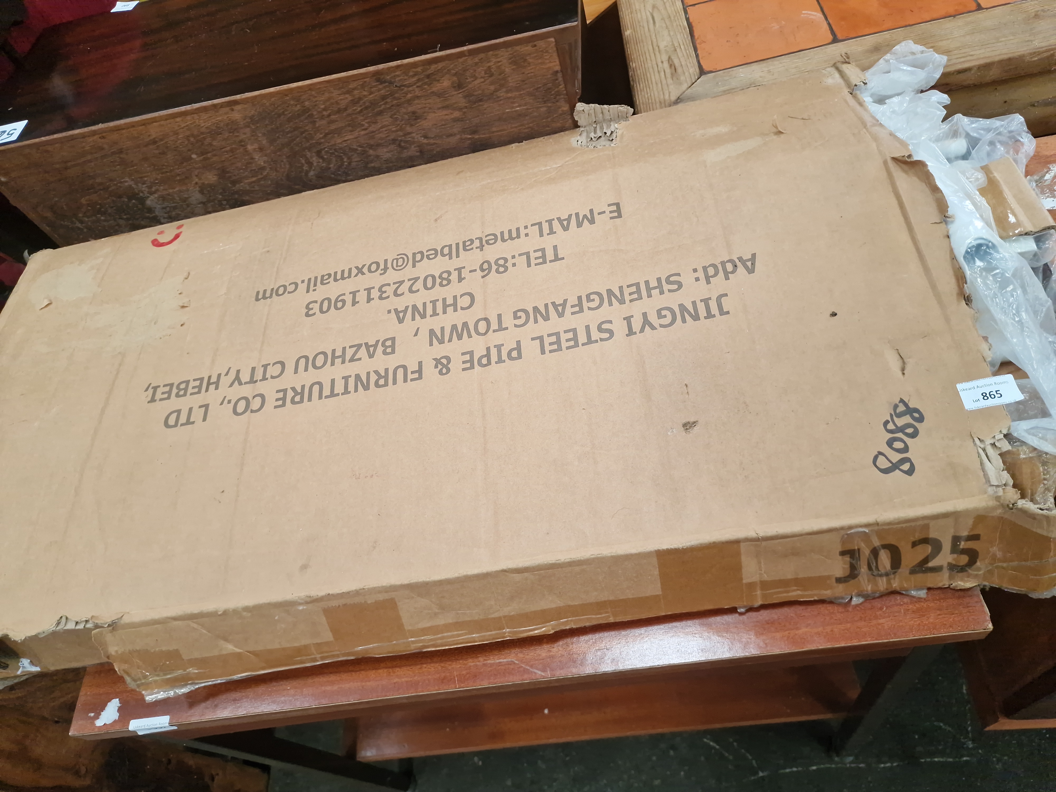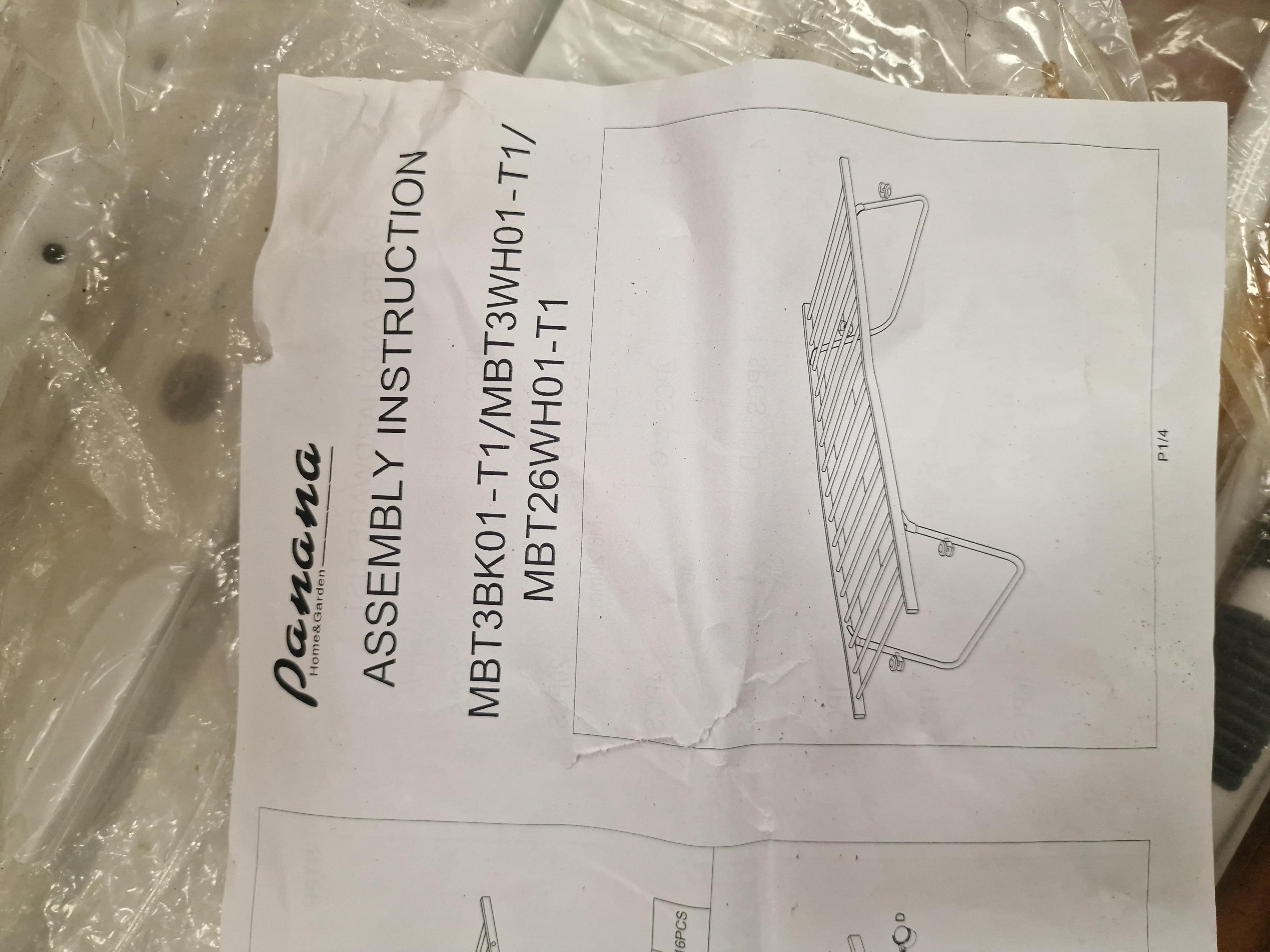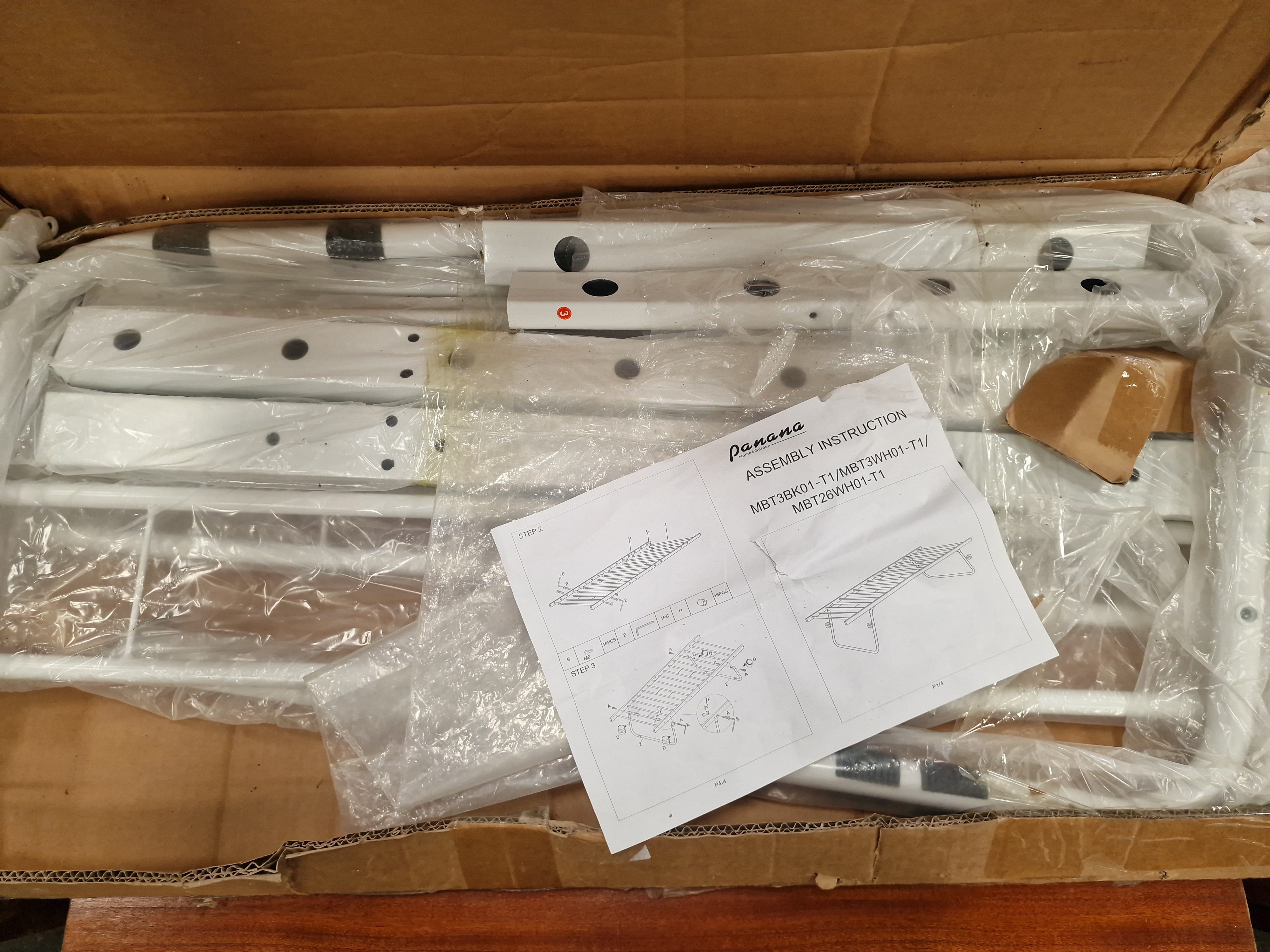 Customer Returns. The item is housed in an open, heavily worn, and taped cardboard carton. While the primary metal frame sections are present and mostly sealed in original plastic wrapping, the completeness of small hardware and fixings has not been verified against the assembly manual. The outer packaging shows significant wear and tear.