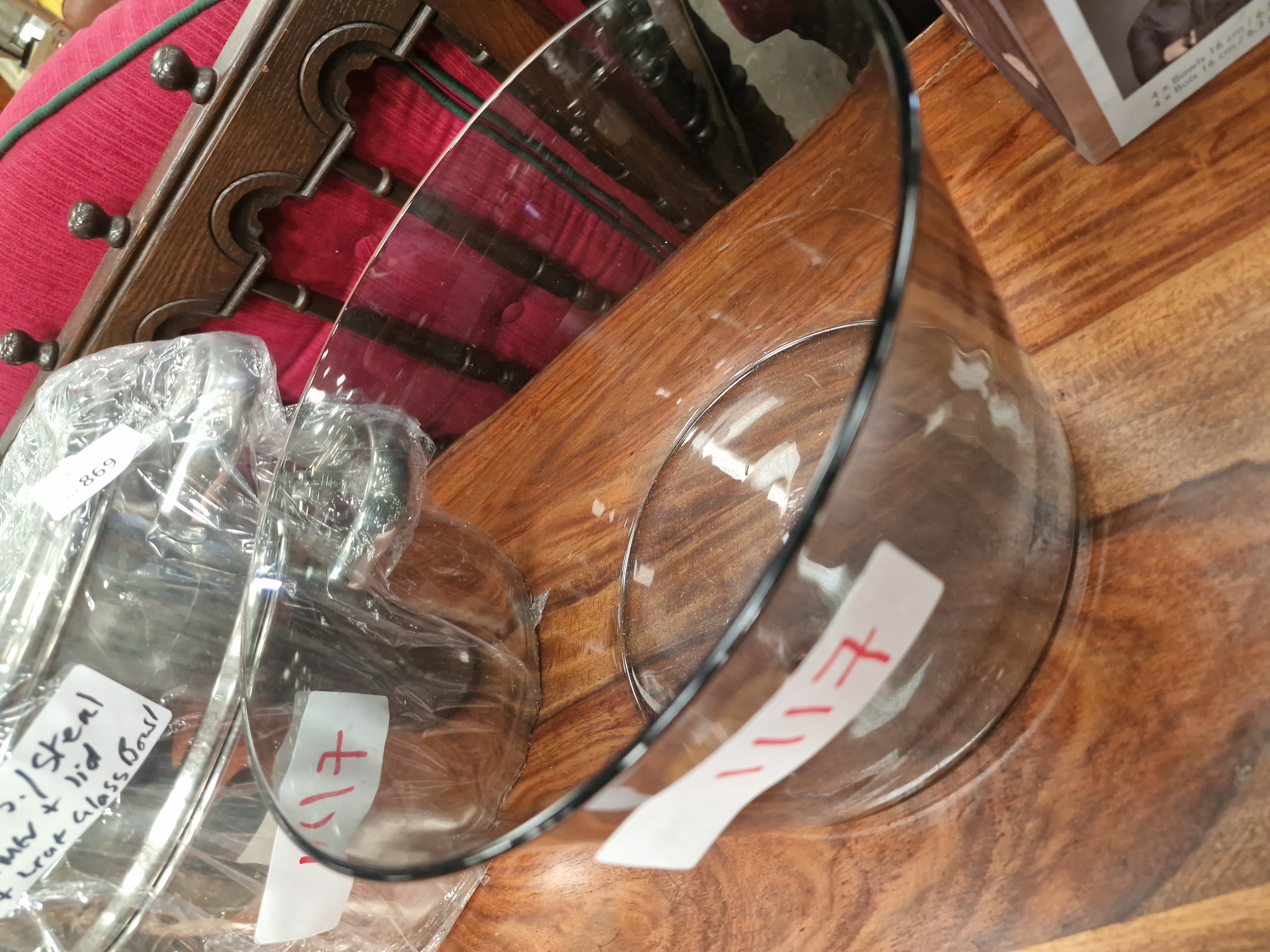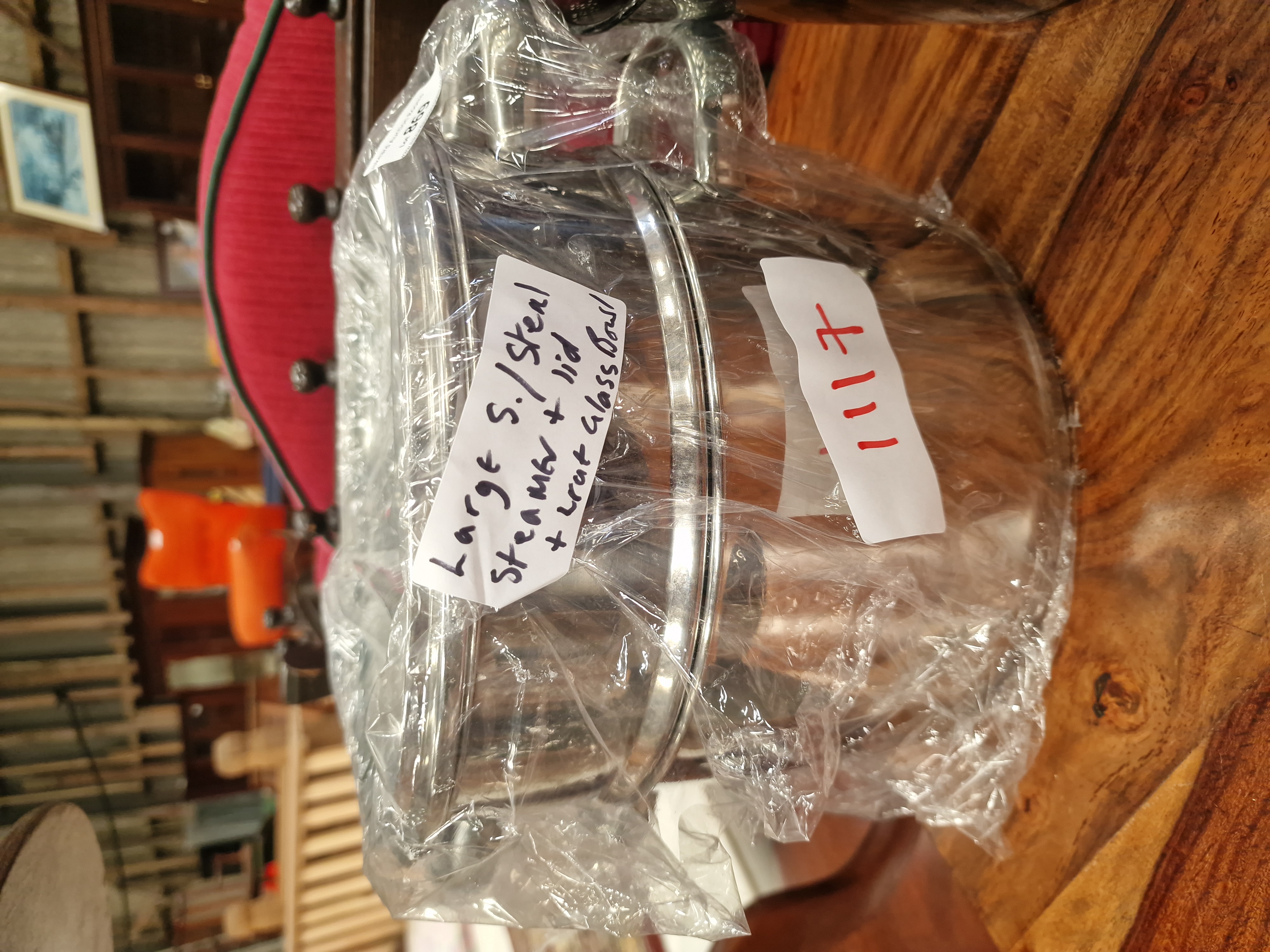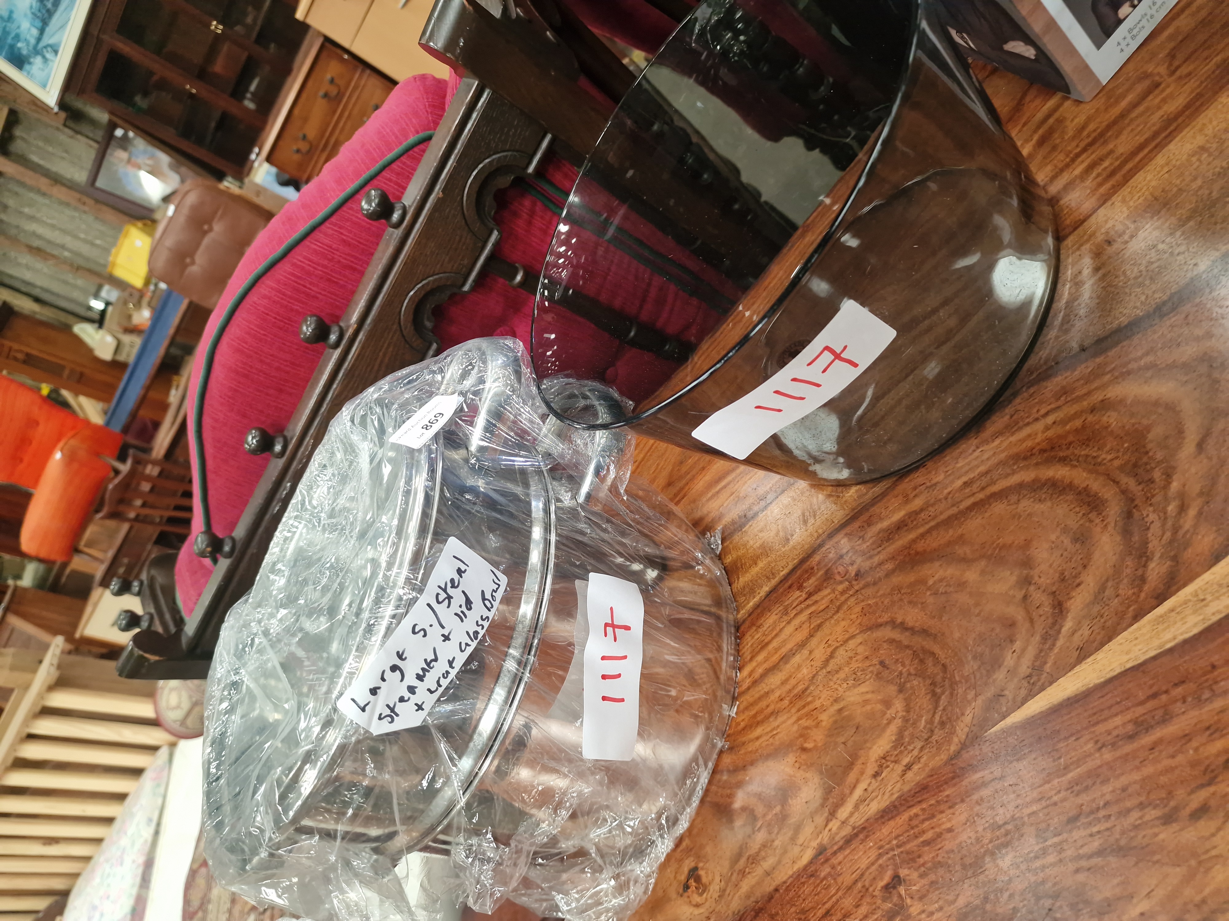 This lot comprises a stainless steel steamer set and a separate decorative glass bowl. The steamer set is constructed from polished stainless steel and consists of a deep base pot, a perforated steamer insert, and a matching lid with a central handle. The accompanying bowl is made of smoky-grey tinted glass and features a tapered, cylindrical form with a plain rim. No manufacturer marks or brand names are visible on any of the components. Both items bear handwritten lot labels numbered 1117, and the steamer set includes a descriptive label identifying the contents as a large stainless steel steamer with lid and an extra glass bowl.