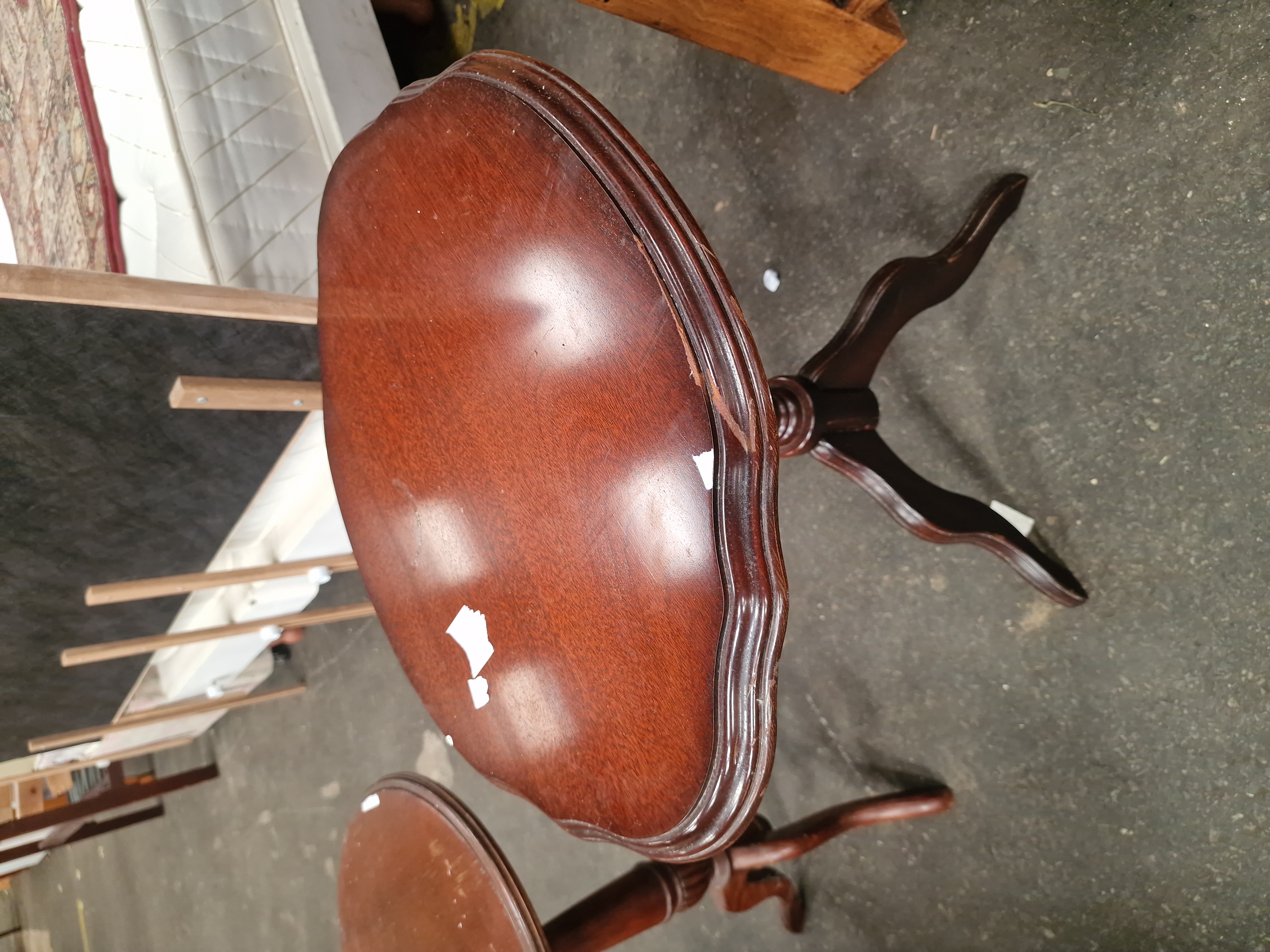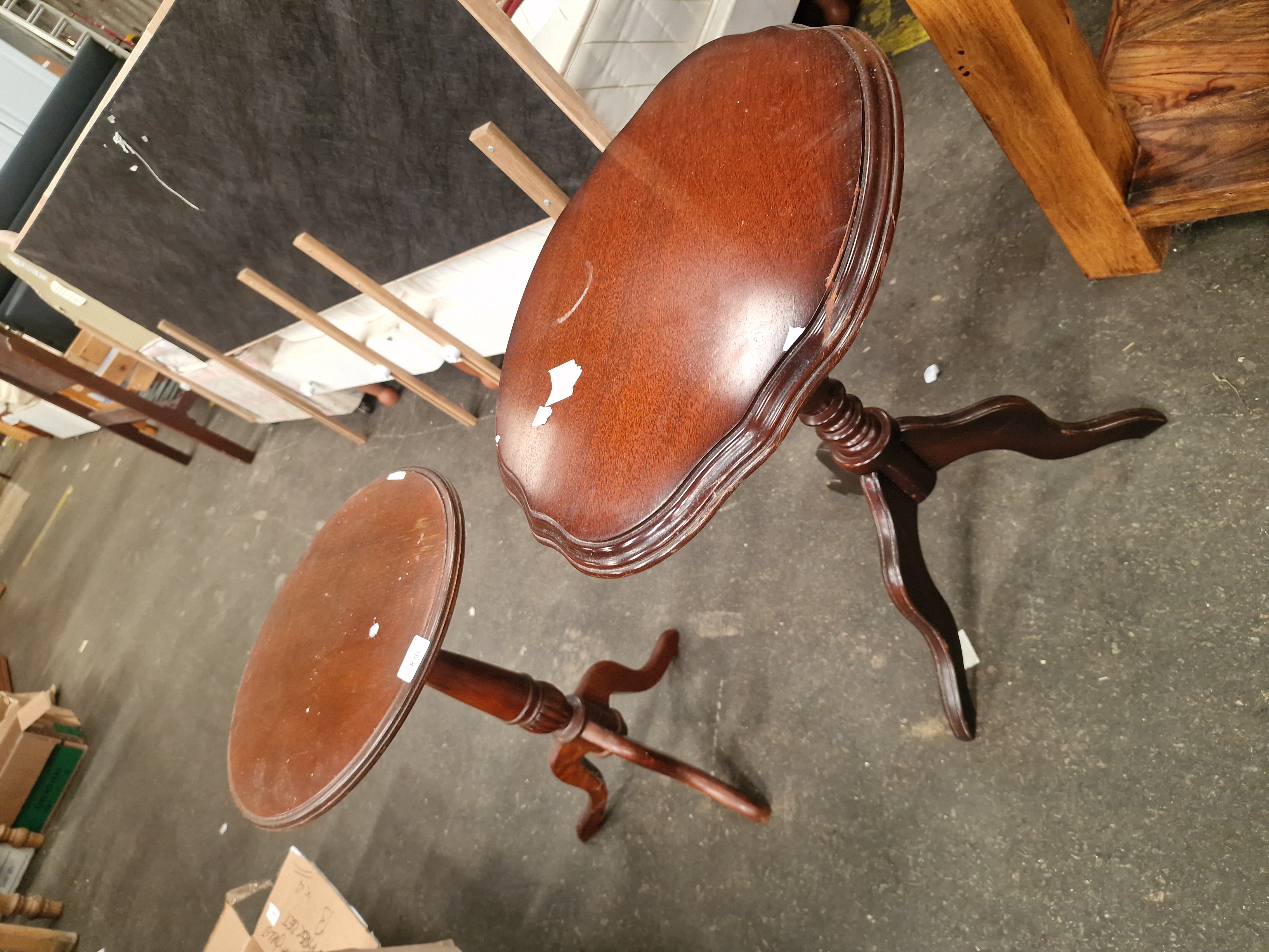 Two assorted pedestal wine tables of varying sizes. The larger table features an oval top with a scalloped pie-crust moulded edge, mounted on a turned central pedestal with a tripod base and out-swept cabriole legs. The smaller table comprises a circular top with a simple moulded edge, supported by a turned pedestal on a tripod base. Both pieces are constructed from mahogany or mahogany-stained hardwood and represent mid-20th-century British reproductions of traditional 18th-century furniture designs. One table bears a white adhesive sticker from a previous sale at Chiswick Auctions.