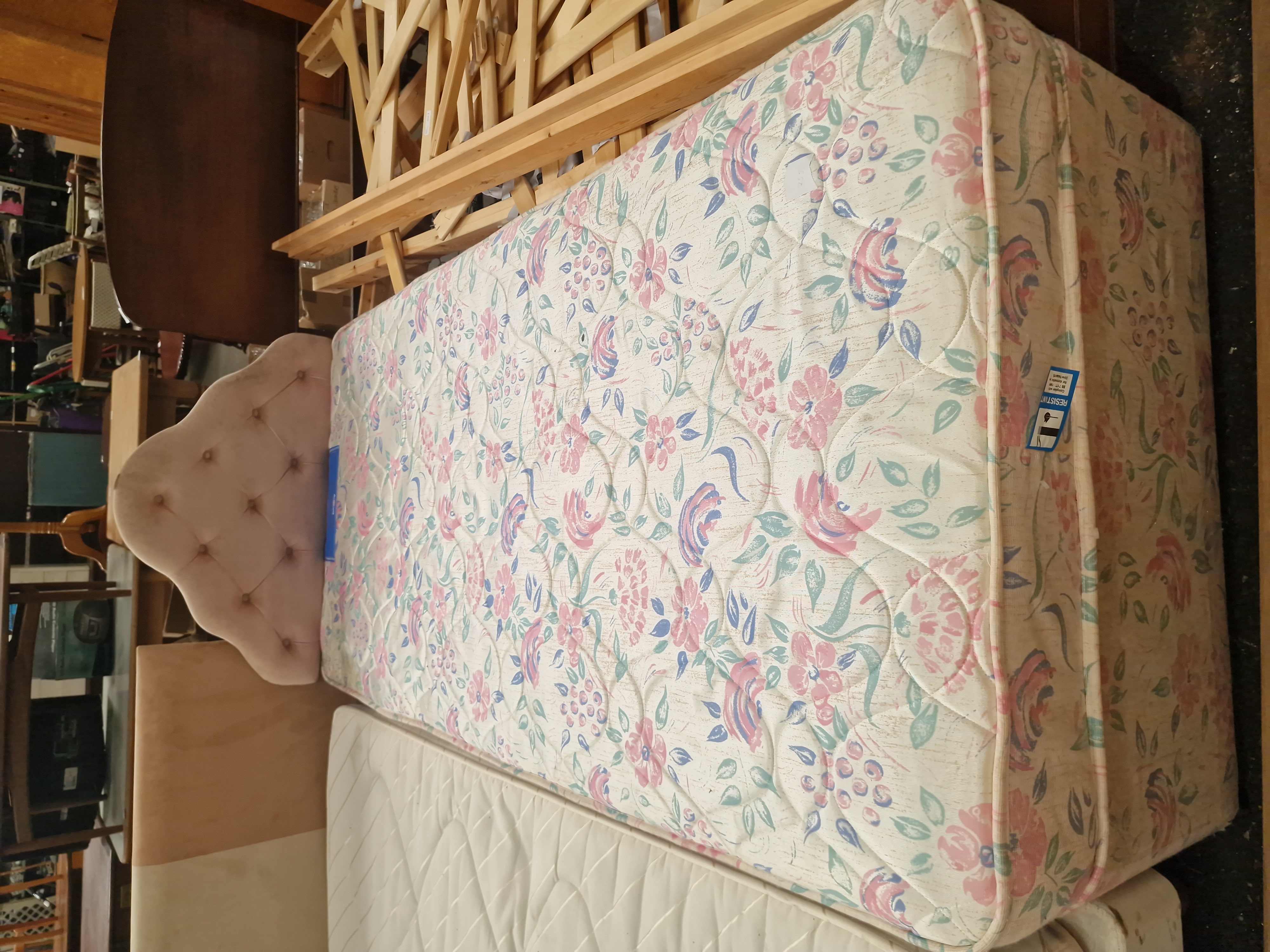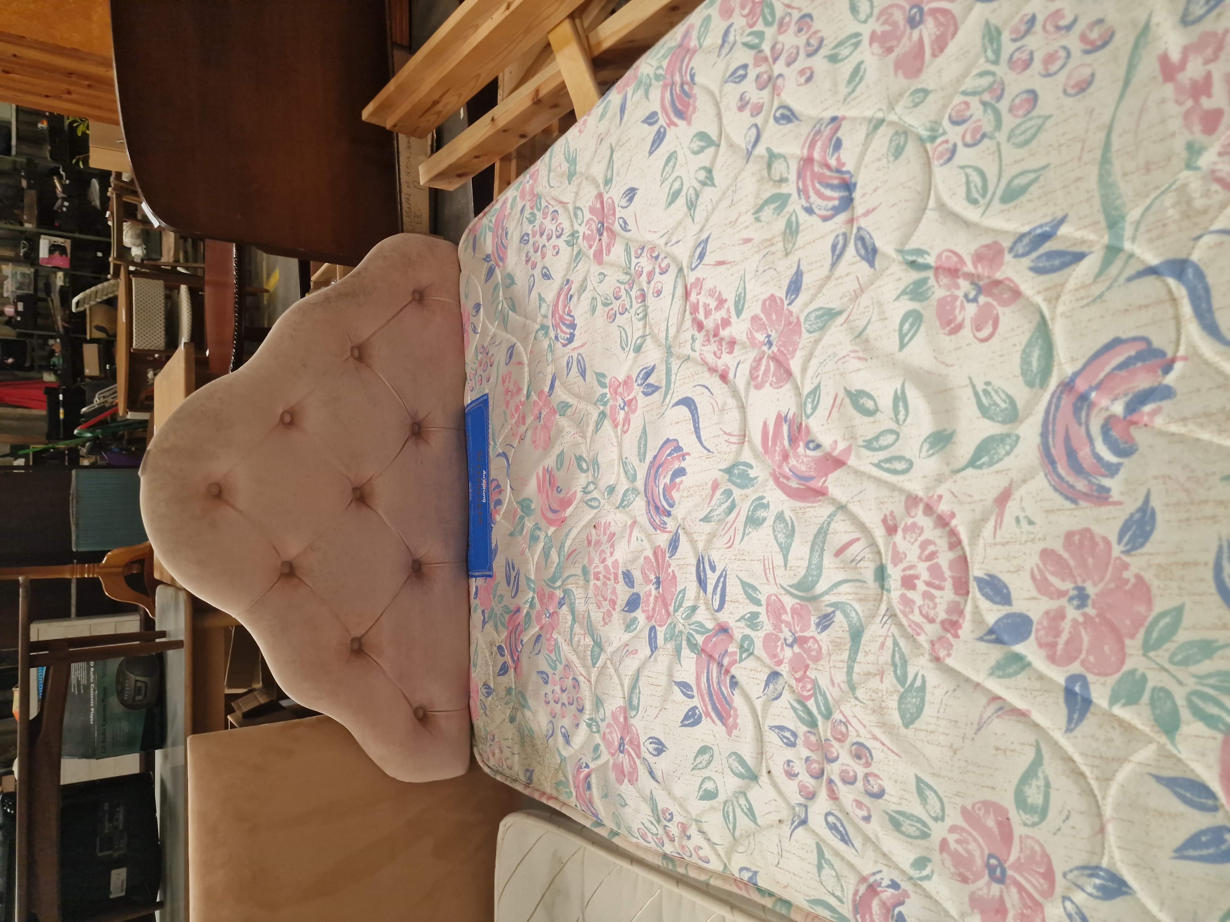 Used condition. Visible dust and light marking to the upper edge of the headboard. The mattress and base show signs of wear consistent with domestic use.