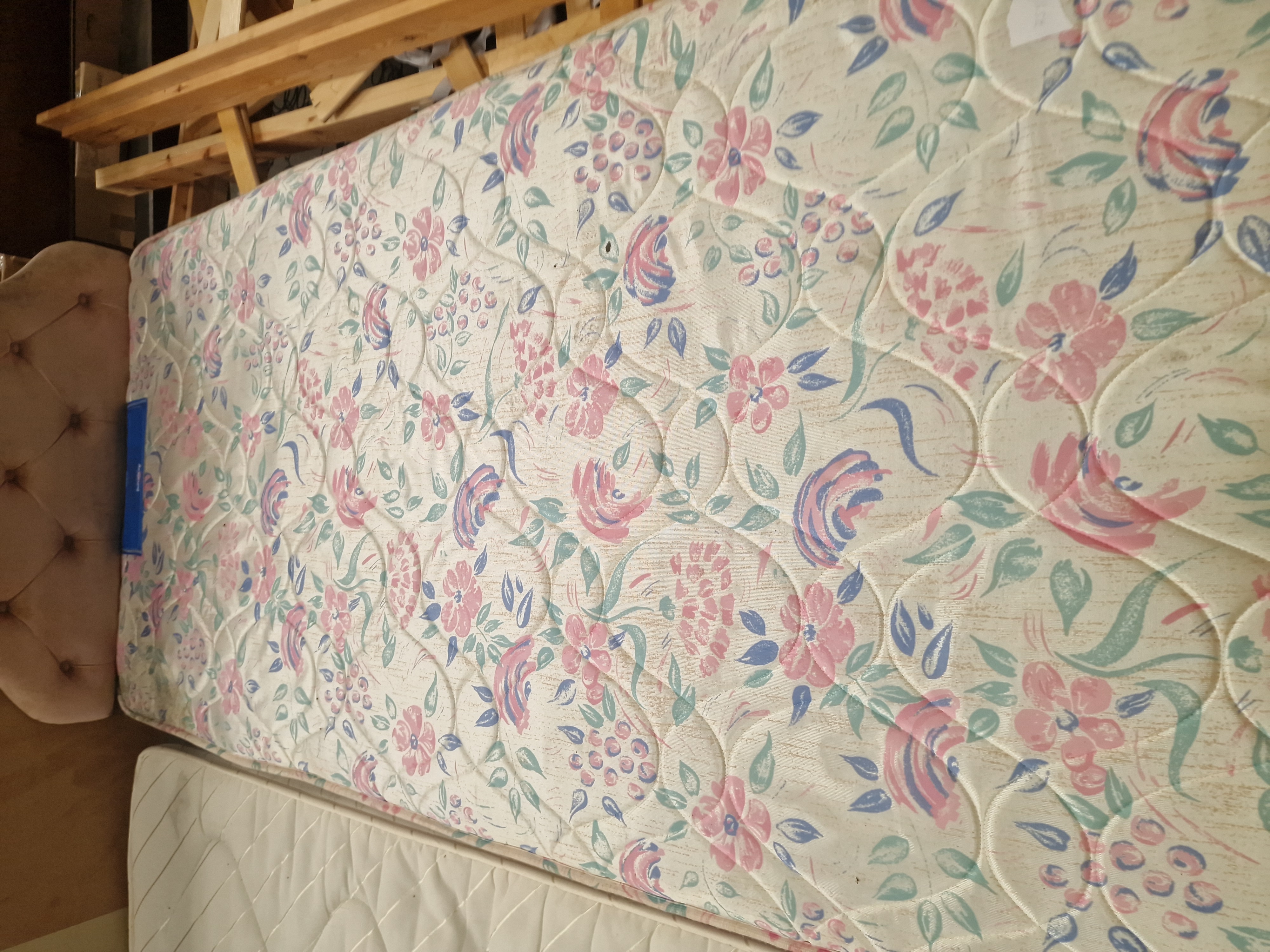 A modern single divan bed comprising an upholstered base, a matching headboard, and a mattress. The headboard is of a padded, button-back tufted design, covered in a light neutral fabric. The mattress features a quilted ticking with a floral pattern in shades of pink, blue, and green. The mattress bears a blue side label with the manufacturer’s mark for Airsprung. A separate label on the divan base is marked RESISTANT.