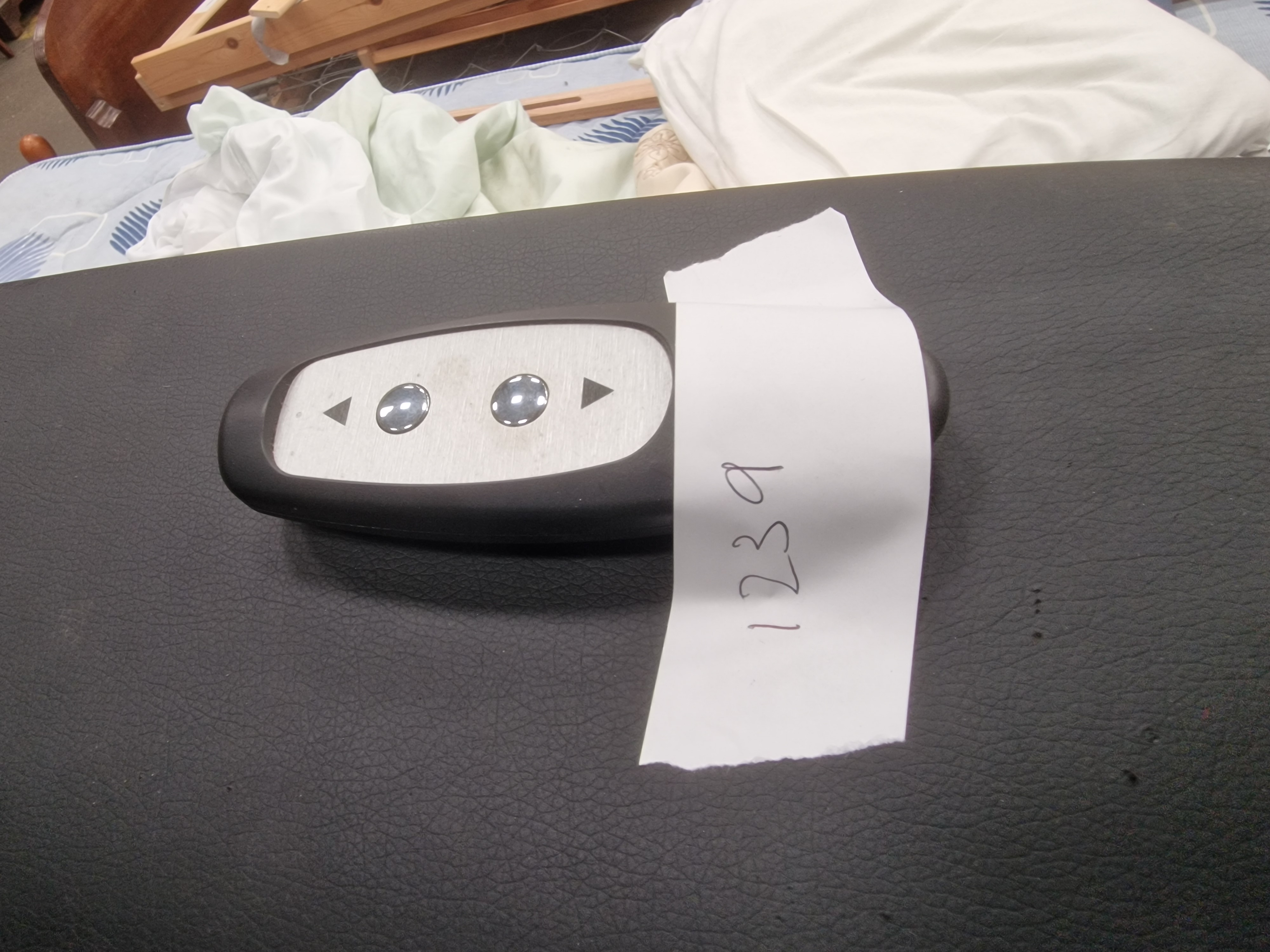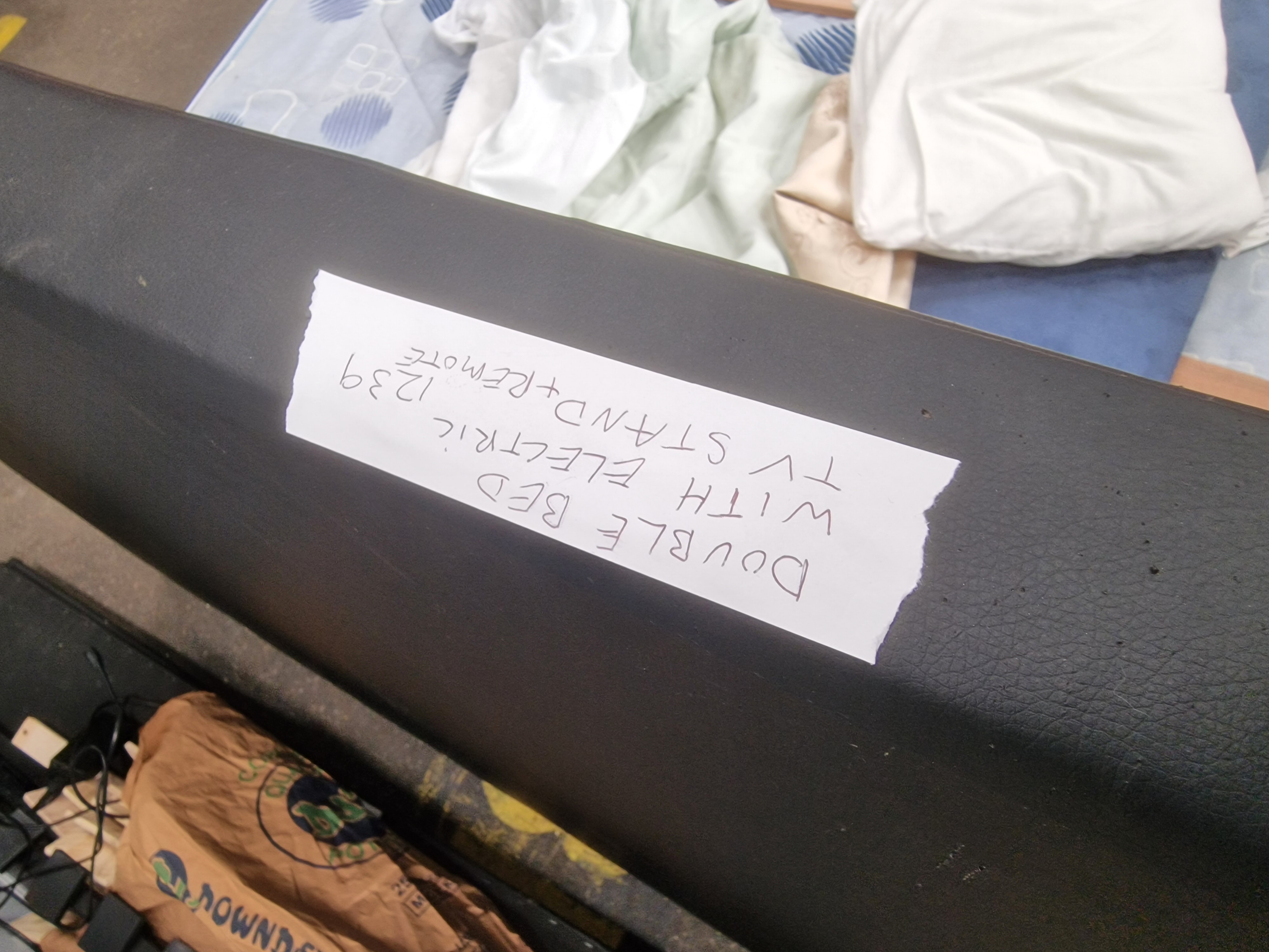 In used condition with visible surface dust and minor wear to the faux-leather upholstery consistent with age and use. The internal electric TV lift mechanism and motor are present but have not been tested for functionality. All major components including rails and slats appear to be present.