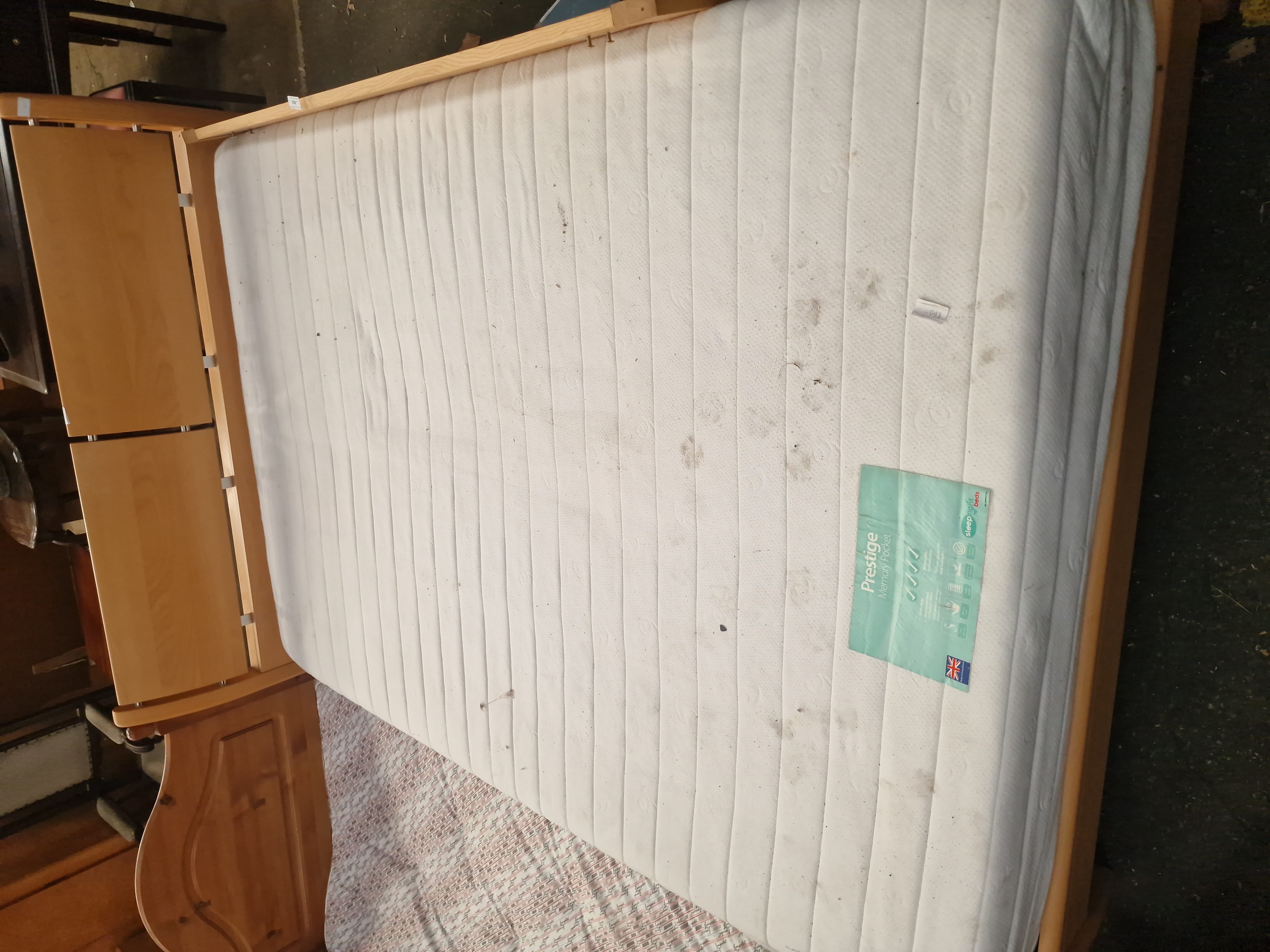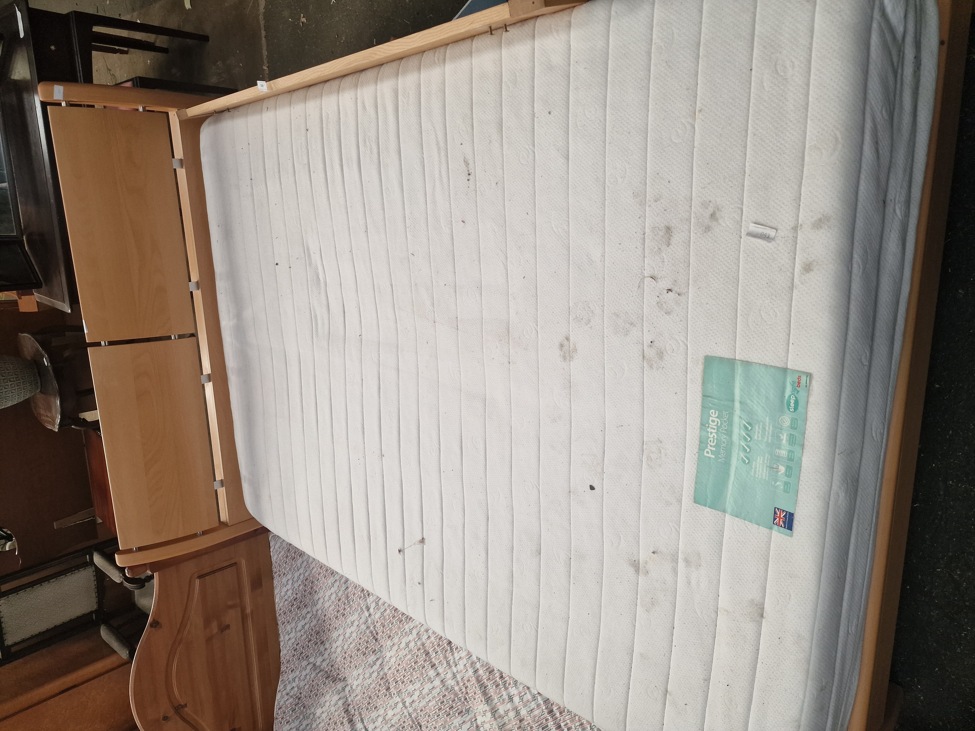 The mattress is in poor aesthetic condition, showing heavy soiling and numerous dark stains across the primary sleeping surface. The wooden frame shows signs of use, including minor scuffs and marks consistent with age. The mattress may be suitable for disposal, and the primary value resides in the frame. Bidders should ensure the mattress retains necessary fire safety labels for resale or use.