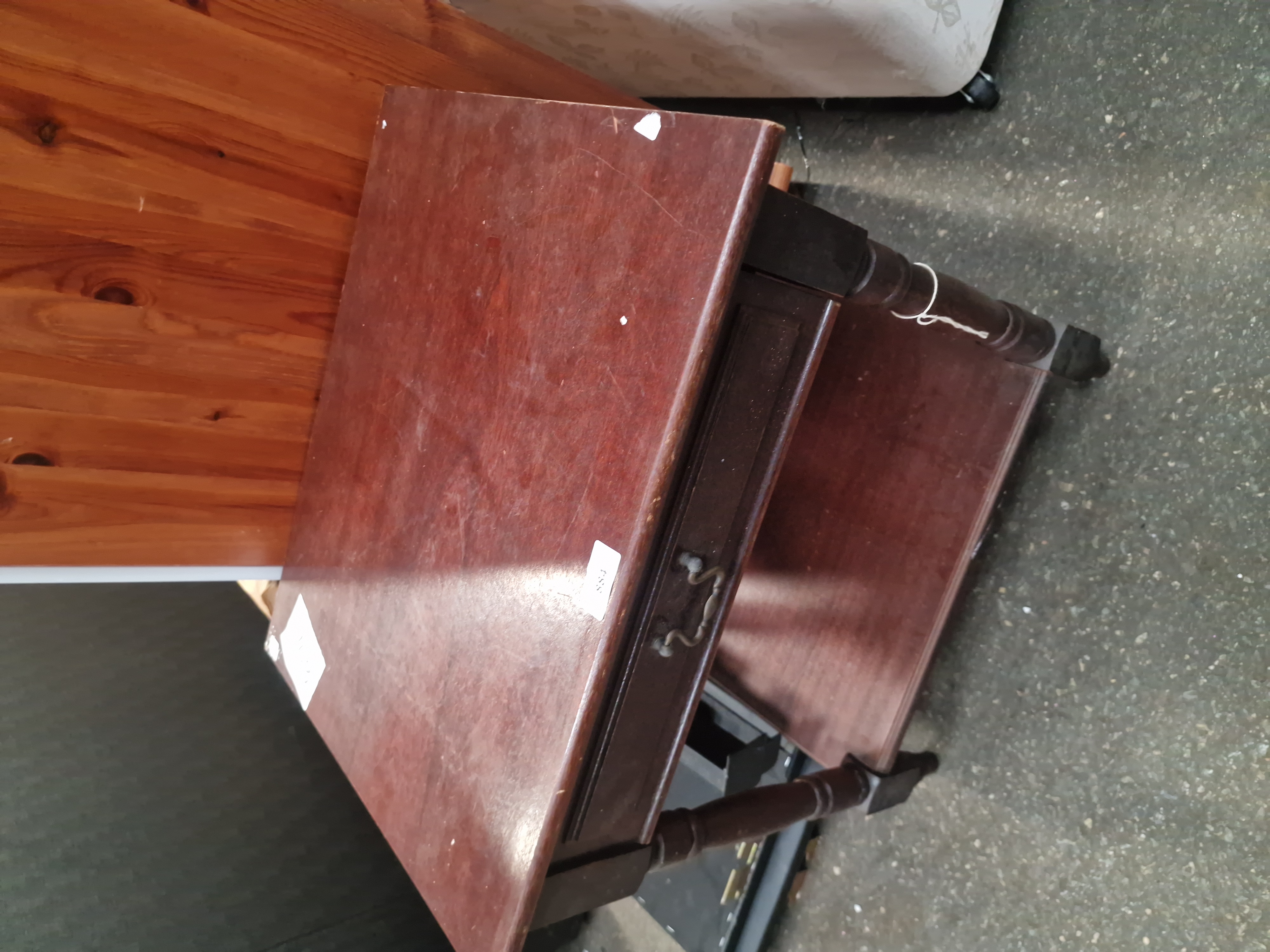 The table is in fair used condition. The top surface exhibits several visible scuffs and scratches throughout. There is minor wear and small chips to the edges of the top. The drawer is functional.