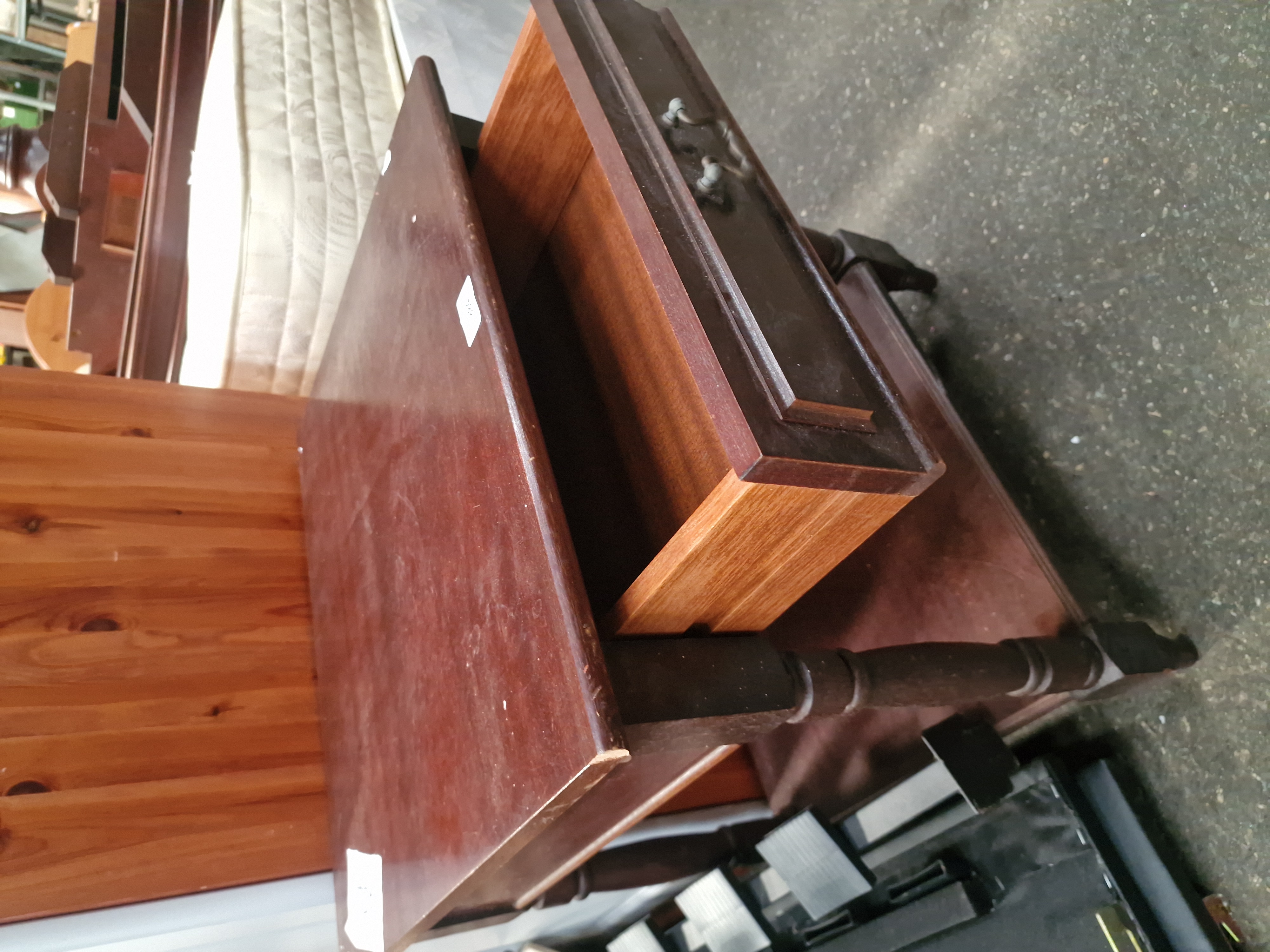 A 20th-century mahogany-stained side or lamp table constructed in the George III style. The rectangular top sits above a single frieze drawer featuring dovetailed construction and a brass-effect swan-neck handle. The table is supported by four legs with turned and block sections, which are united by a rectangular lower tier shelf. No manufacturer marks, stamps, or labels are present on the piece.