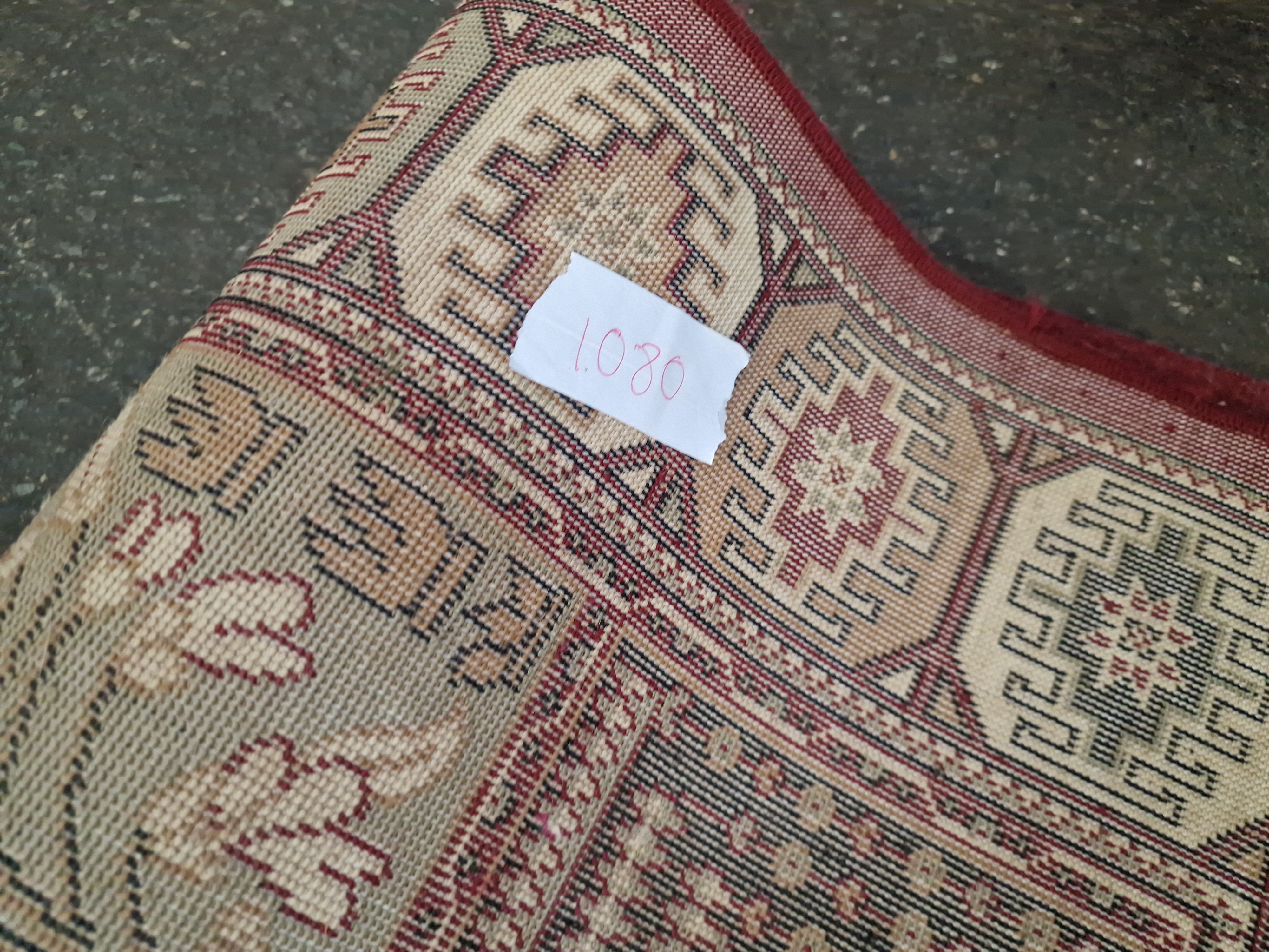 The rug shows signs of moderate use. There are visible areas of surface marking and pile crushing, particularly noticeable within the lighter cream sections of the panels. The edges and pile appear generally intact with no significant fraying or structural damage observed.