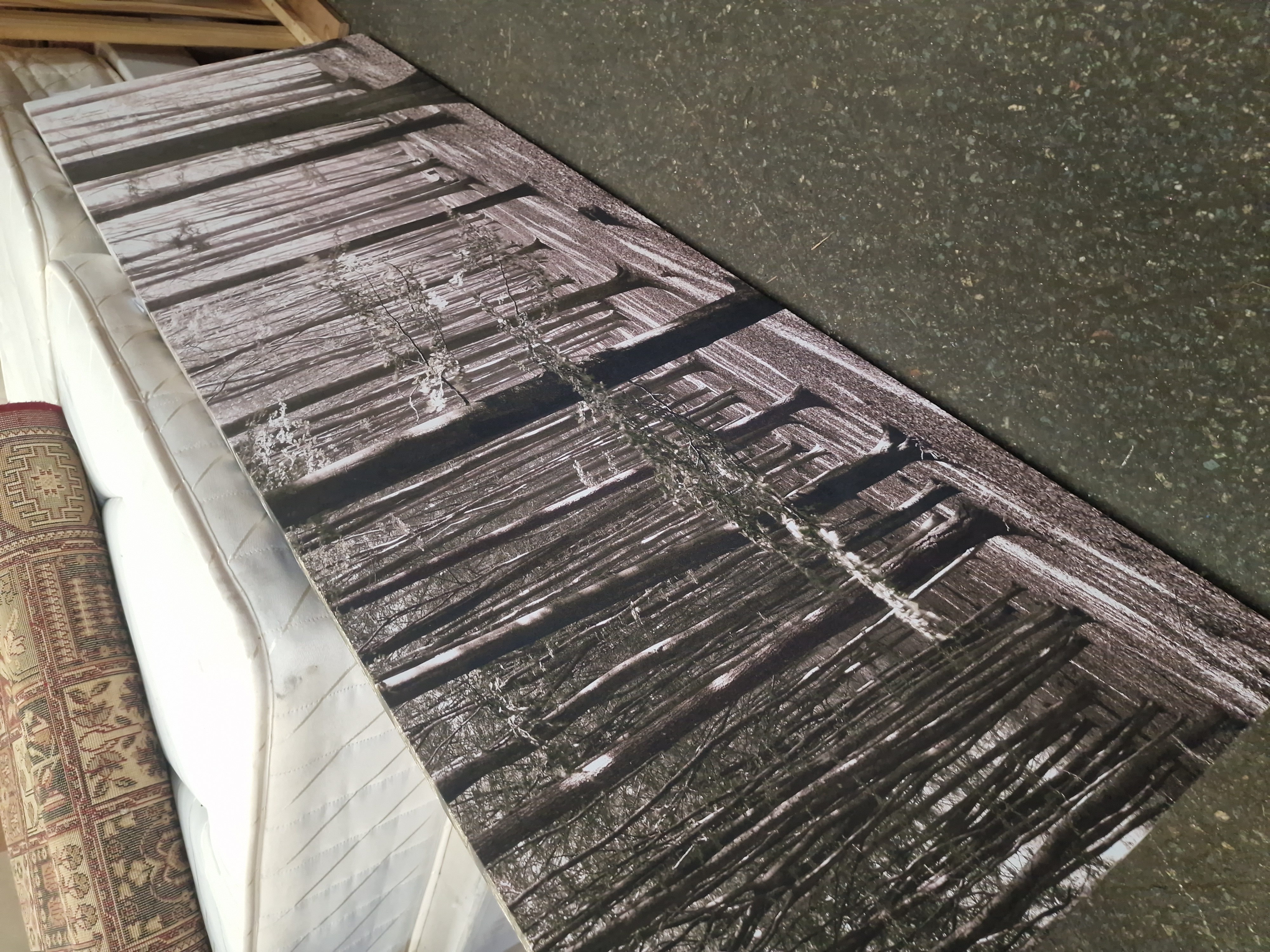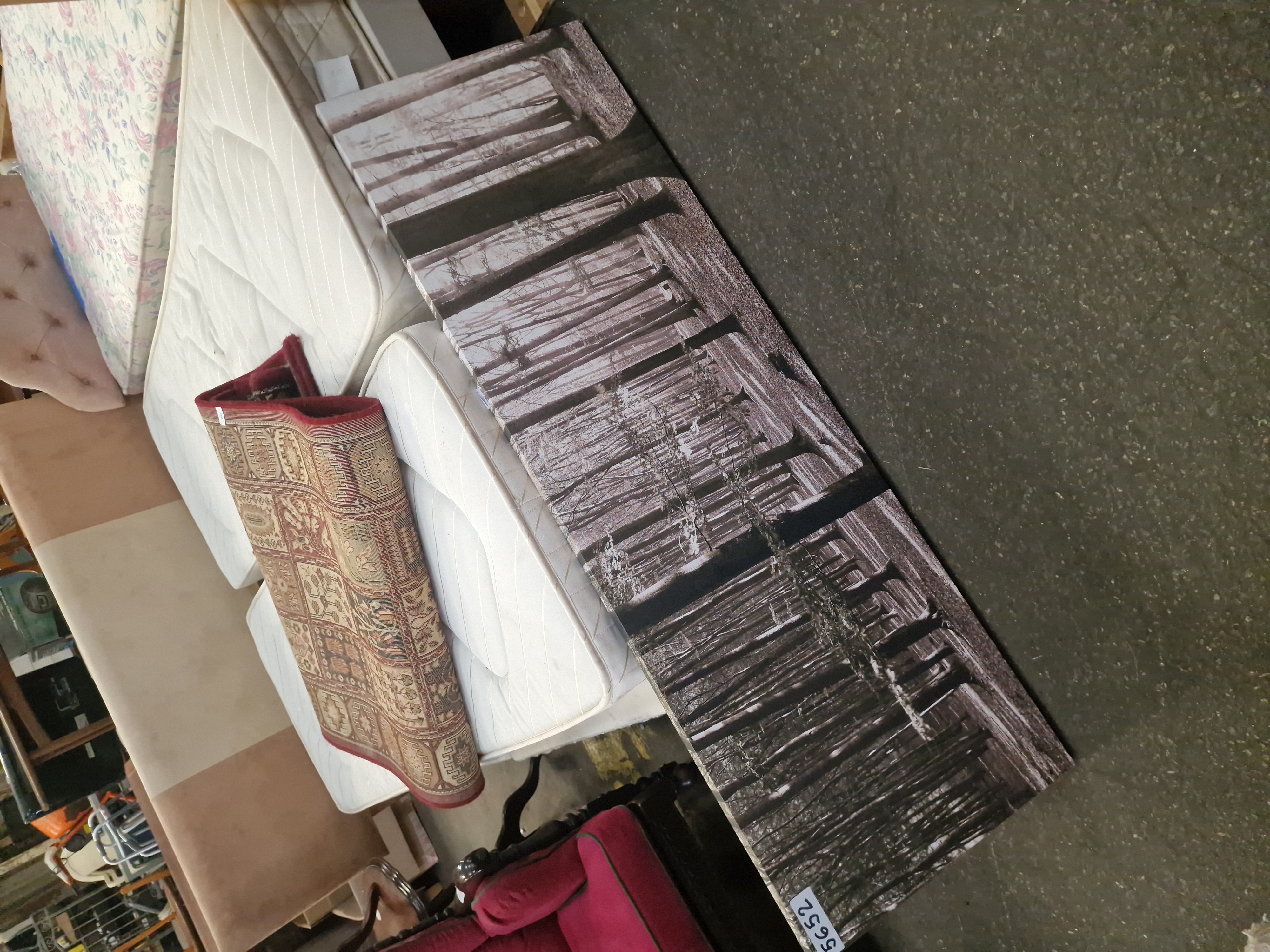 A large contemporary photographic print on canvas depicting a winter woodland landscape with dense, slender tree trunks. The composition is rendered in a muted, sepia-toned palette. The work is a gallery-wrapped canvas stretched over an internal wooden frame, designed for display without an external frame. A small white adhesive label with the printed characters 5652 is affixed to the lower corner. No artist signature, date, or further markings are visible on the front of the work. The item is shown in a warehouse environment alongside various household goods.