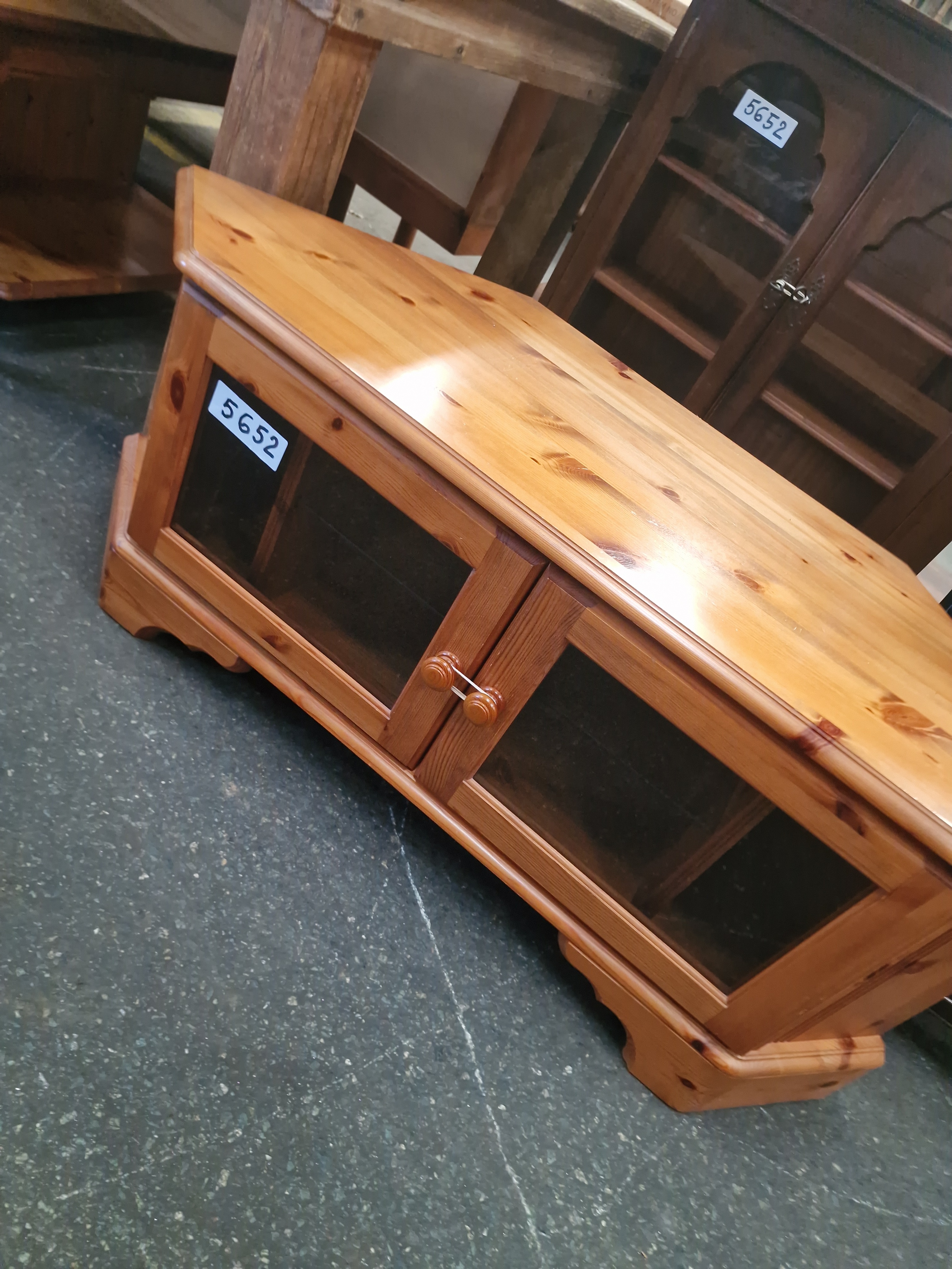 A modern knotty pine corner media cabinet, attributed to Ducal. The unit is of single-piece construction with a light honey-coloured polished finish. The front features two cabinet doors, each fitted with a single pane of clear glass and turned wooden door knobs. The interior provides a single cupboard space for media components. The cabinet sits on a continuous plinth base with a decorative scalloped front apron. No manufacturer marks are present, though auction lot stickers are visible on the glass and top surface.