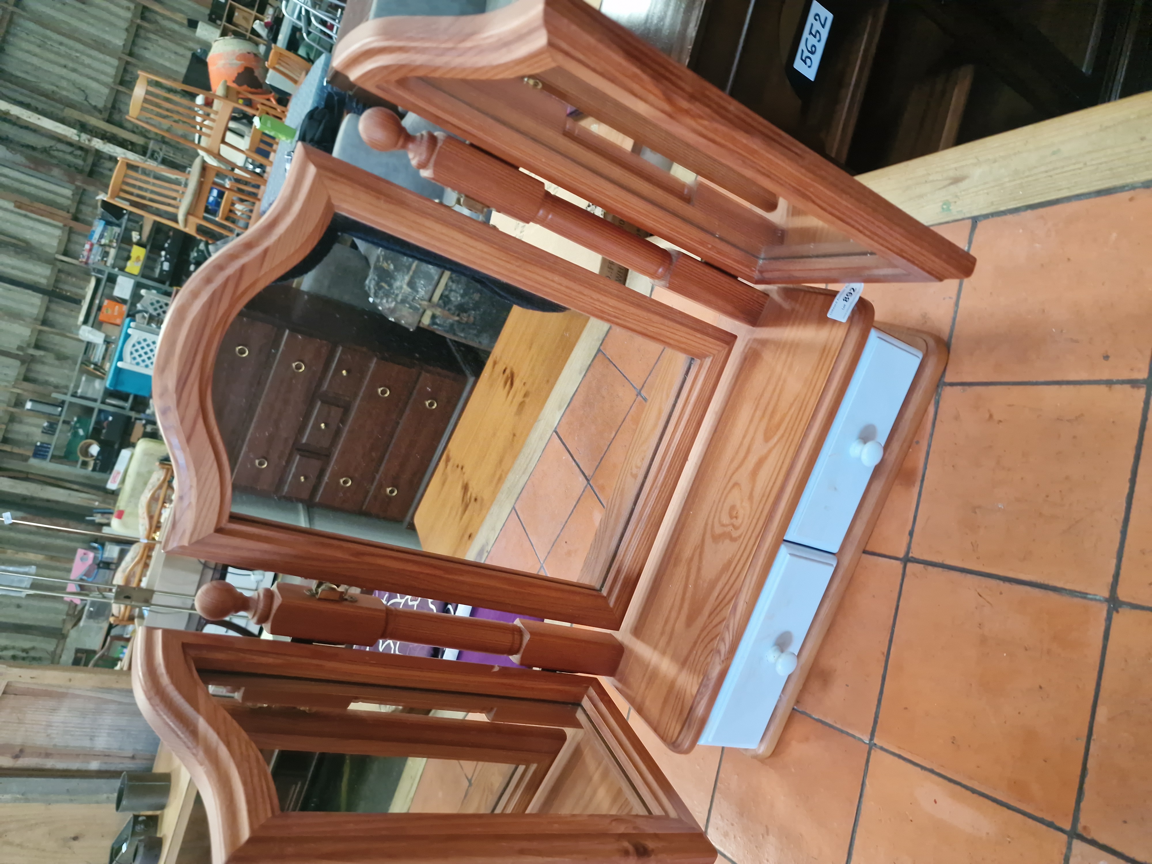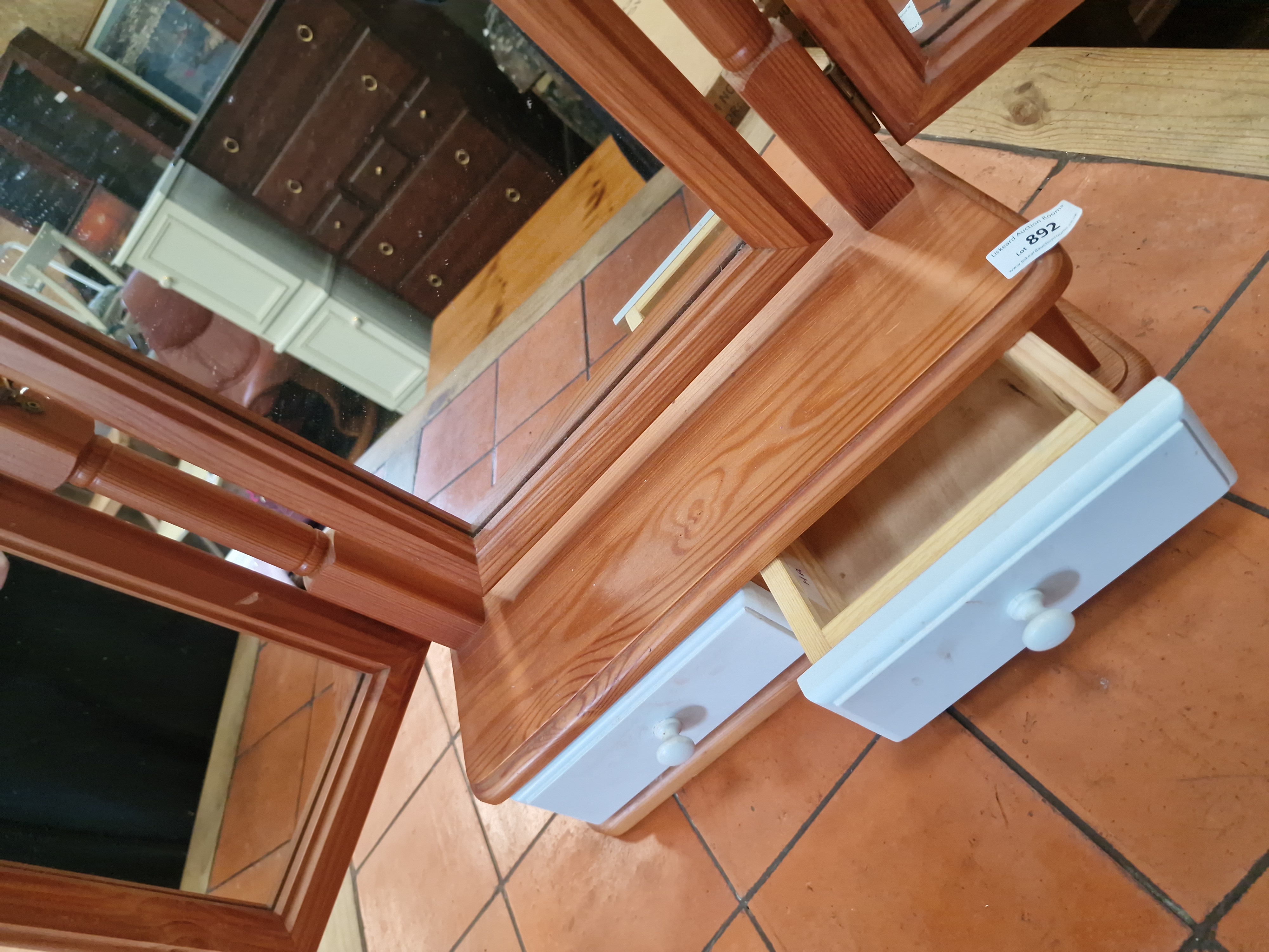 The item is in good overall condition. The mirror plates are clear with no visible foxing or loss of silvering. The pine frame shows minor surface wear consistent with age and use. The drawers operate smoothly.
