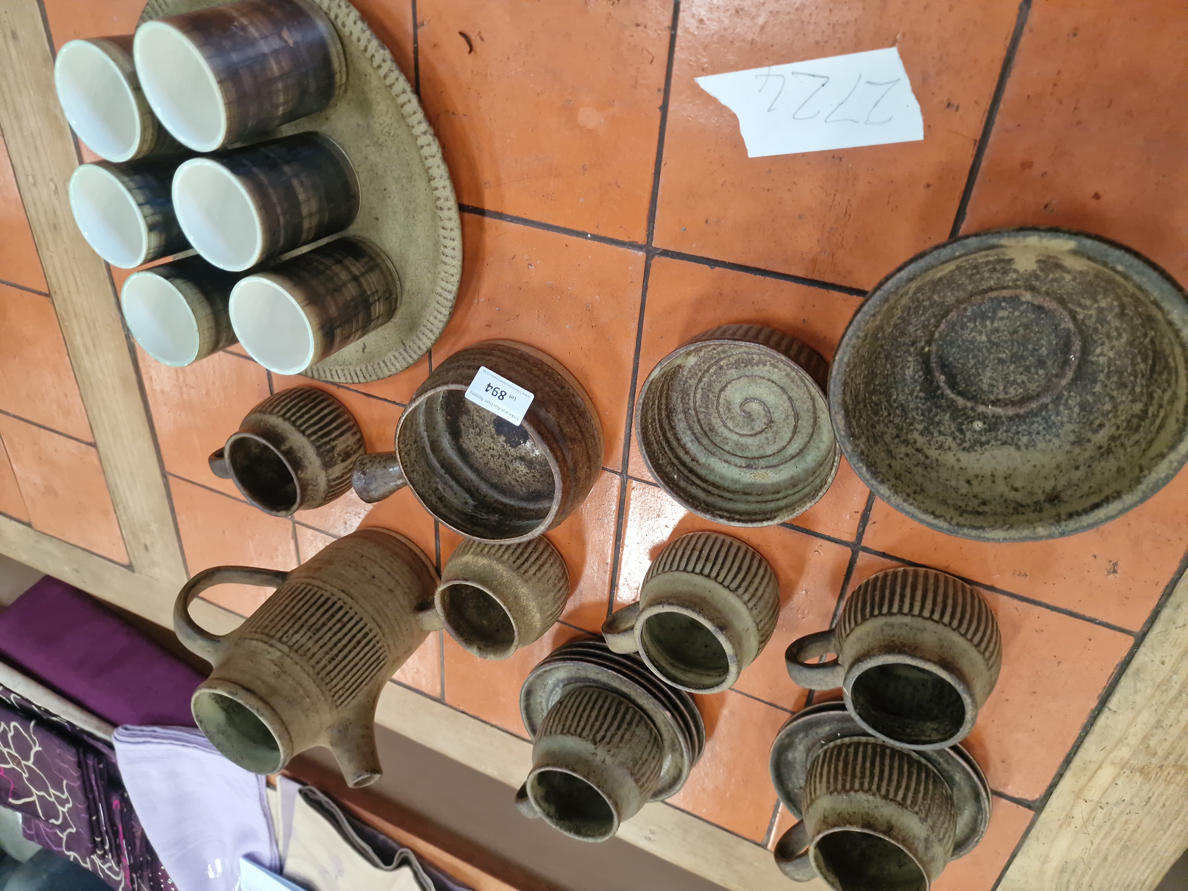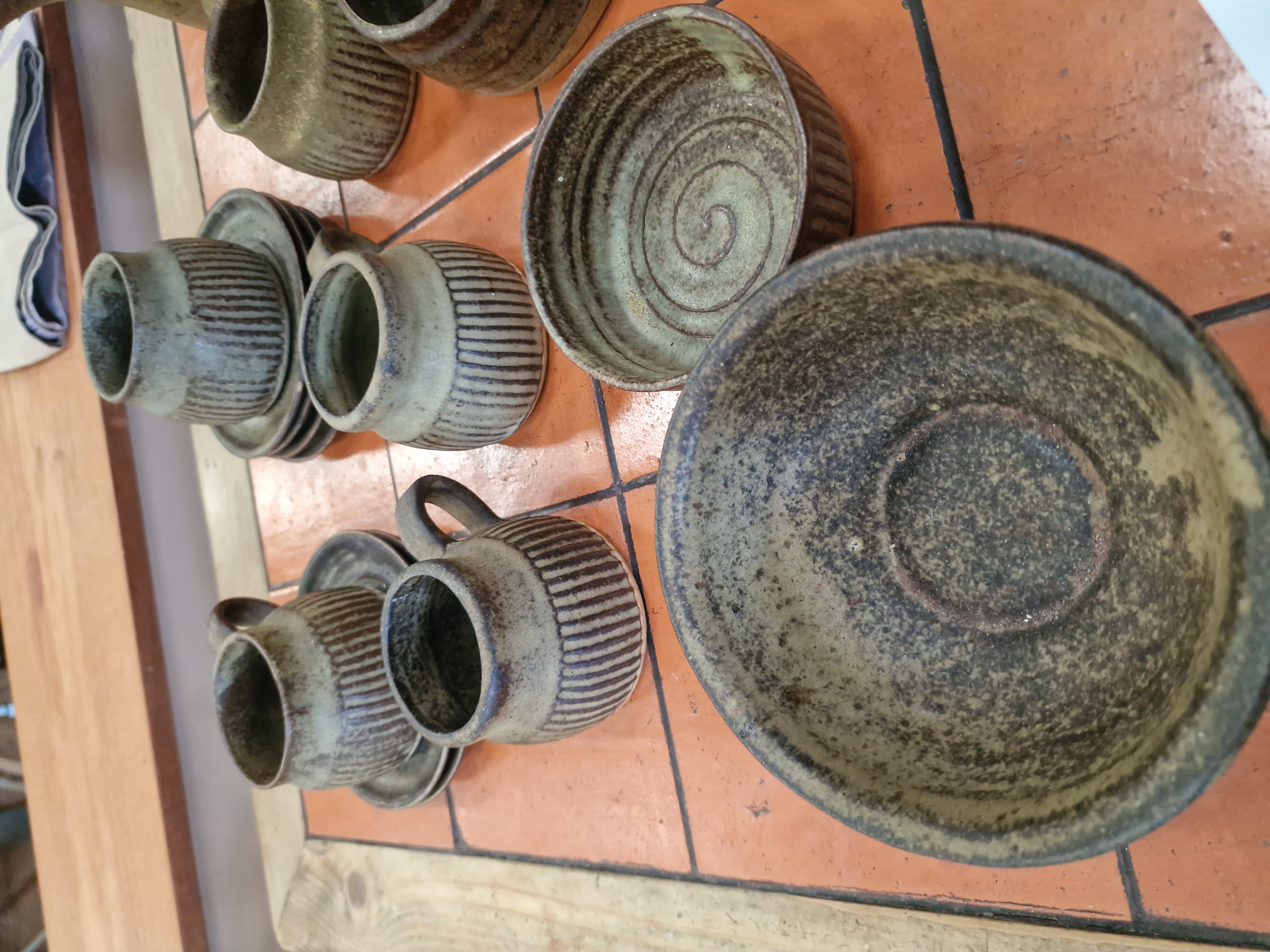 A collection of Cornish studio pottery attributed to Tremar Pottery, Liskeard. The stoneware set comprises a variety of tableware including a tall coffee pot with a loop handle and spout, a group of cylindrical beakers presented on a matching circular ribbed tray, several handled and handleless cups, a pair of saucers, a small bowl with an internal spiral motif, a handled pipkin bowl, and a larger open bowl with a dark speckled metallic-effect glaze. The pieces are primarily decorated with hand-incised vertical linear ribbing. The glaze is a combination of mottled dark brown, ochre, and sandy-green tones, creating a textured appearance typical of the mid-20th-century studio pottery movement. The interior of the beakers is finished in a contrasting pale off-white glaze. One piece bears a paper auction lot label for Liskeard Auction Rooms.