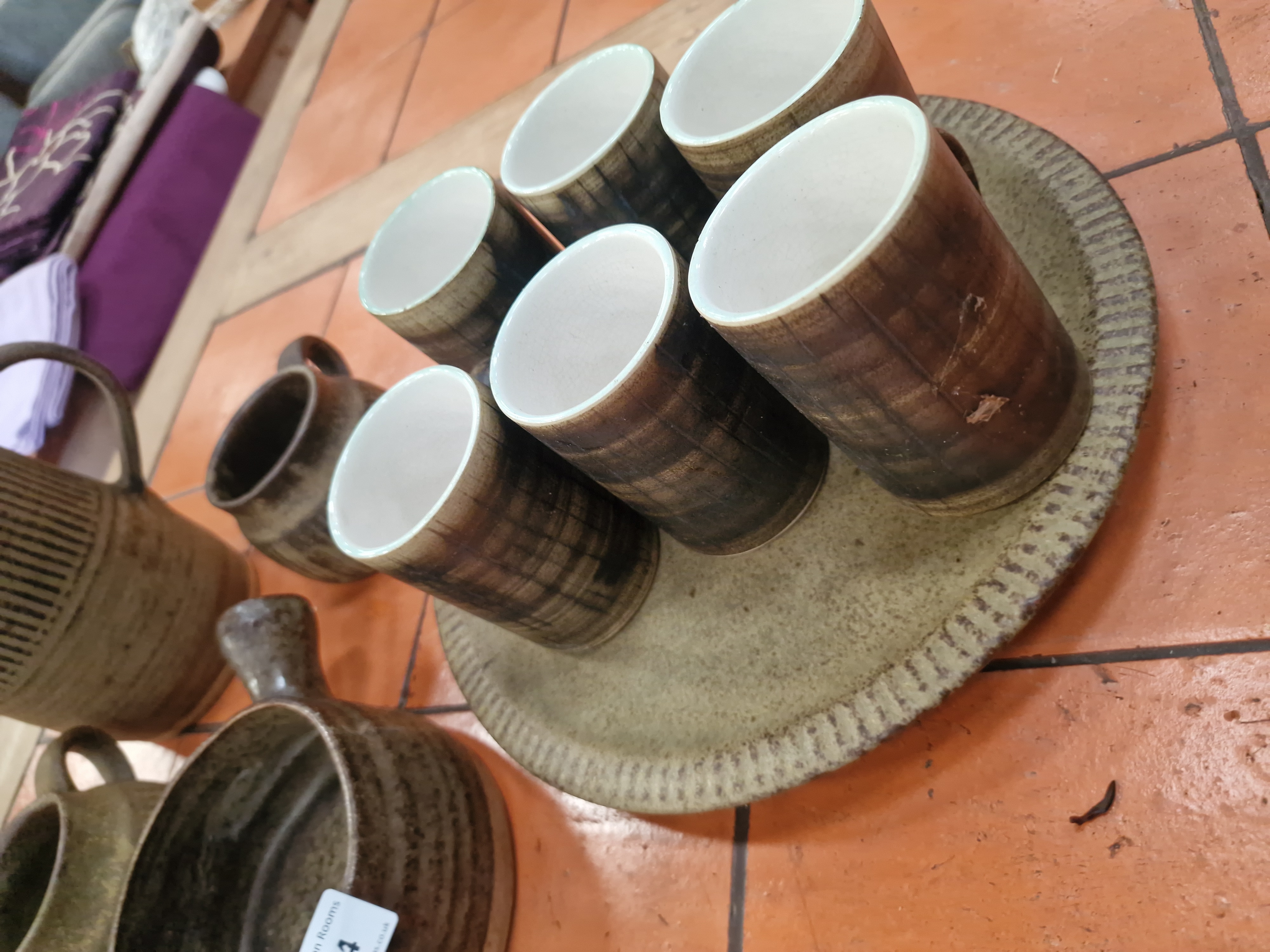 The collection is in generally good condition. There is a small area of surface wear or a minor glaze skip visible on the body of one of the beakers on the circular tray. Some light surface wear and kiln-stacking marks consistent with age and the handmade nature of the items are present.
