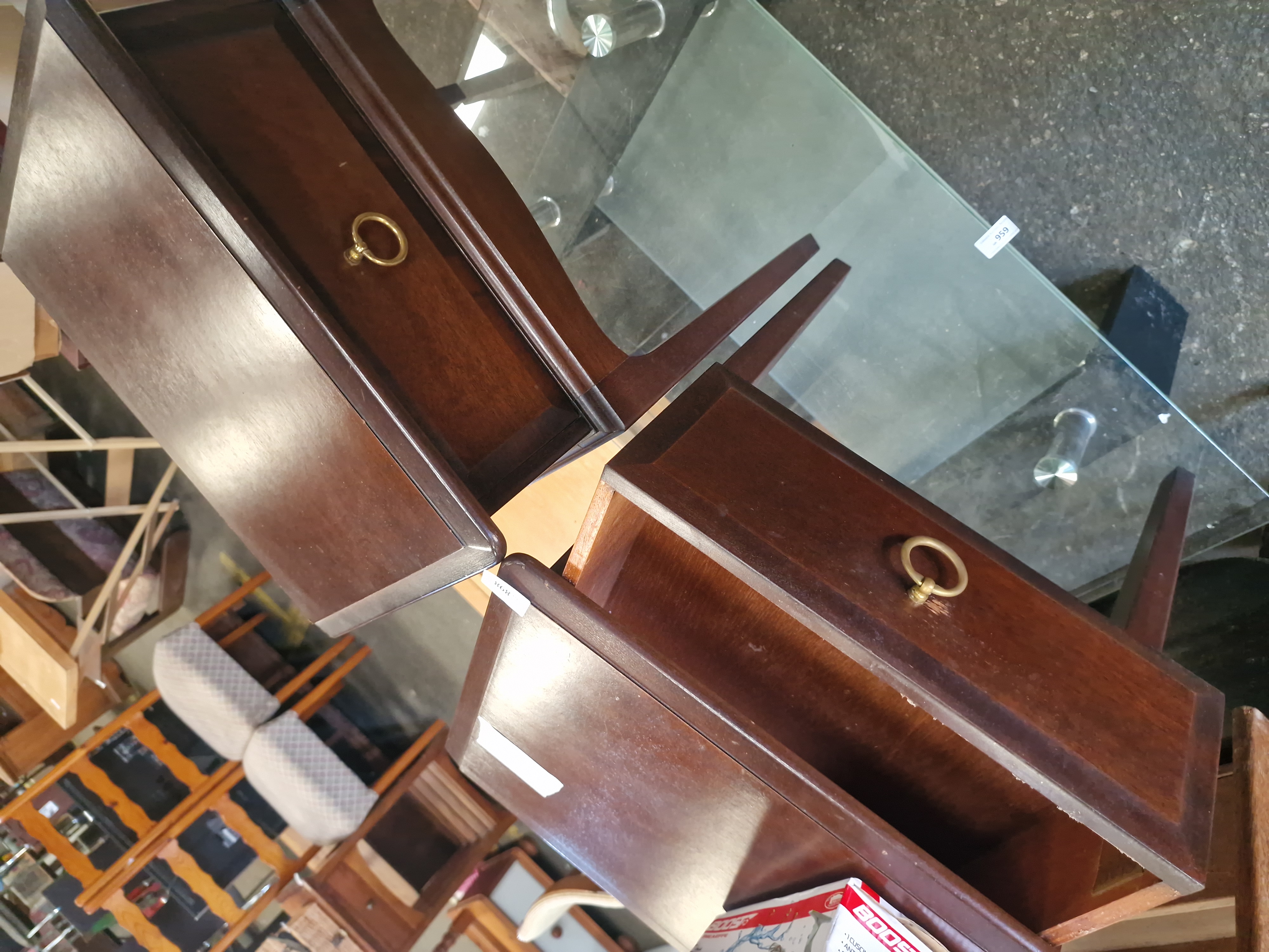 A pair of mid-century modern mahogany-stained bedside cabinets from the Minstrel range, designed by John and Sylvia Reid for Stag Furniture. Each cabinet features a rectangular top with a profiled, bevelled edge. The single drawer is constructed with a slightly arched lower apron and is fitted with a central circular brass ring pull handle. The units are raised on four integrated square-section tapering legs. While no manufacturer marks are present on the wood, the design corresponds to the Stag Minstrel range, supported by a handwritten vendor note.