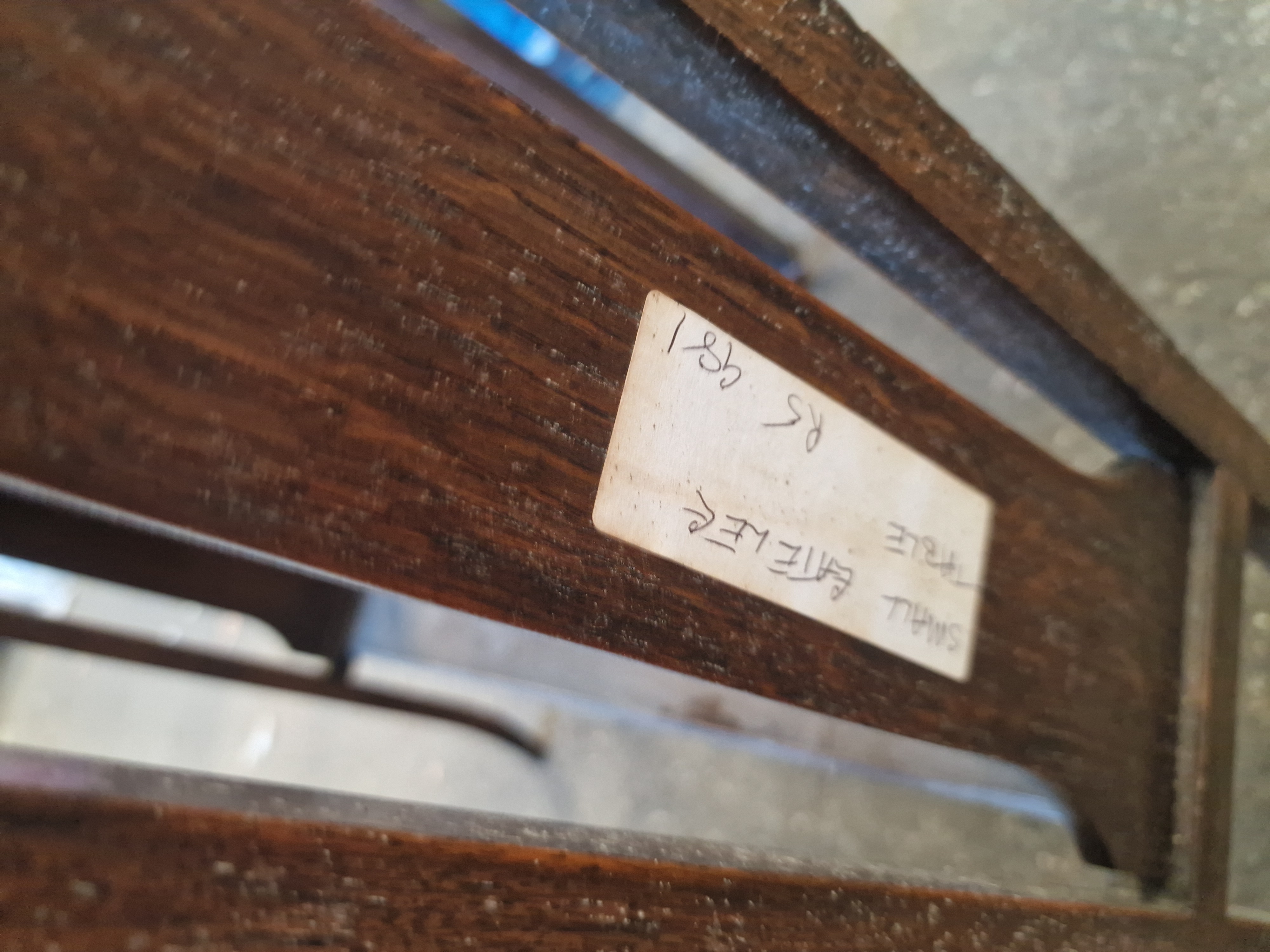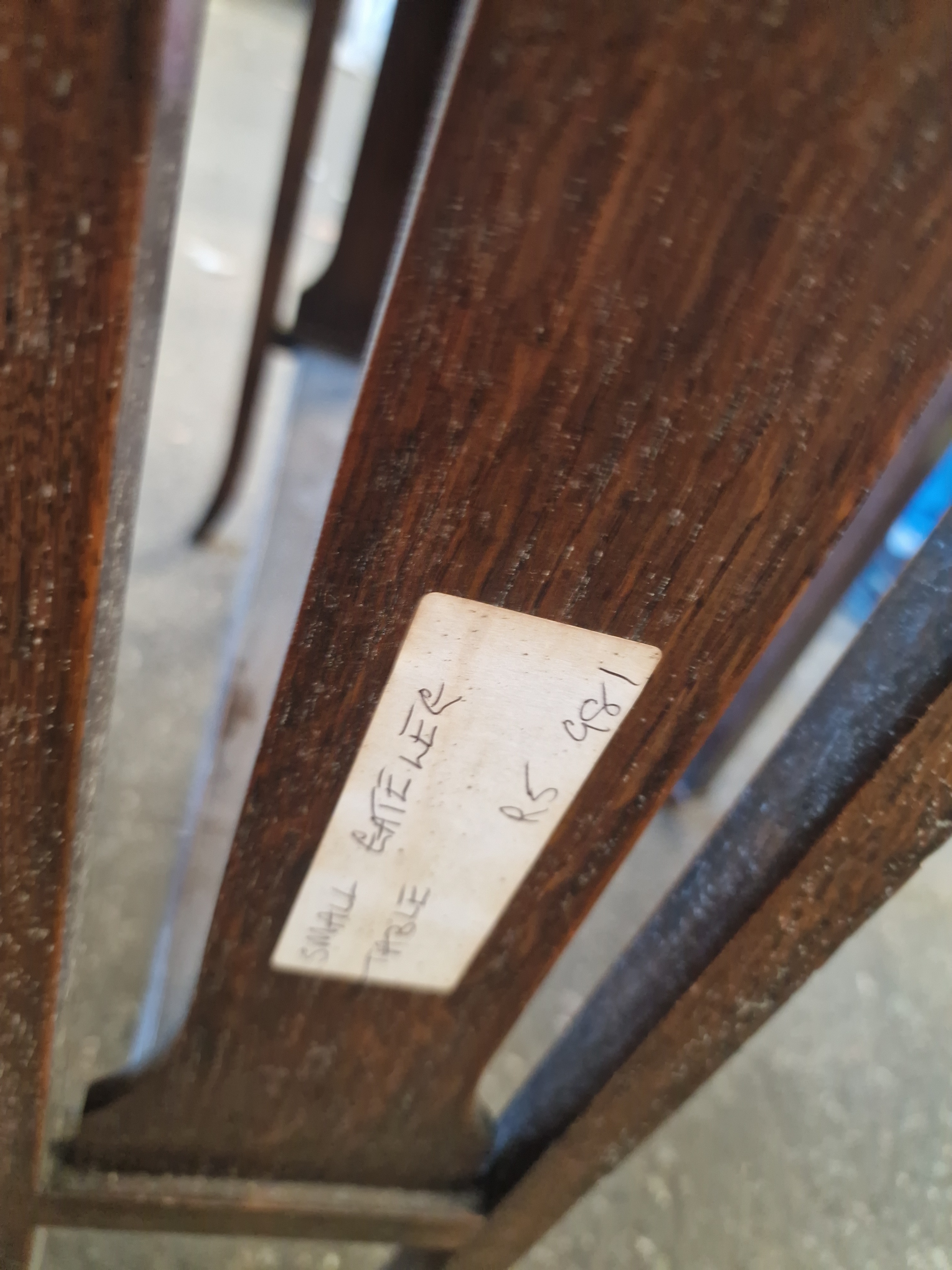A small oak gateleg drop-leaf table produced in the Jacobean revival style, dating to the early 20th century, circa 1920-1930. The piece is constructed from solid oak with a dark-stained finish. The top is oval in form when both leaves are fully extended, consisting of a narrow fixed central section flanked by two semi-oval drop-leaves. The base is composed of trestle-style end supports with shaped cut-outs, joined by a central stretcher. Two gate-action legs swing out from the frame to support the leaves. There are no visible manufacturer marks. A handwritten paper adhesive label is affixed to the underside of the base with the characters SMALL GATELEG TABLE and RS 981, which appear to be internal stock or auction identification marks.
