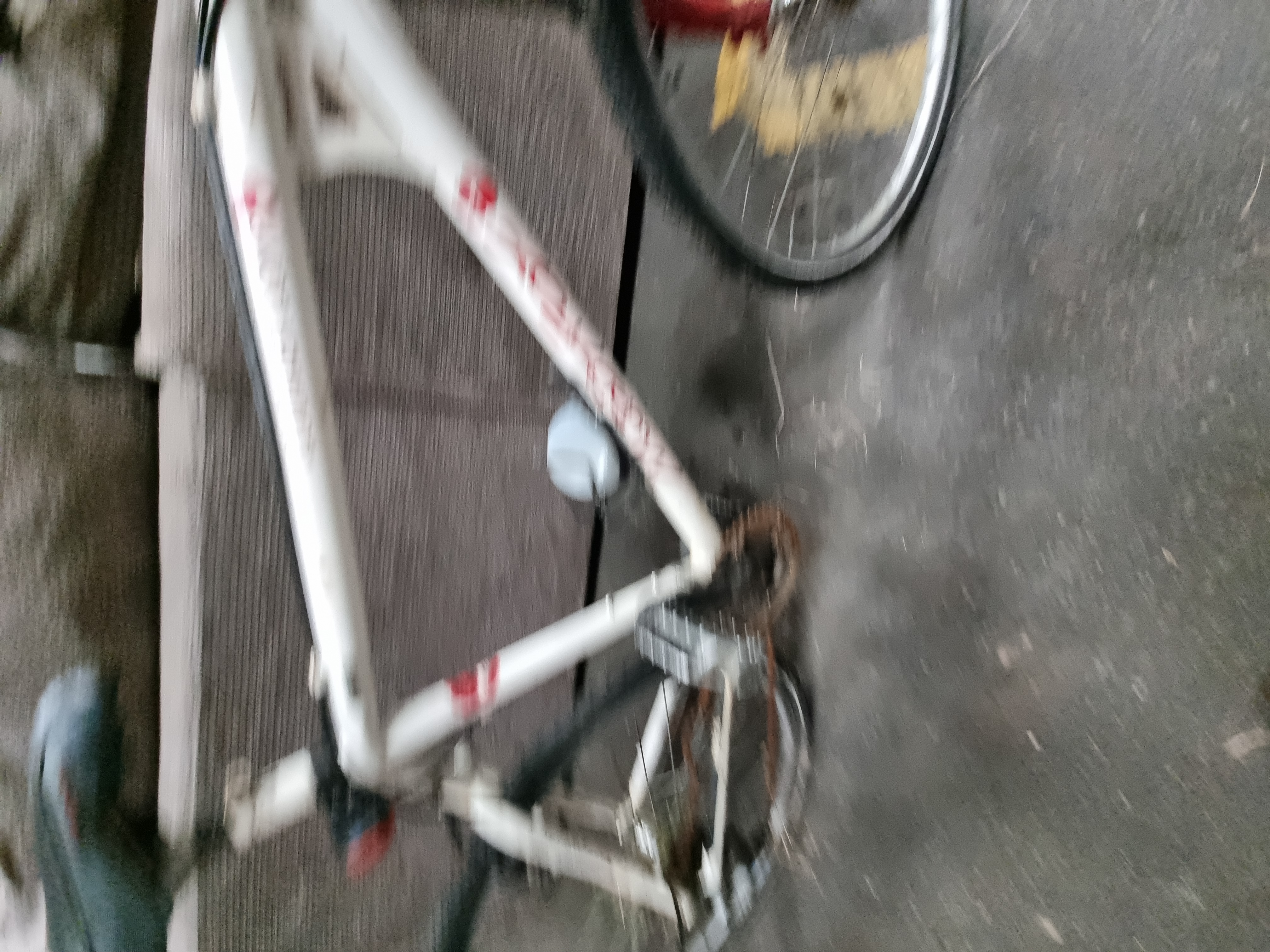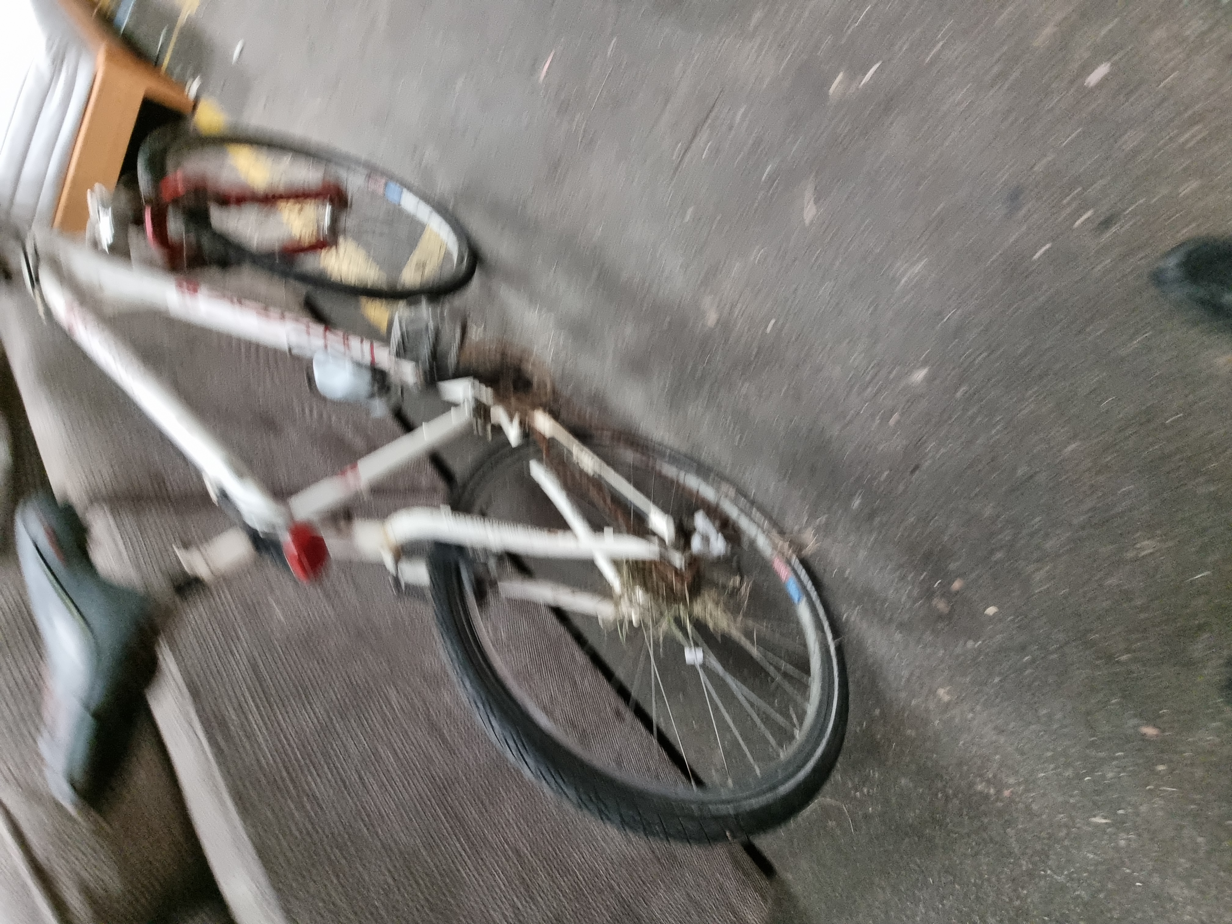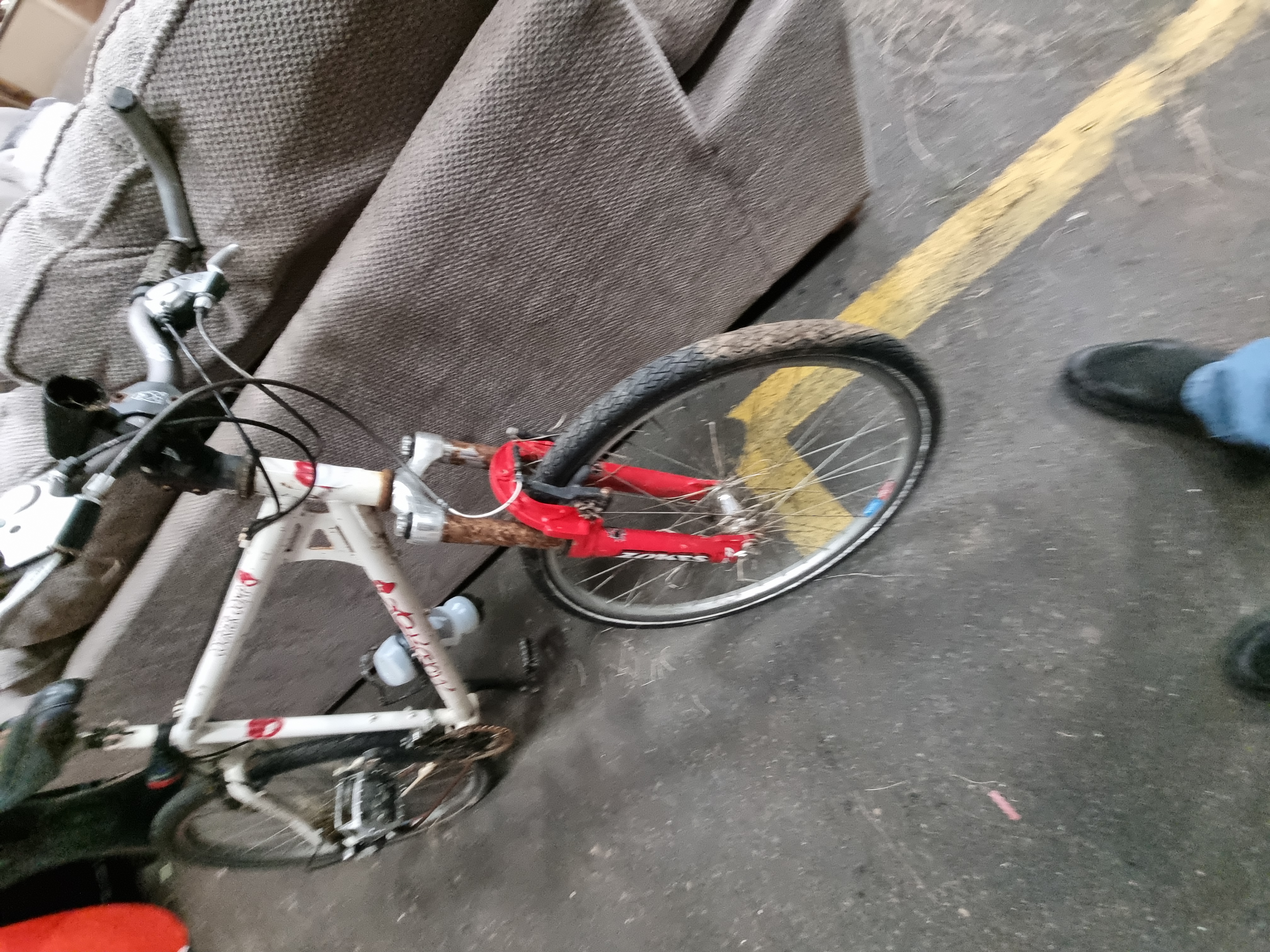 The bicycle is in a used condition showing significant oxidisation and heavy rust to the chain, gears, and front fork stanchions. There is general surface wear, scuffing, and dirt throughout the frame and components.