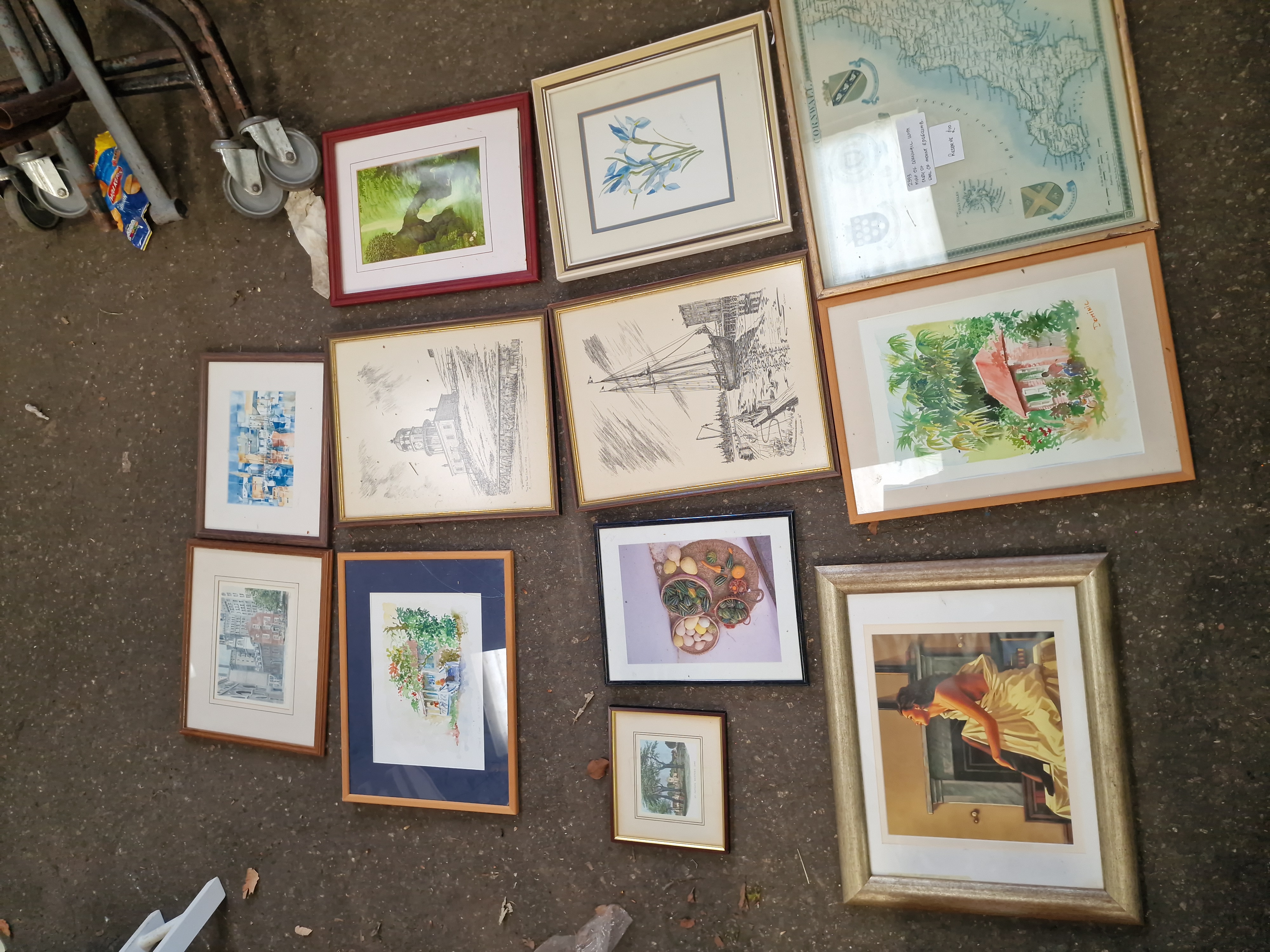 Lot 904: Dominic, A Collection of Framed Artworks including Watercolours, Prints, and a Map of Cornwall (Inscribed)
