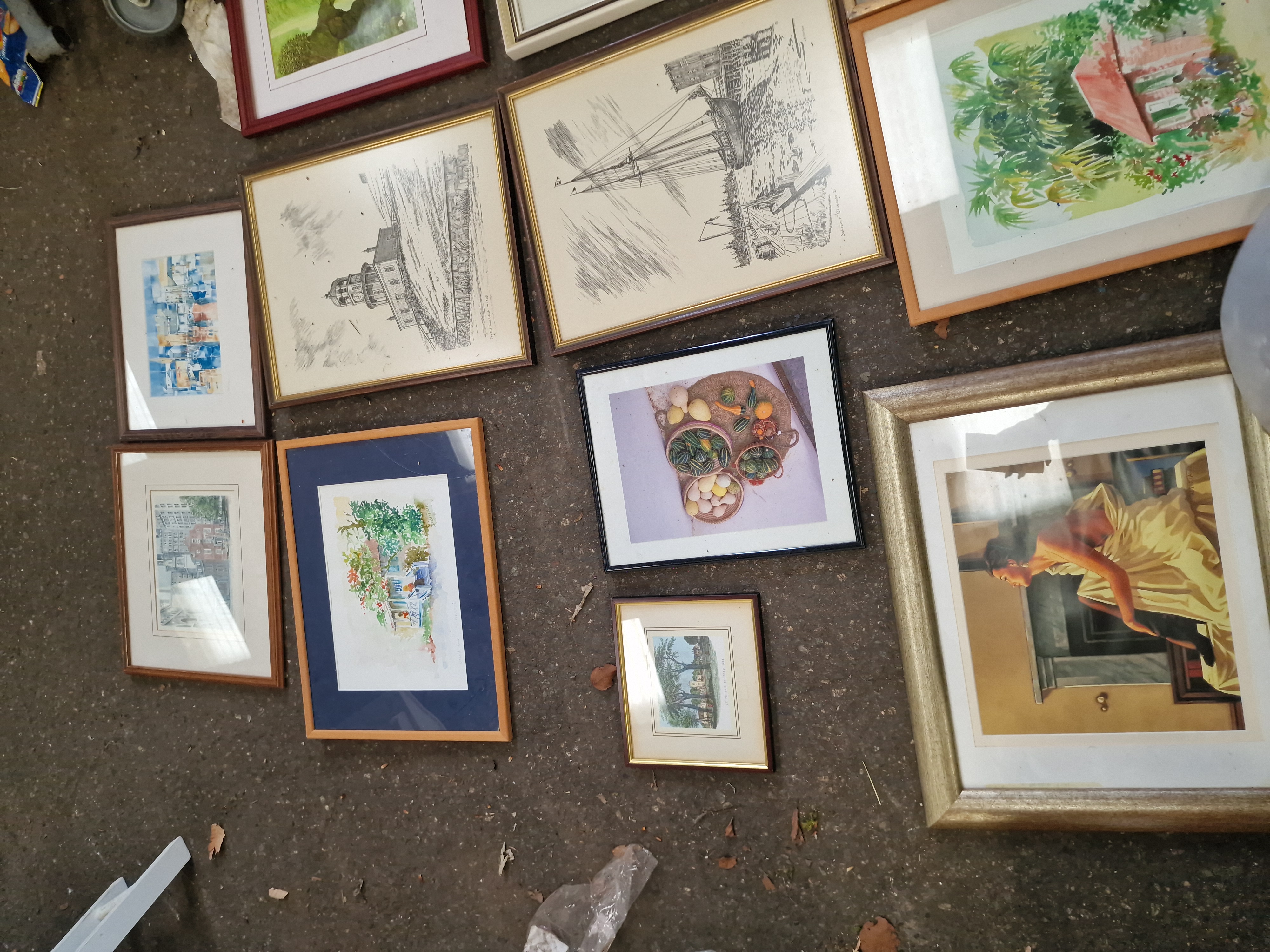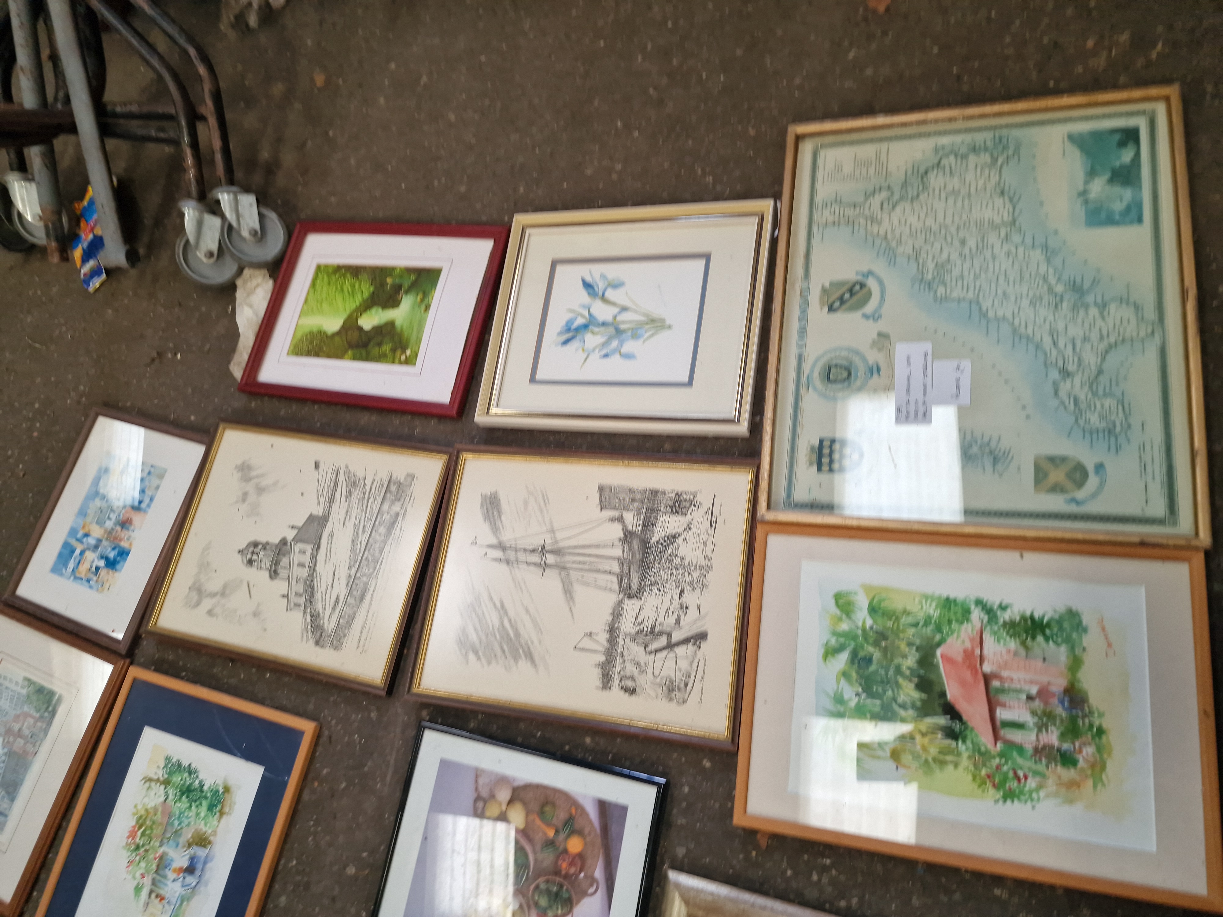 A collection of framed artworks featuring various mediums including watercolours, pen and ink drawings, photographs, and prints on paper. The subjects include maritime scenes with sailing ships and a lighthouse, architectural street scenes, botanical studies of irises, a still-life photograph of gourds and eggs, a figurative print depicting a woman in a yellow dress, and a map of Cornwall decorated with armorial bearings. One watercolour depicting a tropical structure is inscribed Dominic in the upper right corner. The map of Cornwall retains a contemporary auction lot label. The works are presented in a variety of frames including gilt wood, stained timber, modern painted wood, and thin metal sections, all under glass.