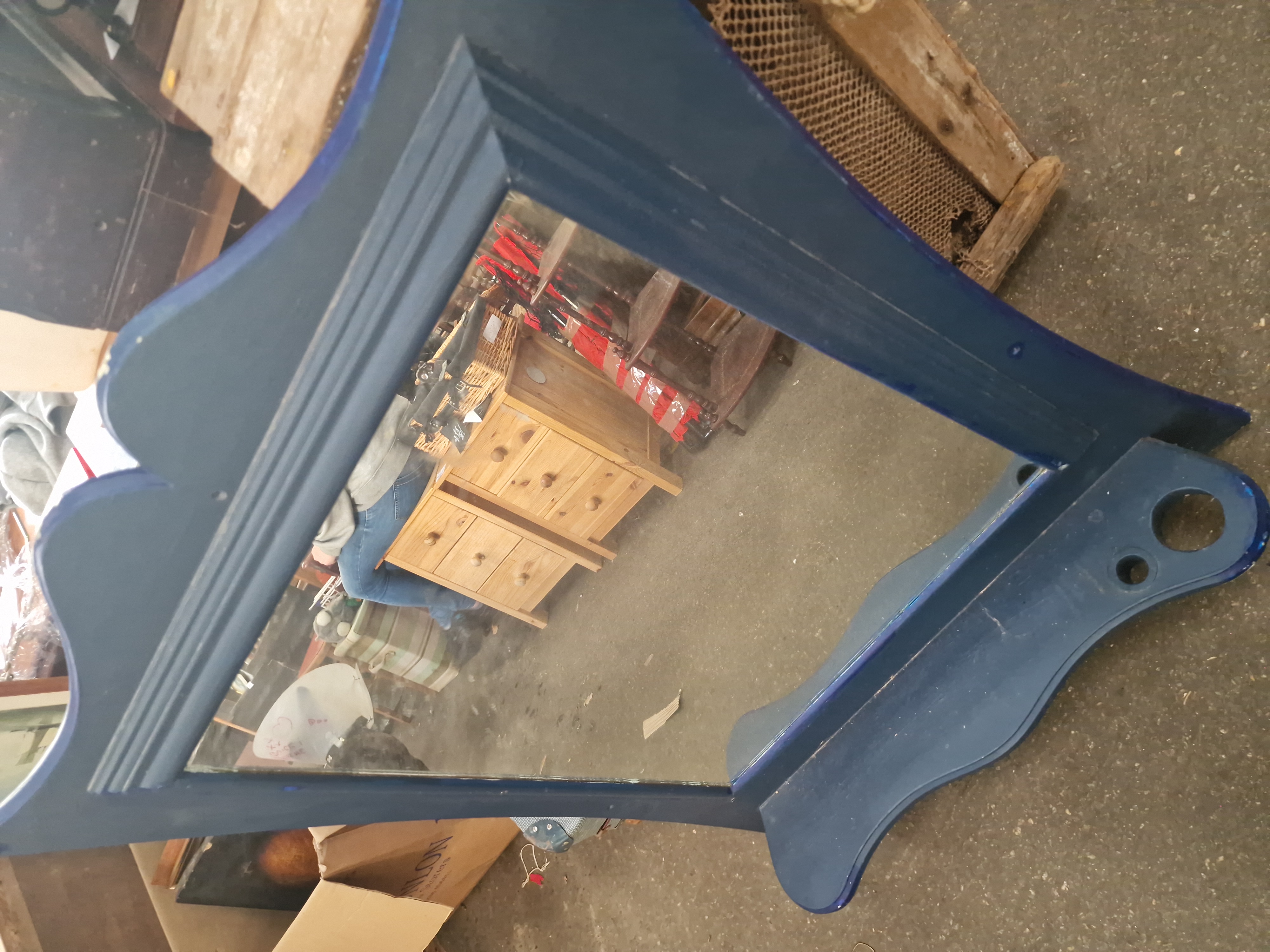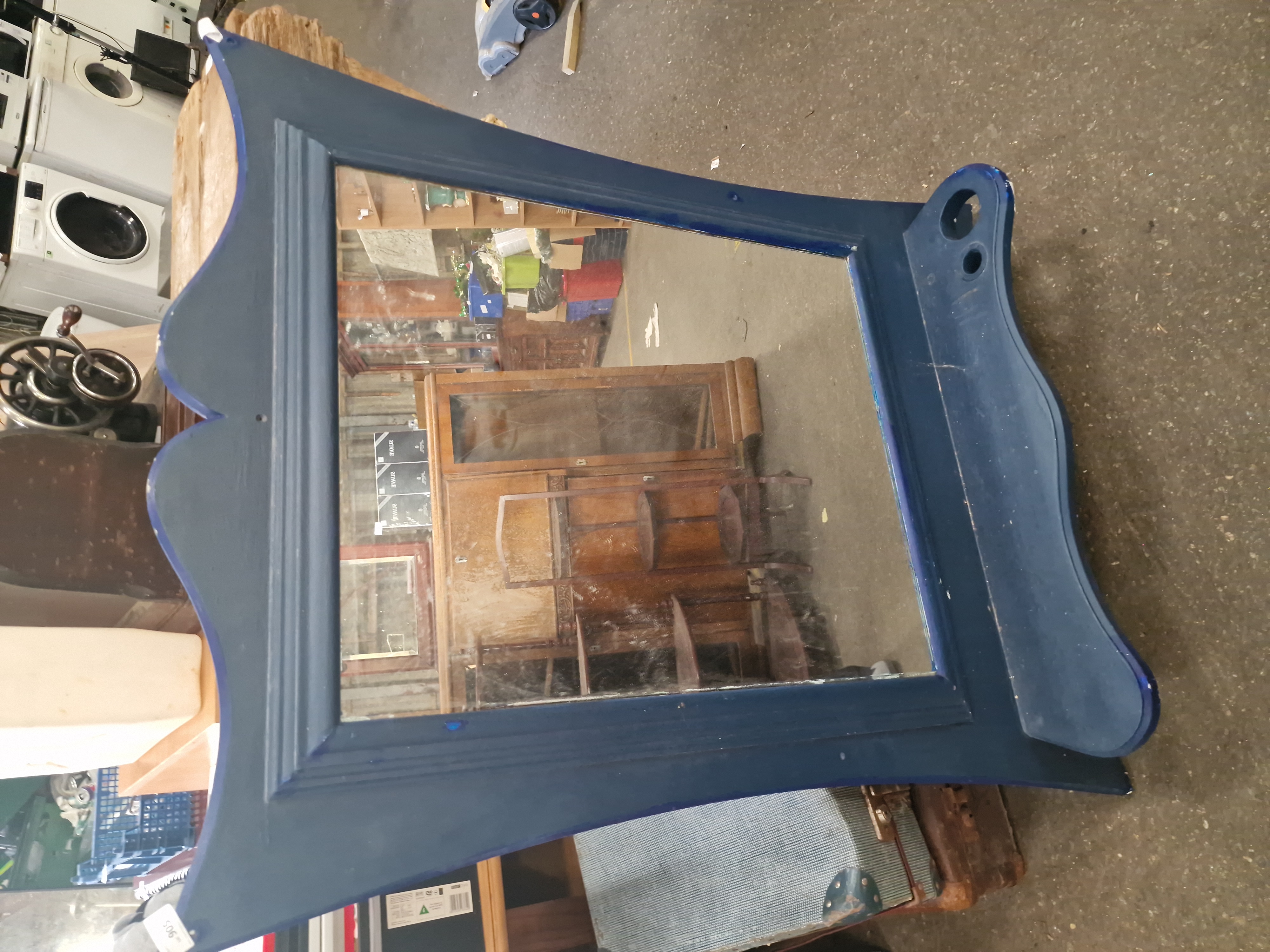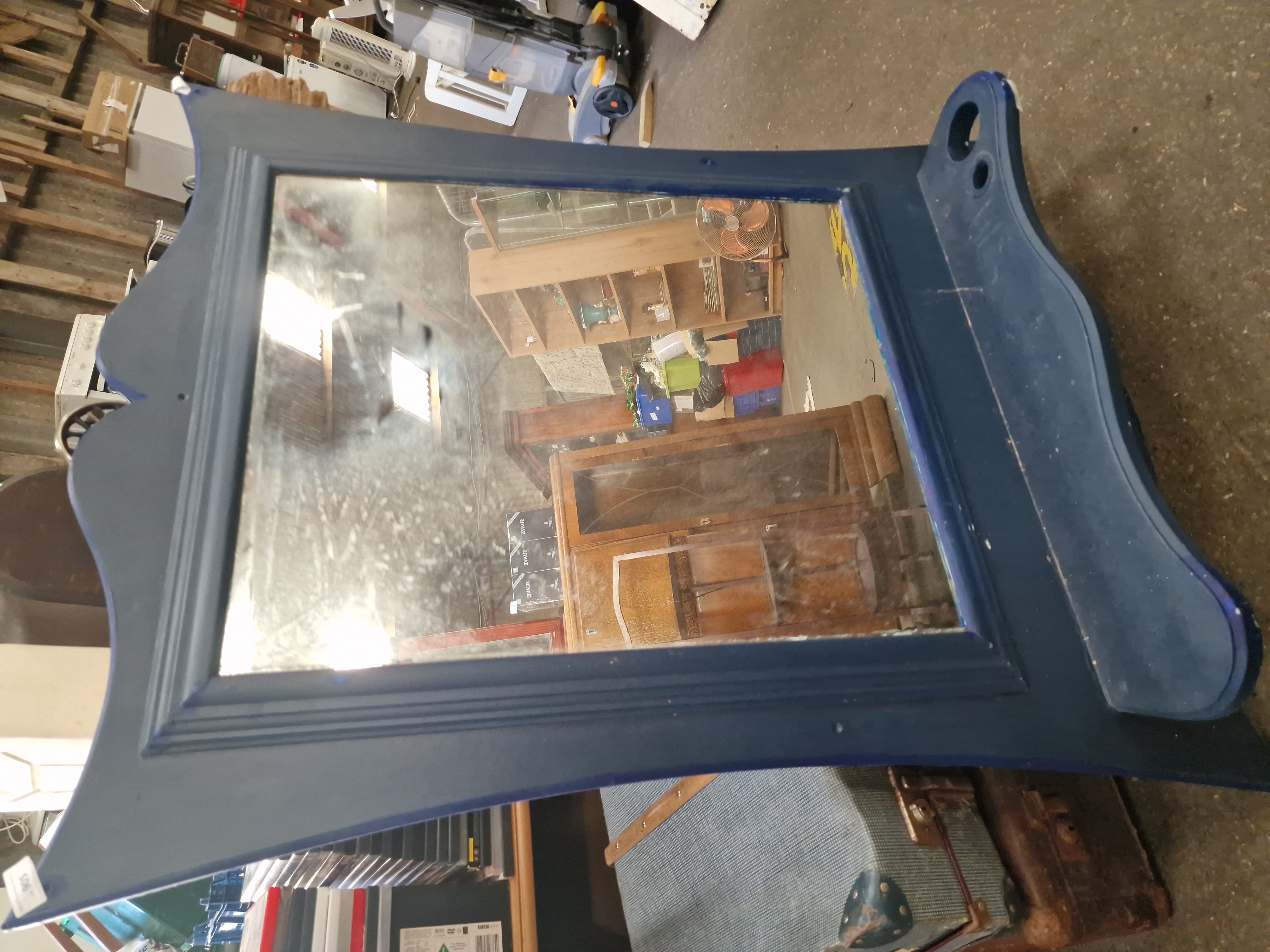 Lot 905: An early to mid-20th-century navy blue painted wooden wall mirror with integral shelf