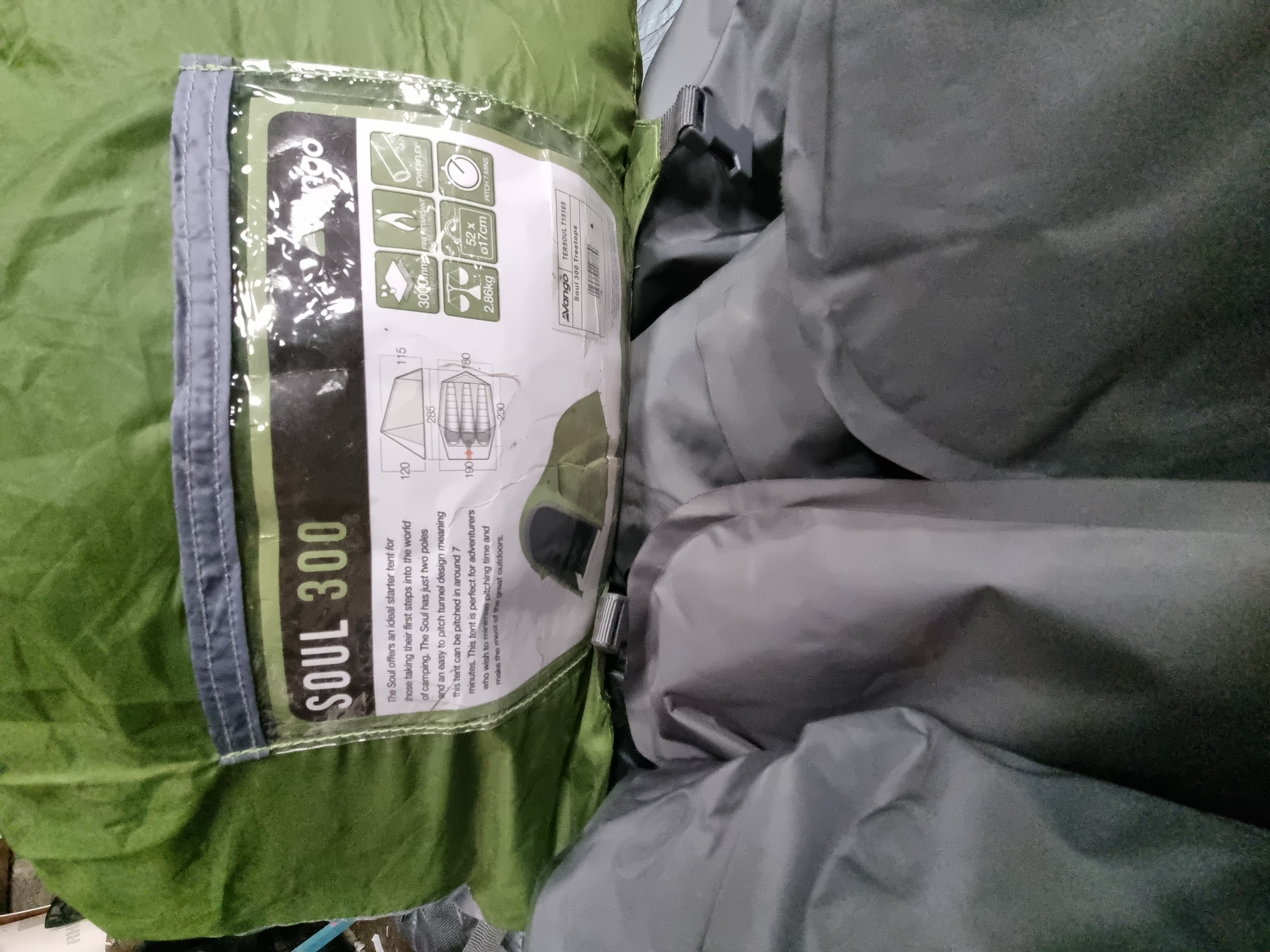 This lot consists of a Vango Soul 300 three-person tunnel tent and two inflatable mattresses, forming a collection of four items. The tent is identified by the Vango brand mark and model Soul 300, with the SKU TERSOUL T15165. It is housed in a green carry bag featuring technical specifications such as a 3000mm hydrostatic head and PowerFlex fibreglass poles. The accompanying grey camping accessories include two inflatable mattresses; one is shown laid out as a single-person mat with a corner-mounted valve. The items are presented in an open-box or loose condition. Total quantity is four items, comprising one tent and three accessory bundles.