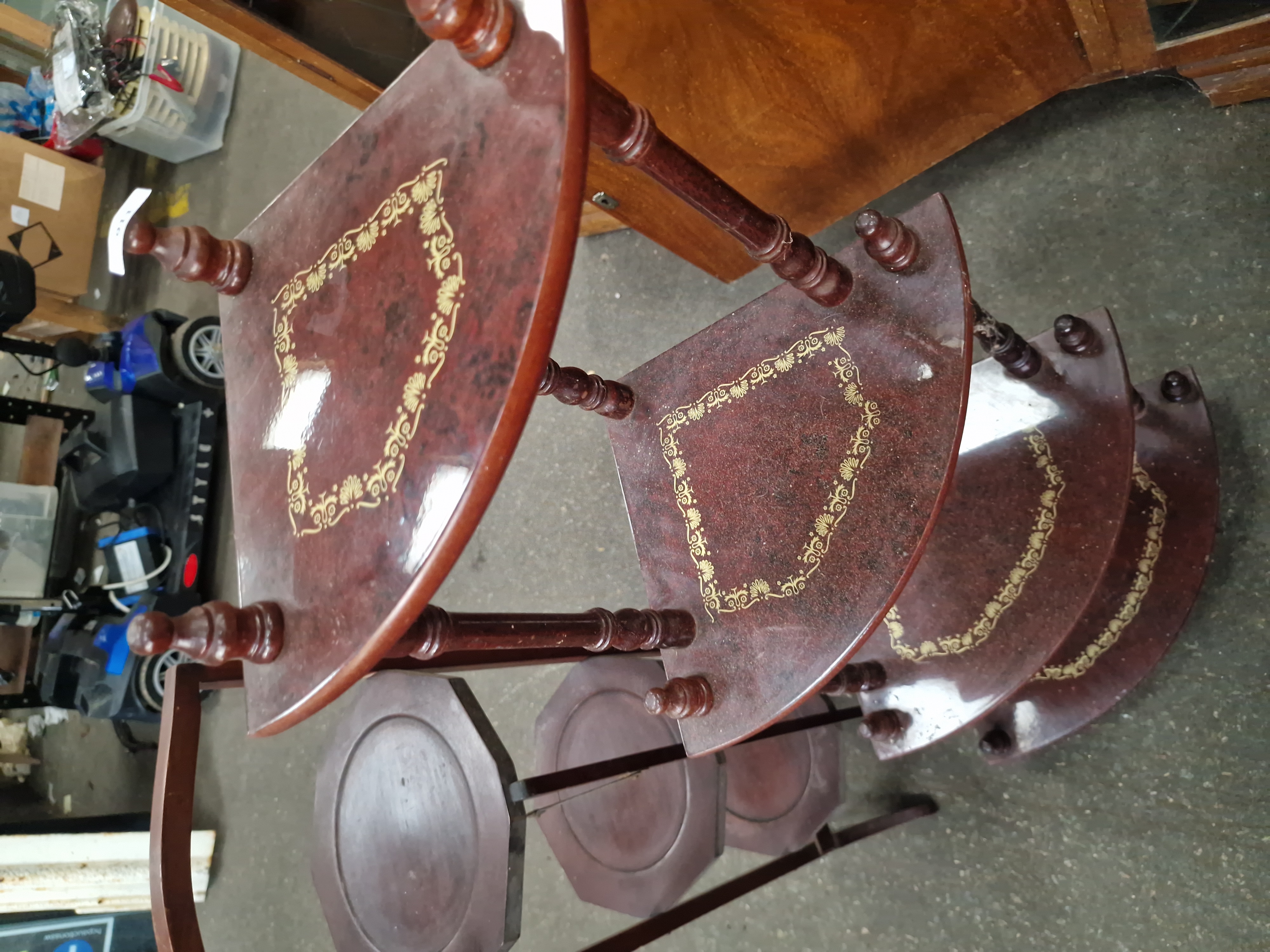 A late 20th-century reproduction corner whatnot or etagere in the Victorian style. The piece is constructed from wood with a dark red faux-marbleised or lacquered finish. It features four graduated quarter-round shelves, each embellished with a gilt transfer-printed foliate border. The structure is supported by turned spindle uprights terminating in acorn-style finials. This is a fixed, one-piece construction with non-adjustable shelves.