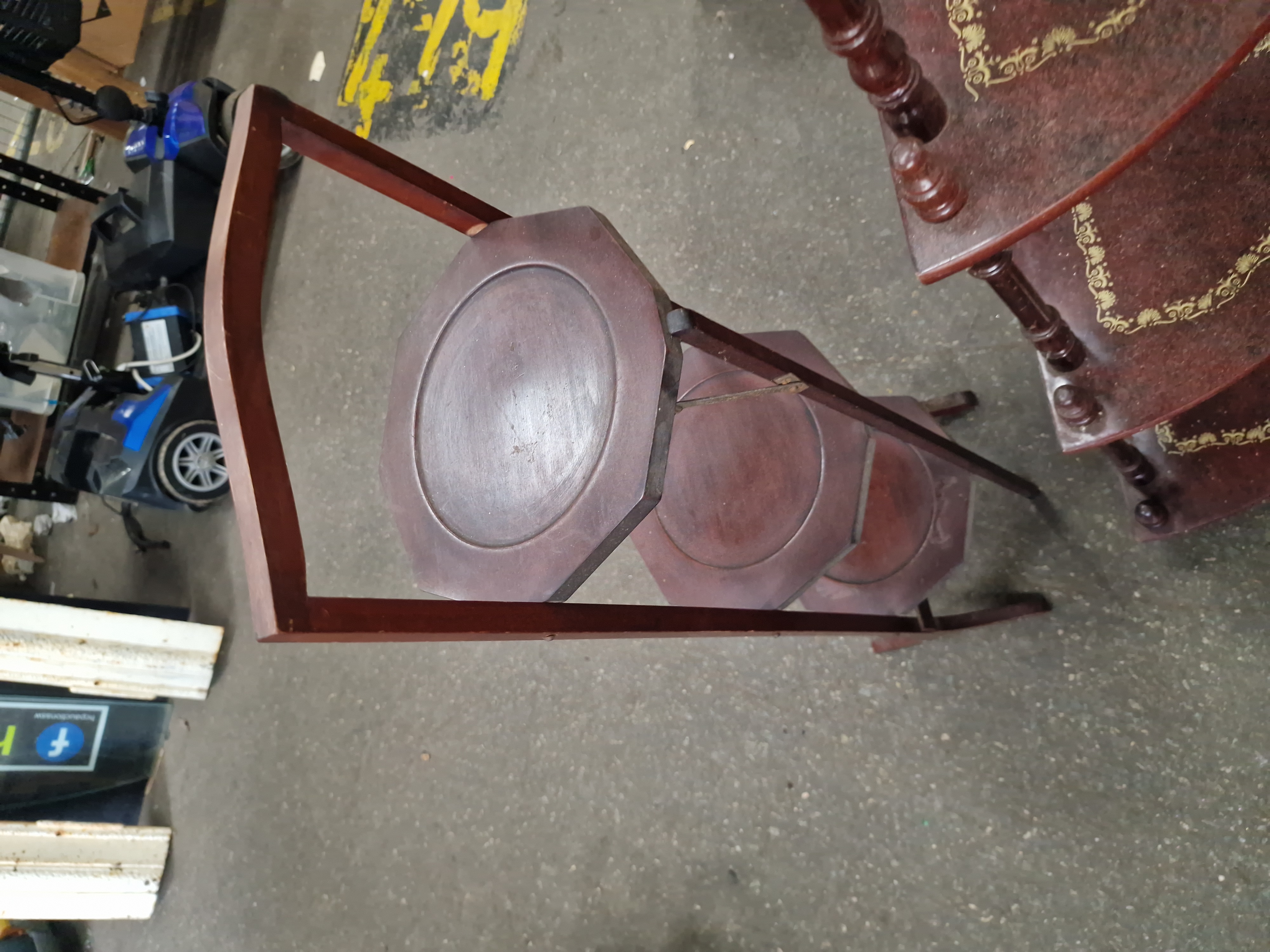 Accompanied by an early 20th-century folding cake stand in the Edwardian style. Constructed from mahogany-stained hardwood, the stand comprises three octagonal shelves, each featuring a recessed circular centre. The shelves are mounted within a folding A-frame stand topped with an arched carry handle. The folding mechanism allows for flat storage, and the shelves are fixed to pivoting supports.