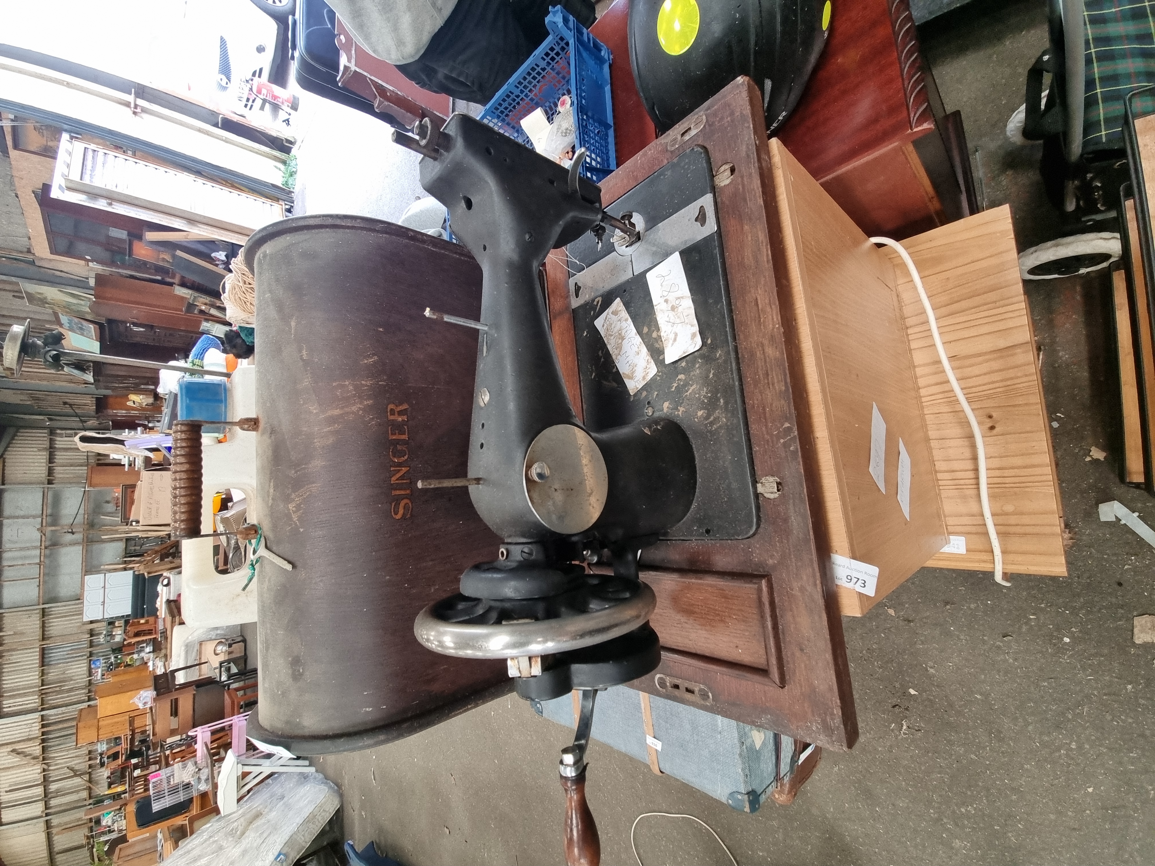 A Singer hand-crank sewing machine featuring a black-finished cast iron body with a textured crinkle finish. The machine is mounted on a rectangular wooden base and is operated by a manual hand-crank mechanism with a turned wooden handle and a chrome-finished handwheel. The lot includes a matching domed wooden carry case featuring the manufacturer name SINGER in gold-toned lettering to the front. The machine bed has two small white adhesive labels affixed with handwritten notations including the digits 2, 8, and 9.