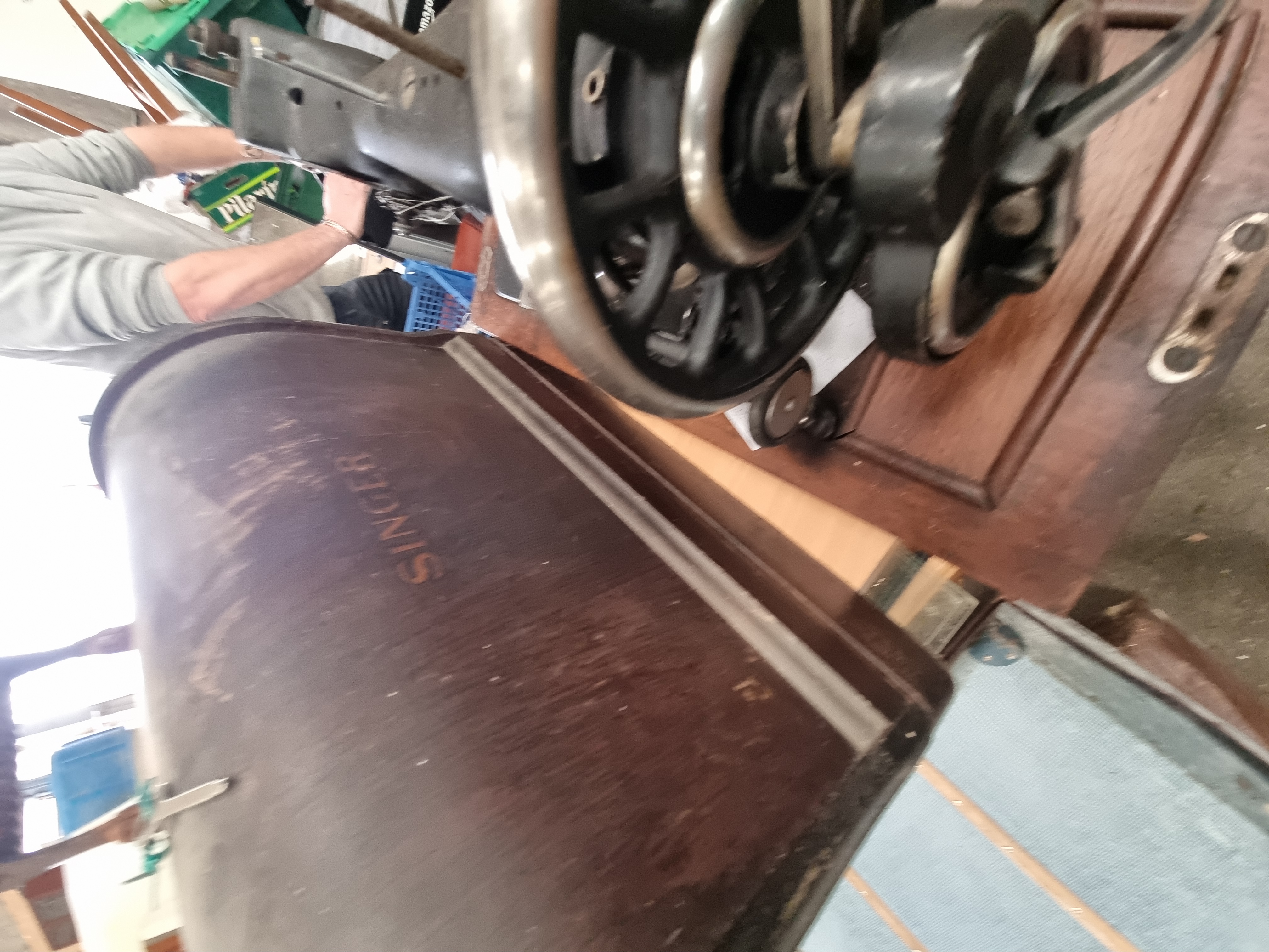 The wooden case shows significant scuffs, scratches, and finish wear consistent with age and use. The sewing machine body appears dusty with minor surface wear. The mechanical functionality has not been tested.