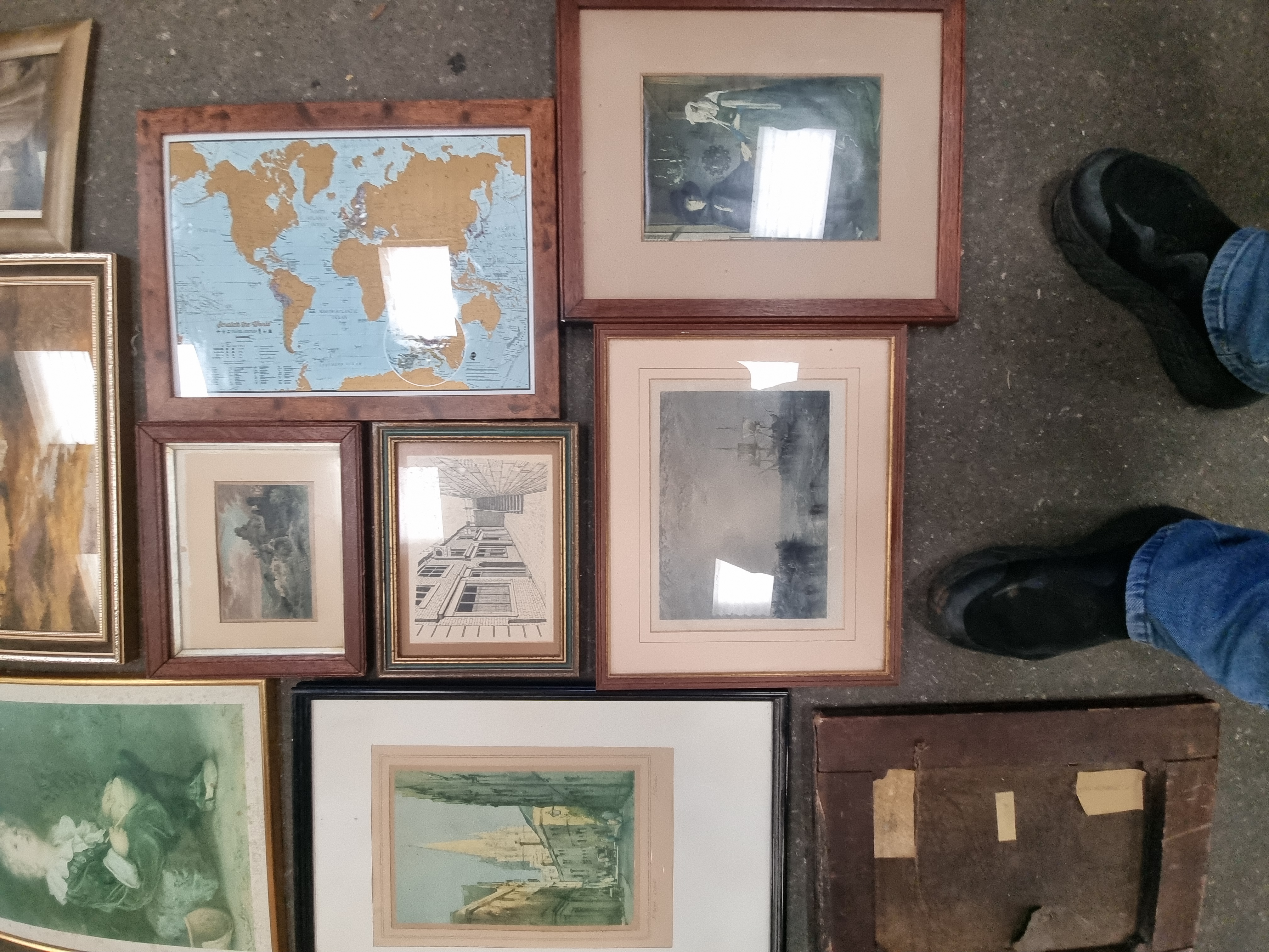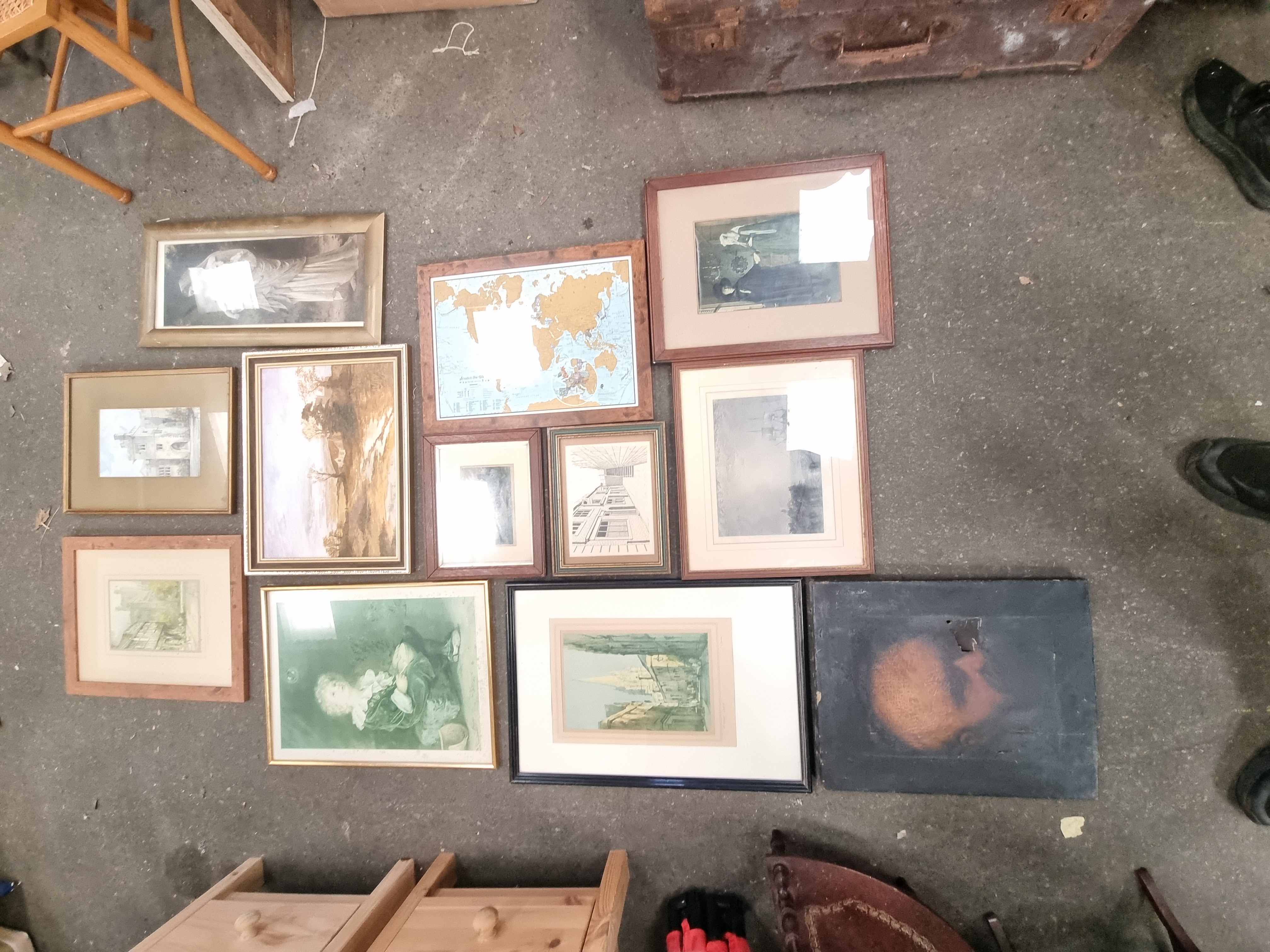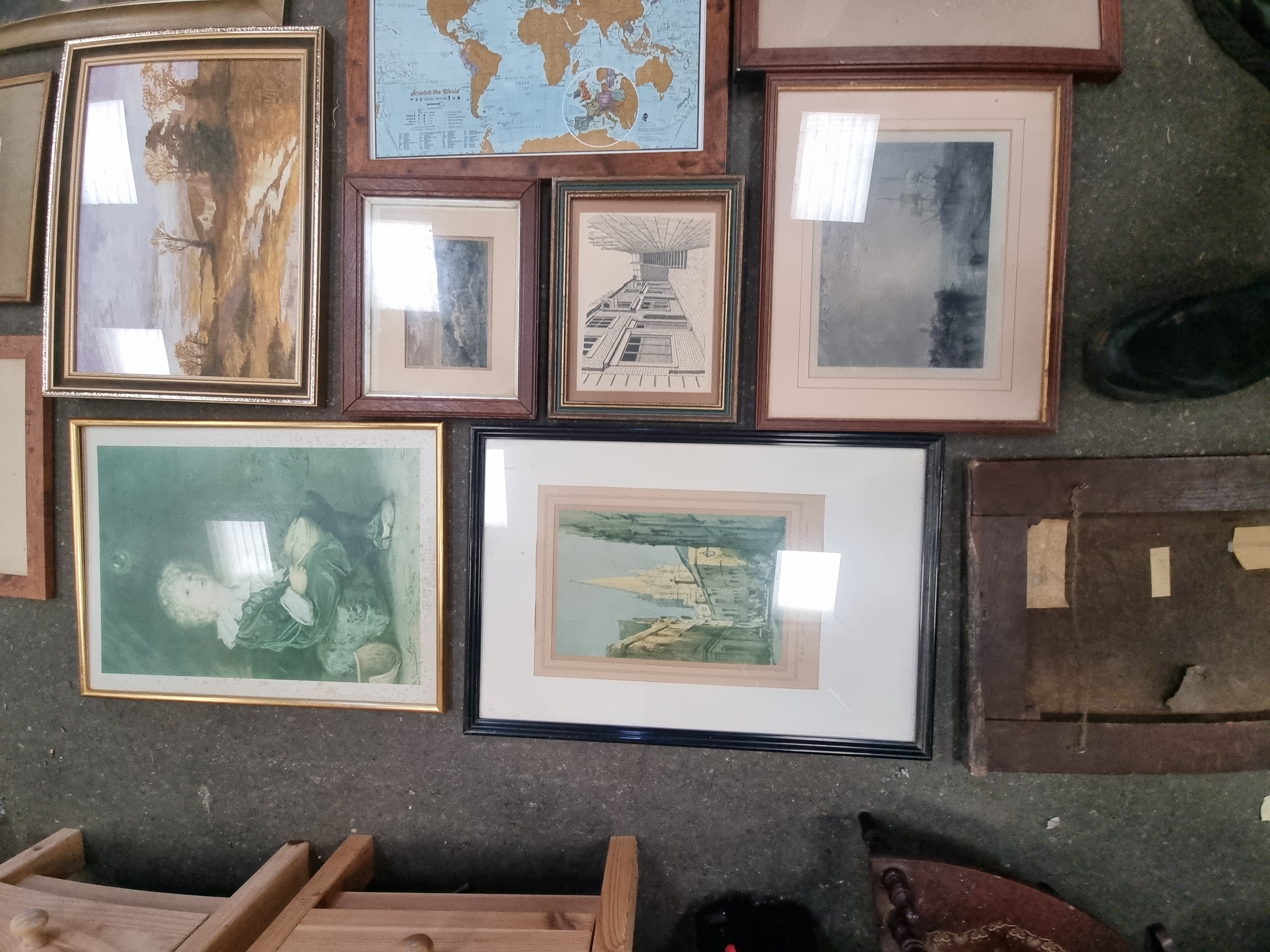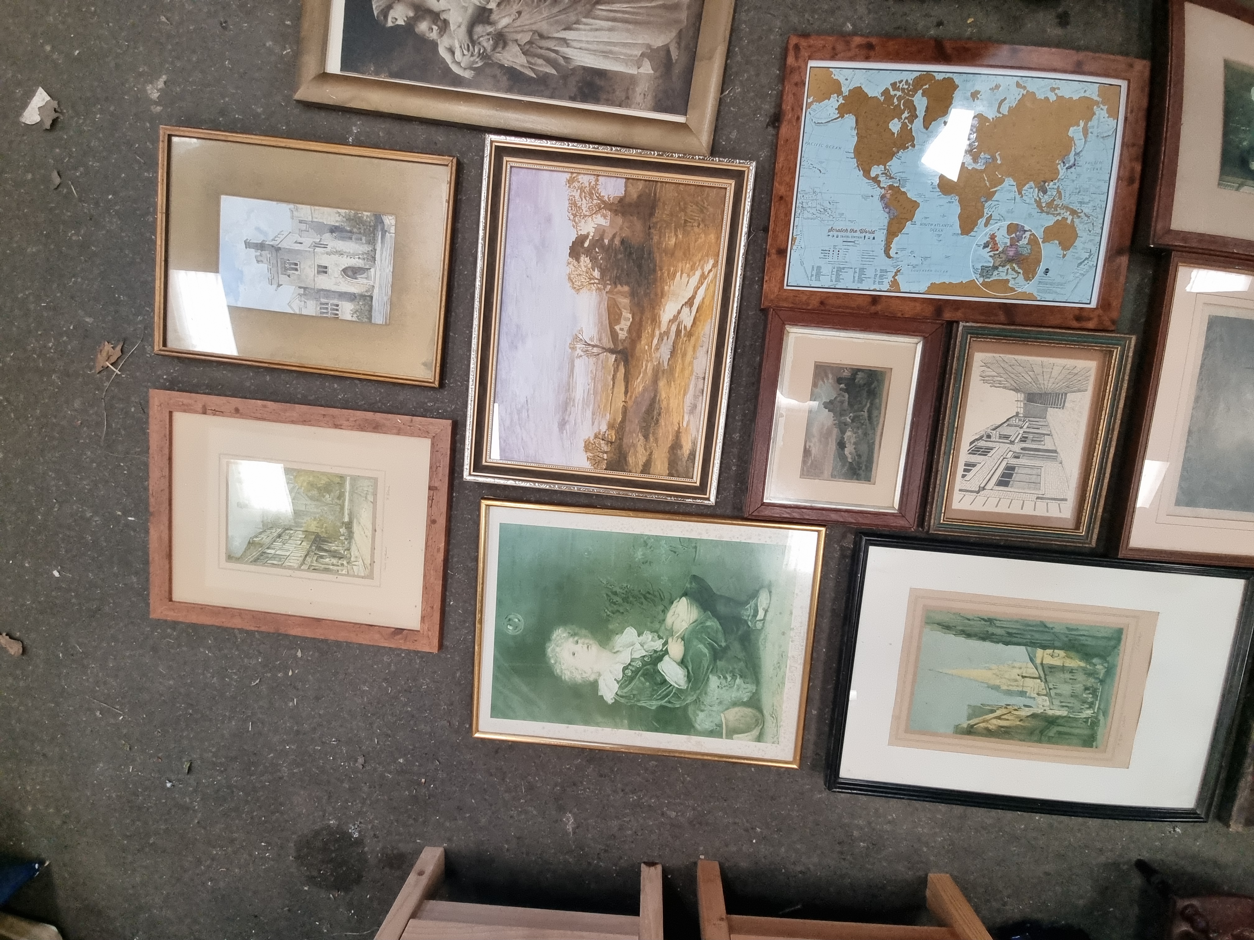 A collection of multiple framed and unframed artworks featuring a diverse range of subjects and mediums. The group includes a reproduction print of John Everett Millais’ Bubbles, a Scratch the World travel map, and a Madonna and Child. Also present are several watercolours and prints depicting rural and urban landscapes, cityscapes, marine scenes, and architectural drawings. One notable piece is an unframed oil painting on a dark rectangular wooden panel depicting a profile portrait; the verso of this panel retains fragments of aged paper labels. The works are housed in various frames, including gilt-finished wood, simple wooden mouldings, and modern black frames.