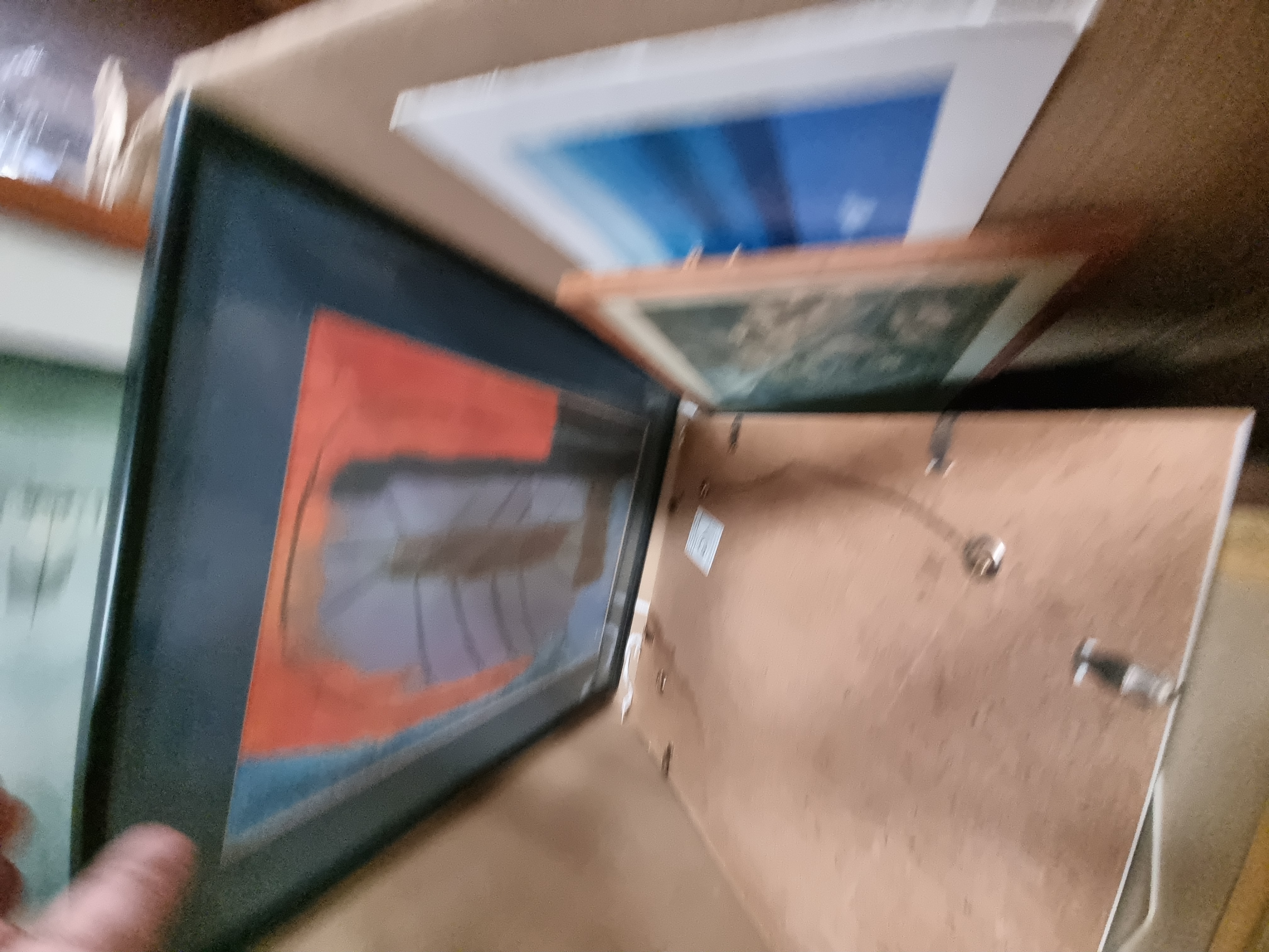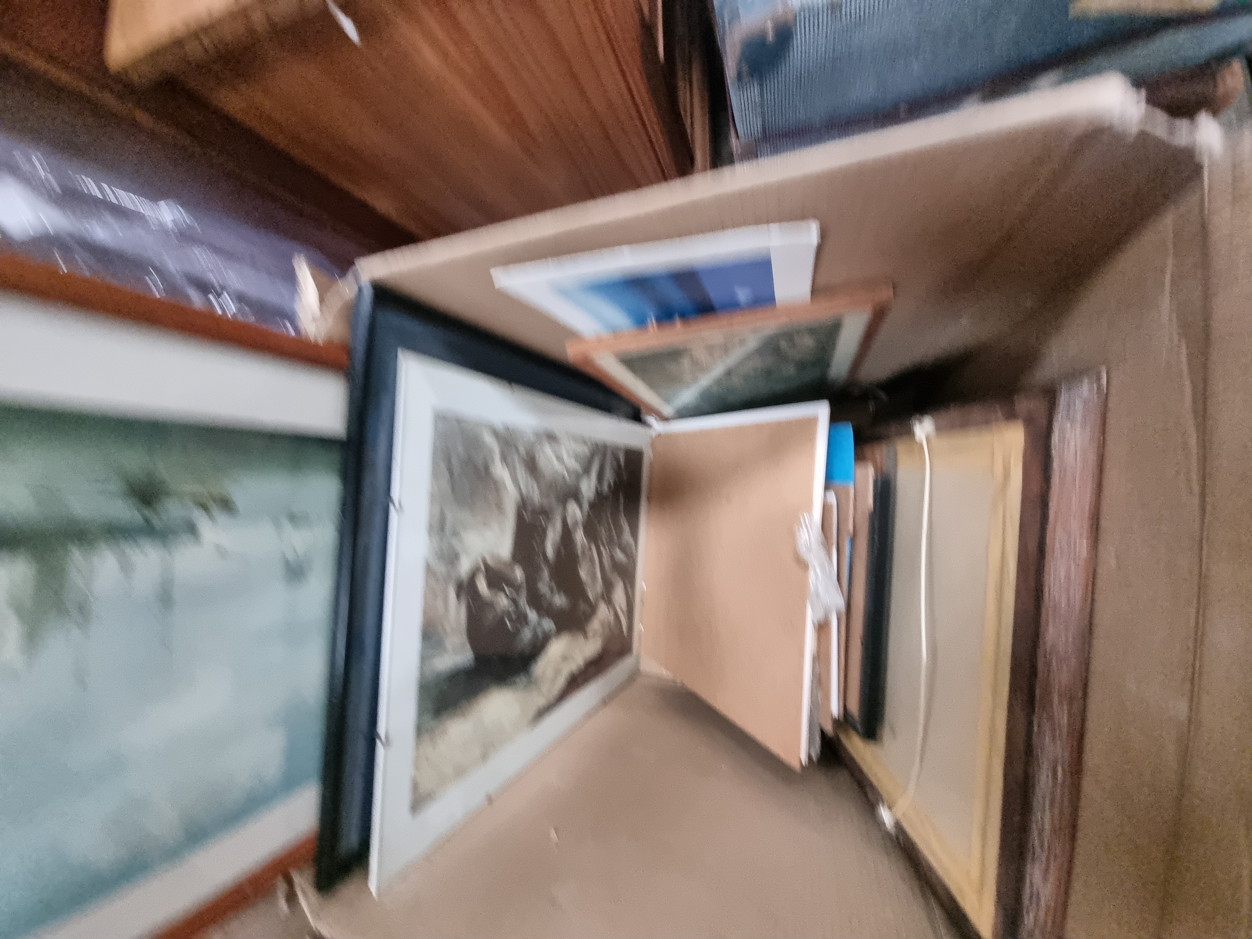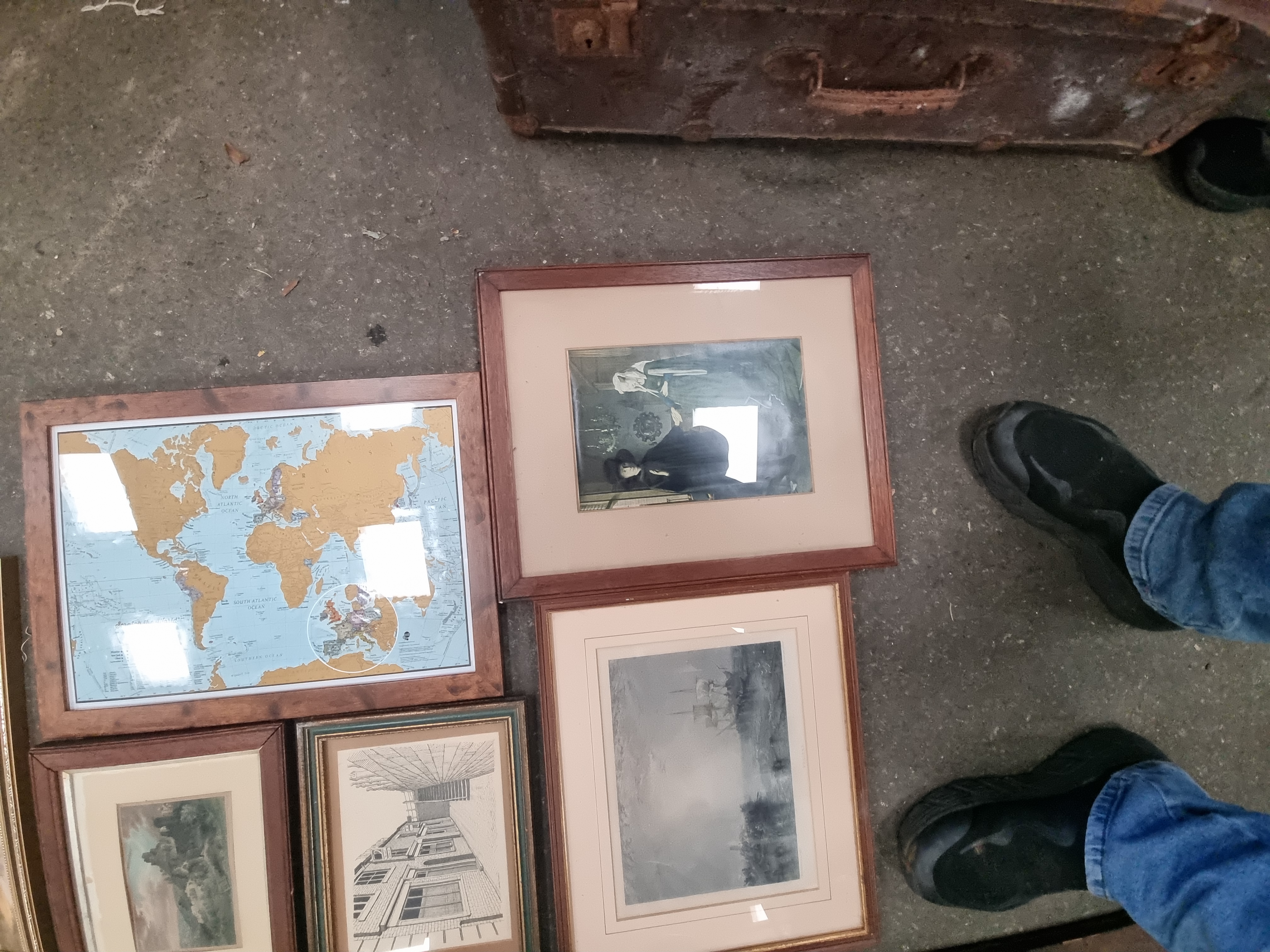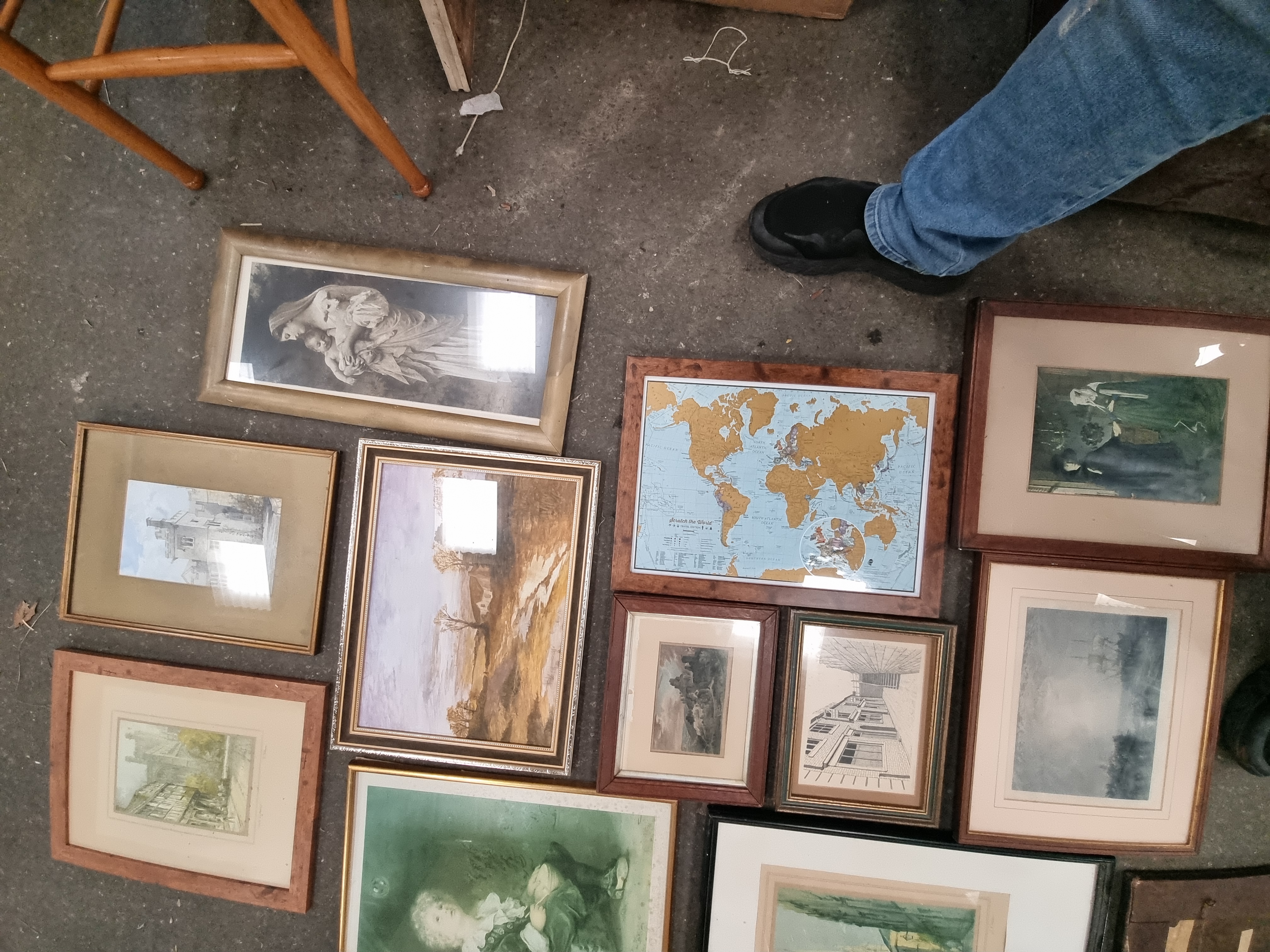 A collection of multiple framed and unframed artworks featuring a diverse range of subjects and mediums. The group includes a reproduction print of John Everett Millais’ Bubbles, a Scratch the World travel map, and a Madonna and Child. Also present are several watercolours and prints depicting rural and urban landscapes, cityscapes, marine scenes, and architectural drawings. One notable piece is an unframed oil painting on a dark rectangular wooden panel depicting a profile portrait; the verso of this panel retains fragments of aged paper labels. The works are housed in various frames, including gilt-finished wood, simple wooden mouldings, and modern black frames.