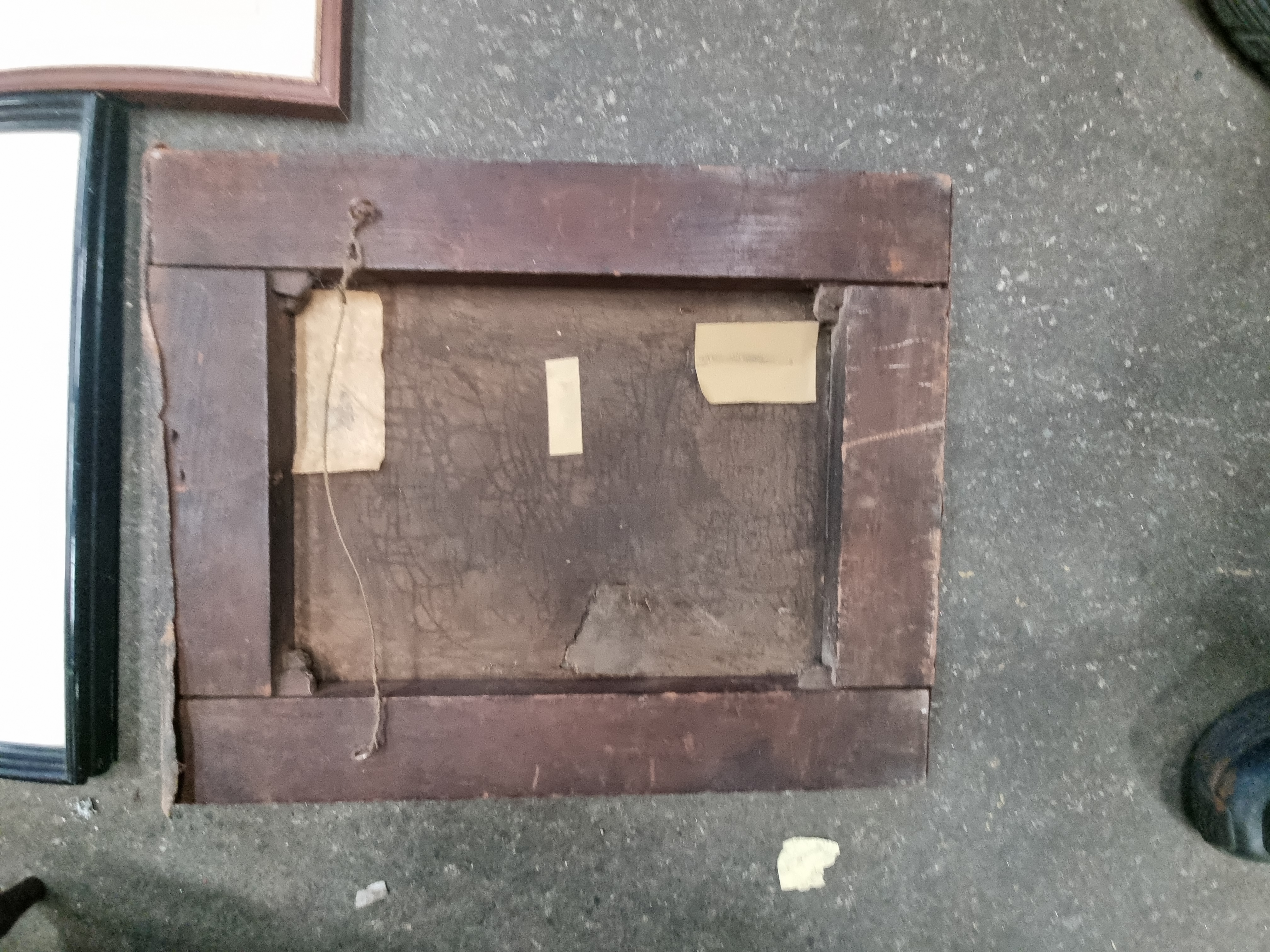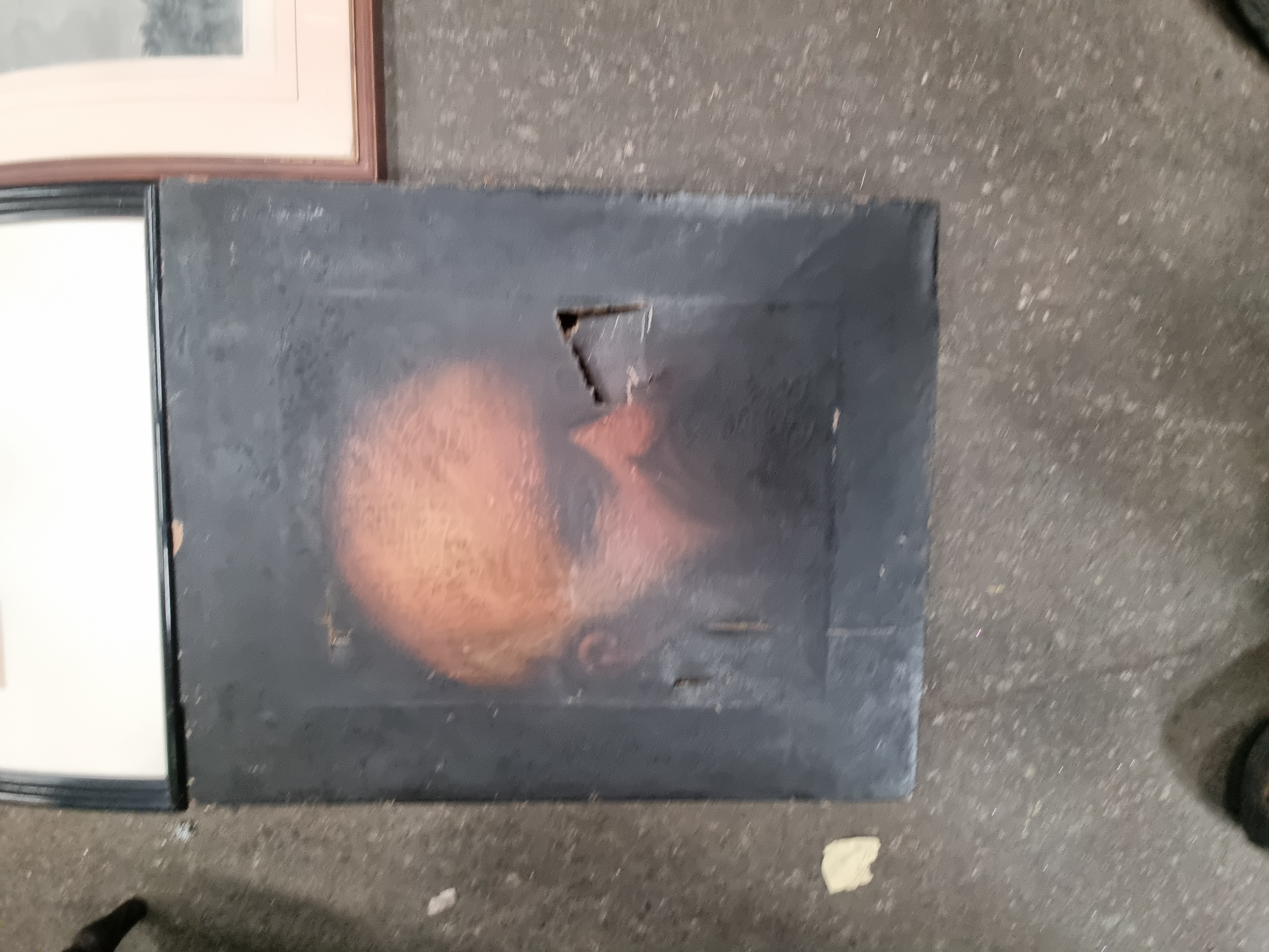 Condition across the collection varies from good to heavily damaged. The unframed oil portrait on panel exhibits significant physical damage, including punctures and tears to the support. Several frames show surface wear, scuffing, and minor losses to the gilt or wood finish. Some paper-based works show signs of light foxing and age-related discolouration.