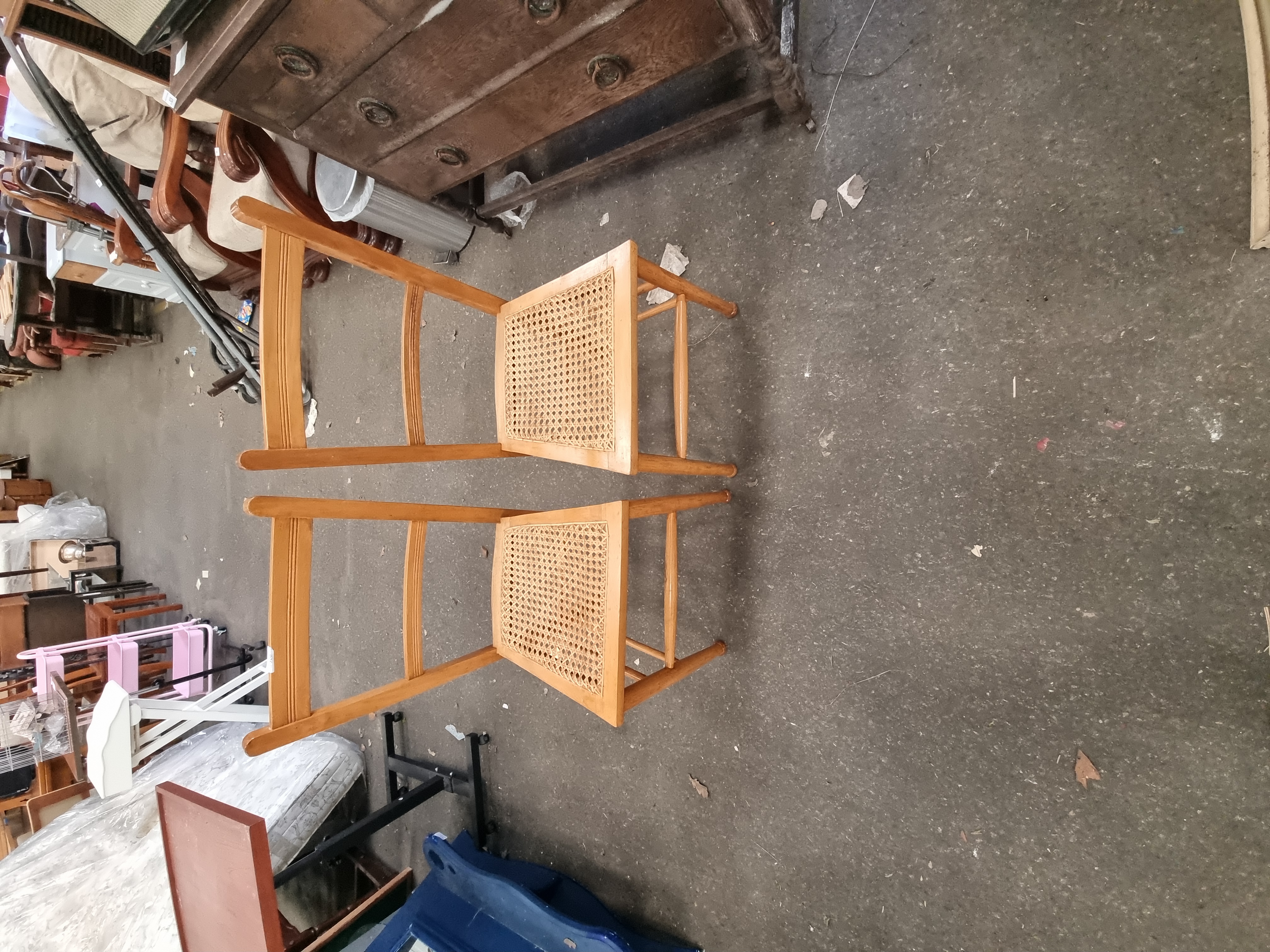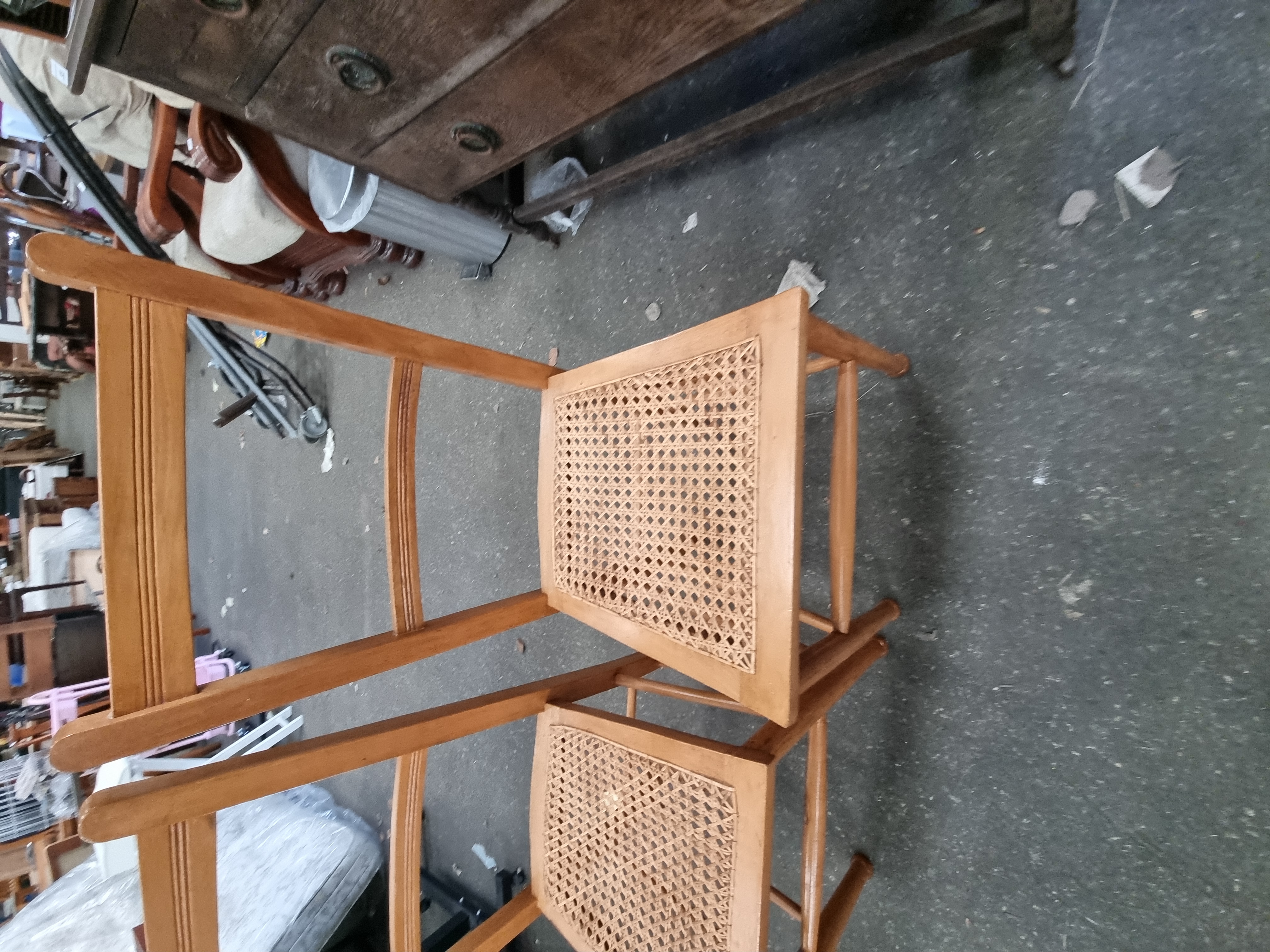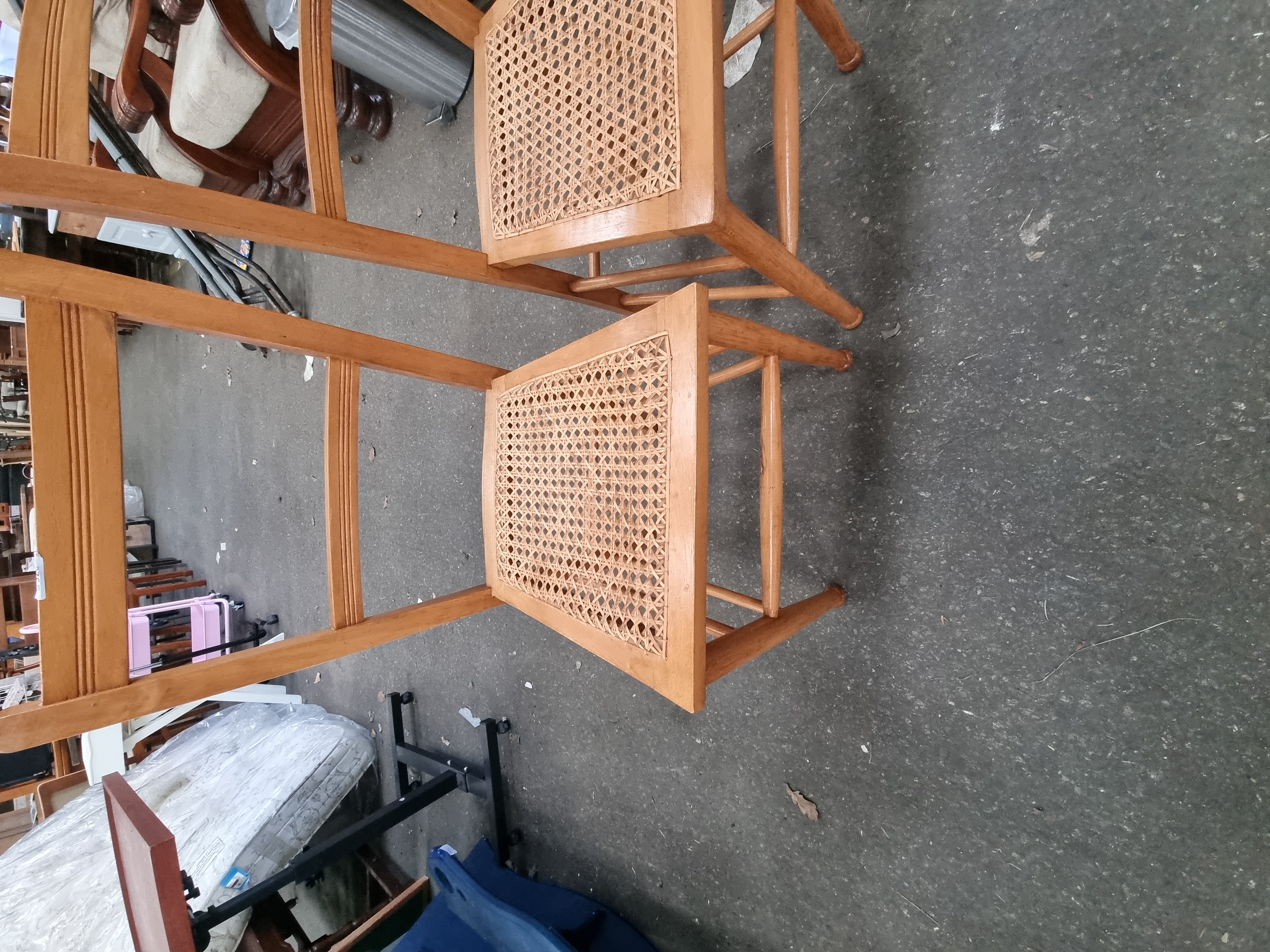 The chairs are in good vintage condition. The woven cane seats remain taut and intact on both examples, with no obvious breaks or sagging. The wooden frames show minor surface wear, including light scuffs and small abrasions consistent with age and domestic use, particularly around the feet and stretchers.