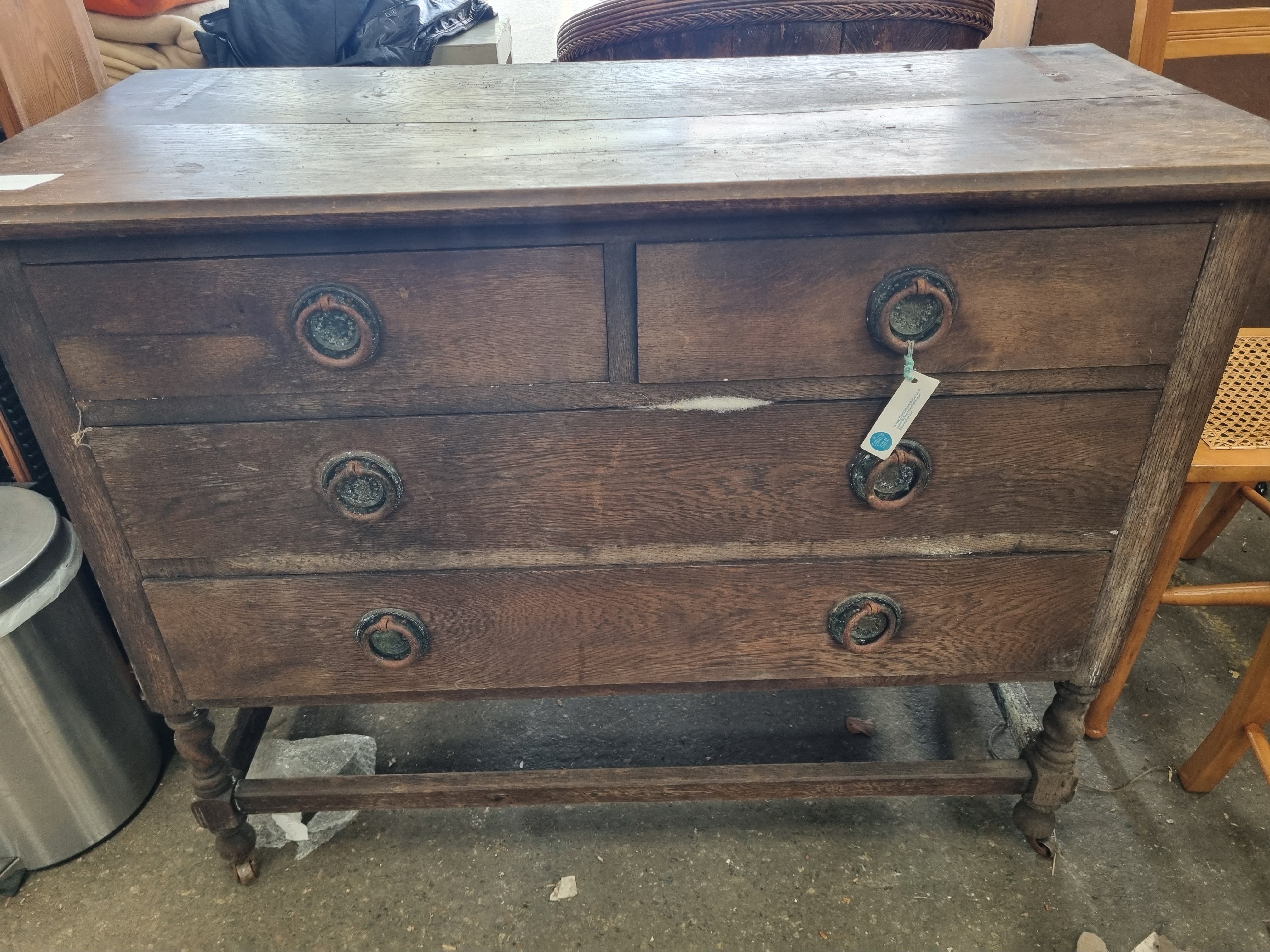 An oak chest of drawers in the Jacobean revival style, dating from the early to mid-20th century. The chest features a two-over-two configuration consisting of two short drawers over two long graduated drawers. The drawer fronts are fitted with circular metal drop-ring handles on round backplates. The piece is raised on turned legs joined by a square-section box stretcher, sitting on small metal castors. The primary timber is oak with a dark finish. No maker marks or manufacturer attributions are visible. The item bears a modern auction house label for Liskeard Auction Rooms (Lot 923) and a small handwritten paper tag.