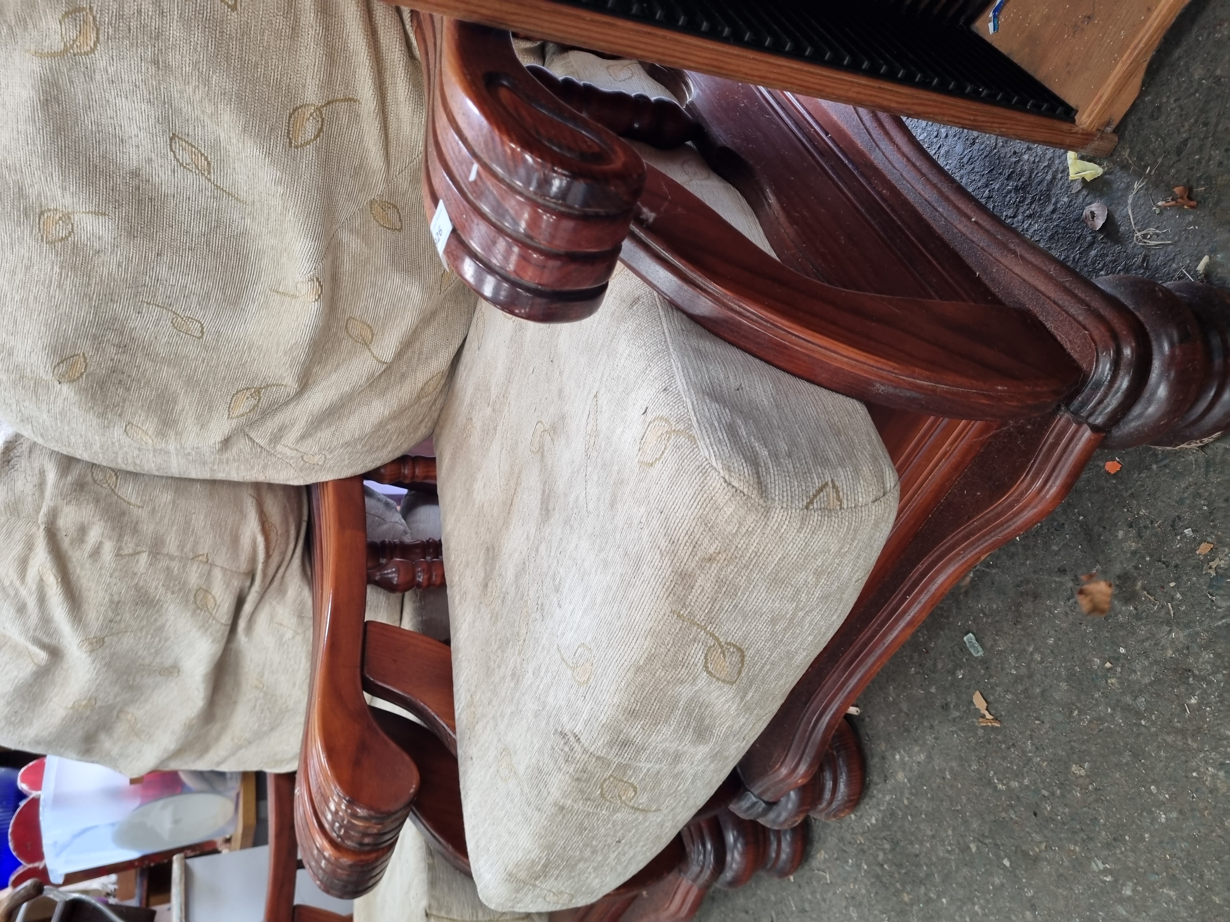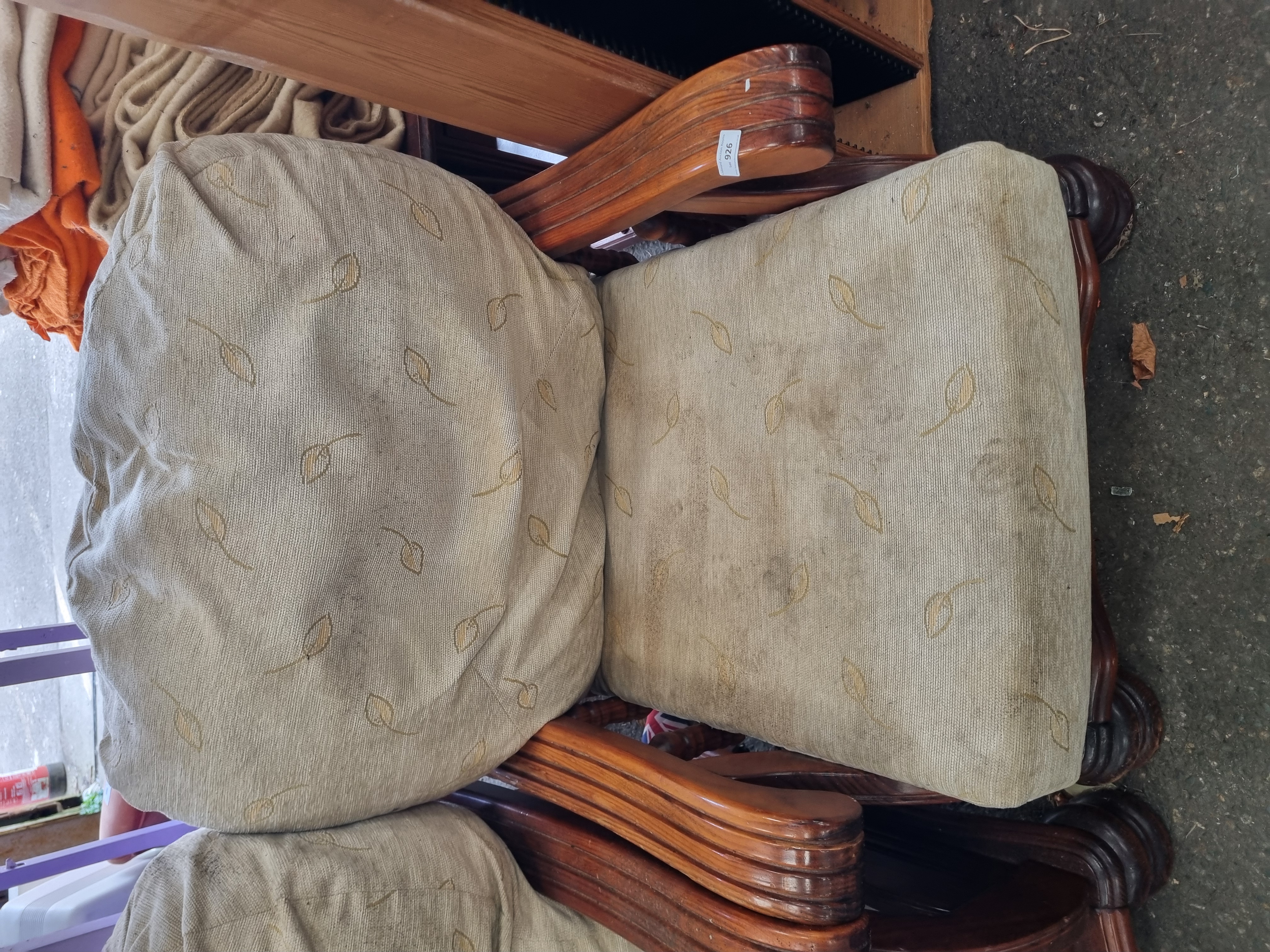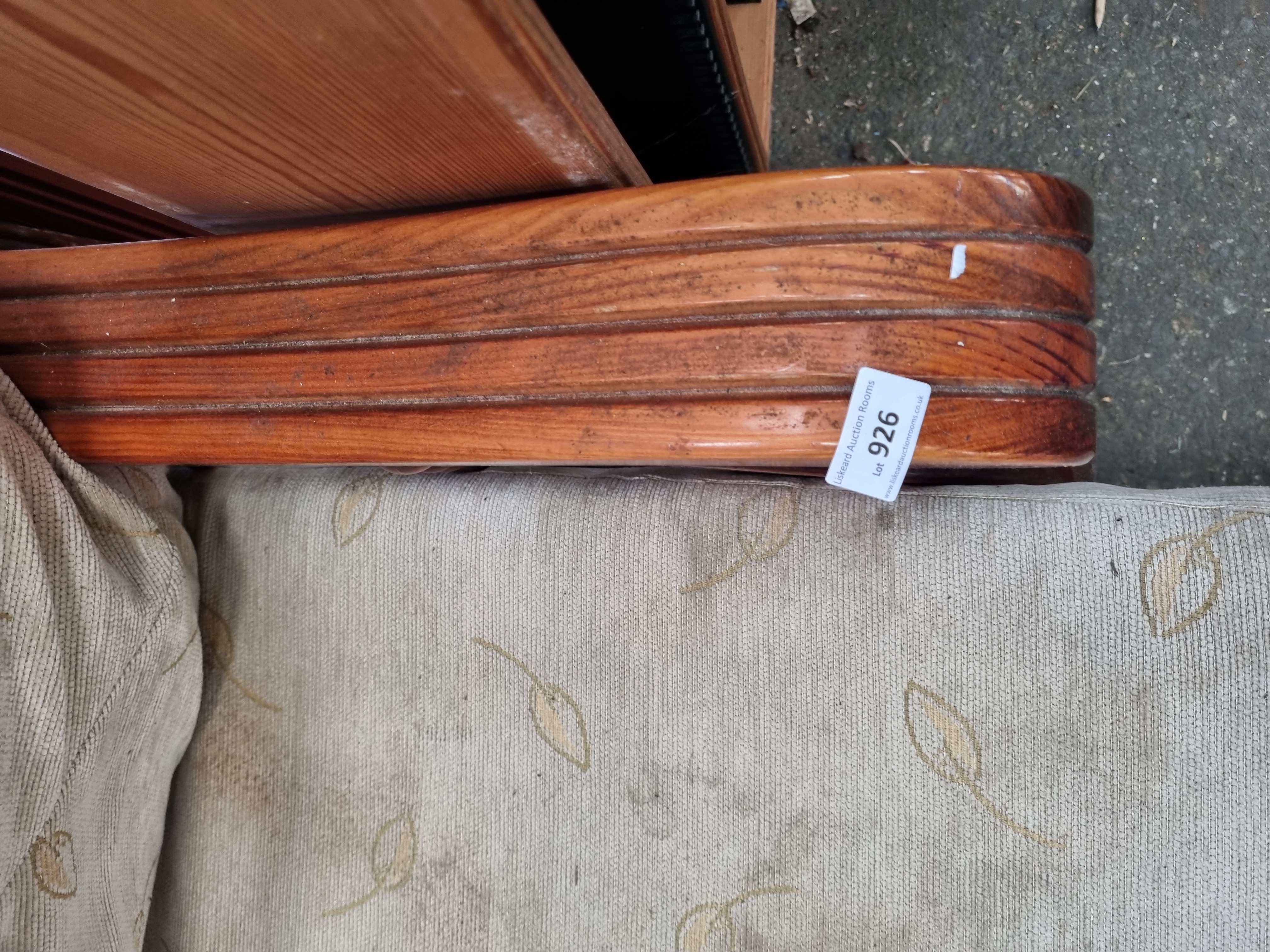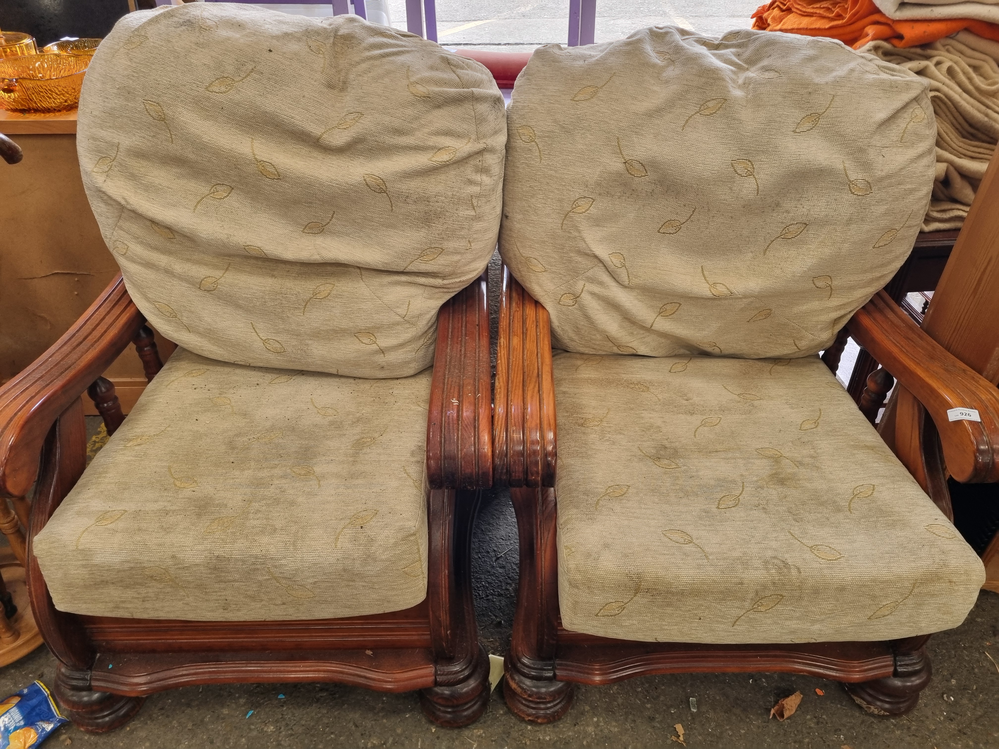 A pair of mid-20th-century revival-style armchairs featuring substantial dark-stained wooden frames. The design includes broad, out-swept armrests with deep horizontal reeding, supported by short turned spindles. The chairs are constructed with a decoratively shaped front apron and are raised on heavy, gadrooned bulbous feet. The seating comprises loose seat and backrest cushions upholstered in a light-coloured, ribbed textile with a repeated small-scale leaf pattern. The frames appear to be of solid wood construction with traditional turned elements. No manufacturer’s marks are present; a white adhesive label from Liskeard Auction Rooms (Lot 926) is attached to the armrest of one chair.