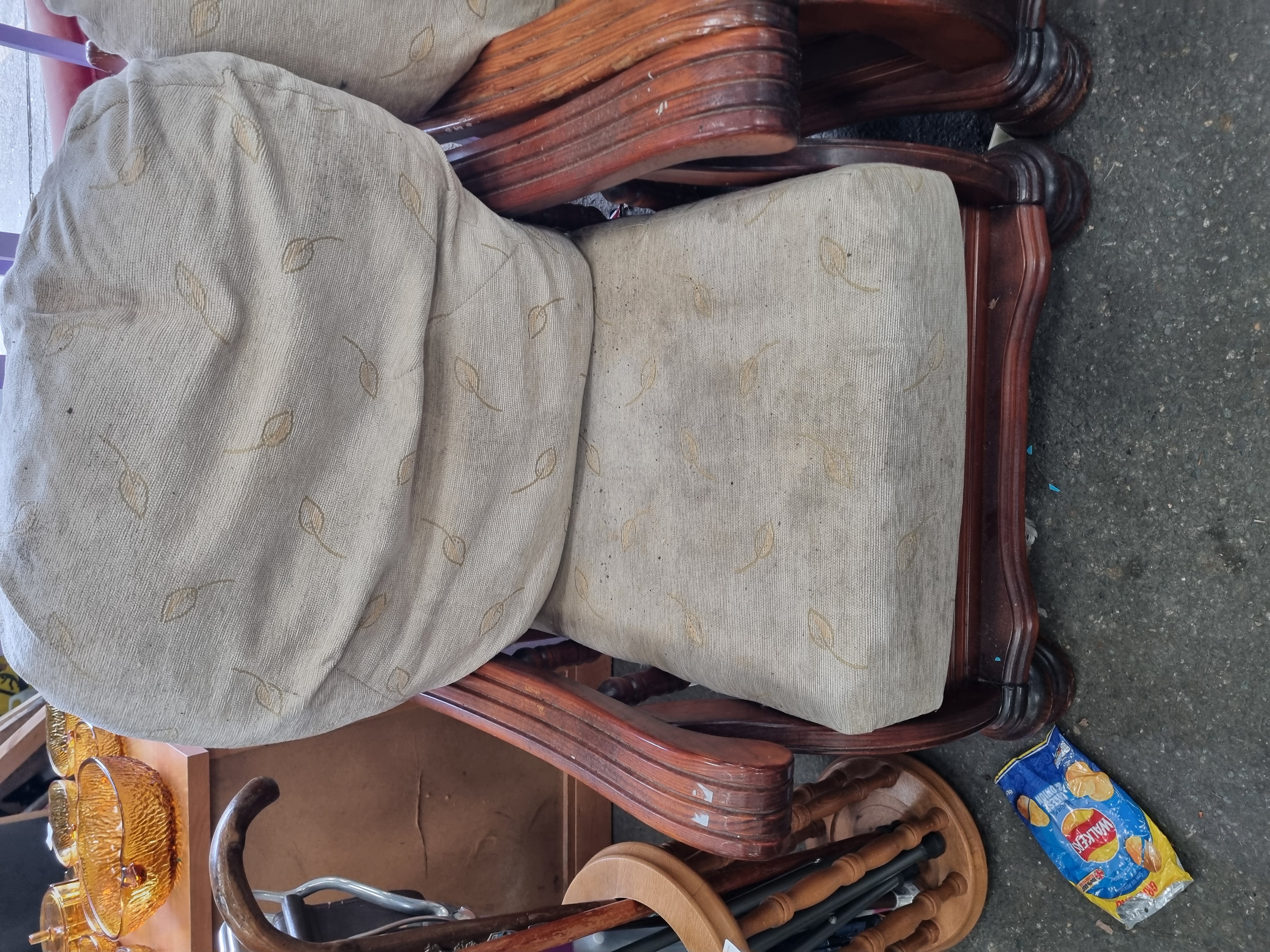 The wooden frames exhibit surface wear, including scuffs, scratches, and minor finish loss consistent with age and domestic use, particularly on the armrests and feet. The upholstery is in poor condition, being heavily soiled and stained across both the seat and back cushions. The cushion fillings have lost their original loft and shape. These items require professional cleaning or complete reupholstery.