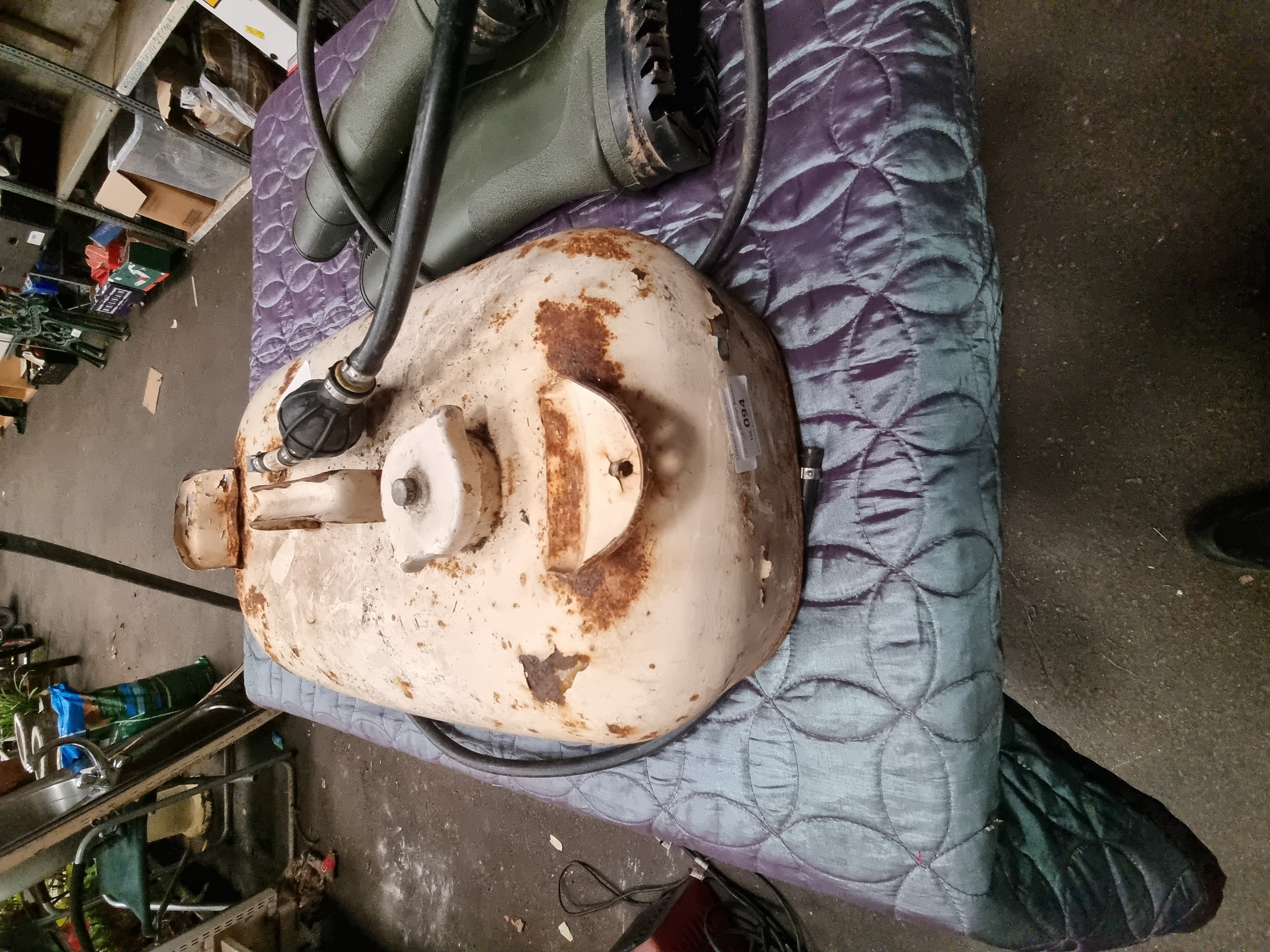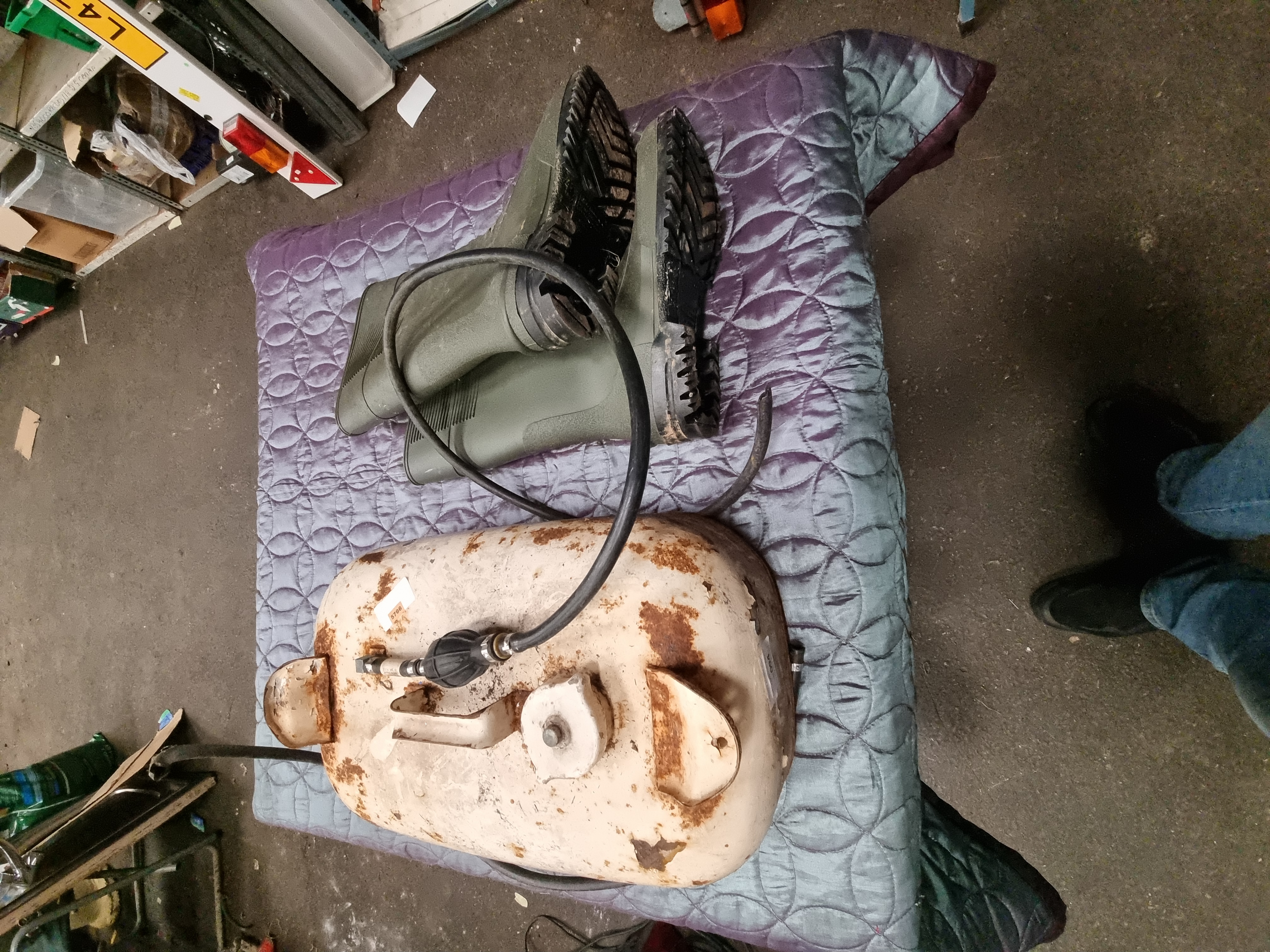 Lot 94: Three Items Comprising a Portable Metal Outboard Fuel Tank and a Pair of Wellington Boots